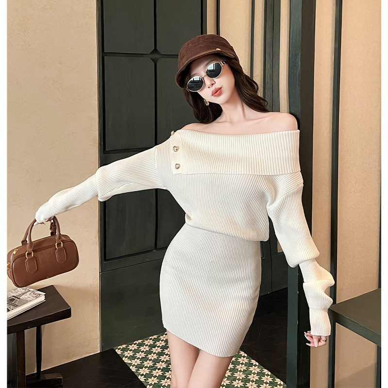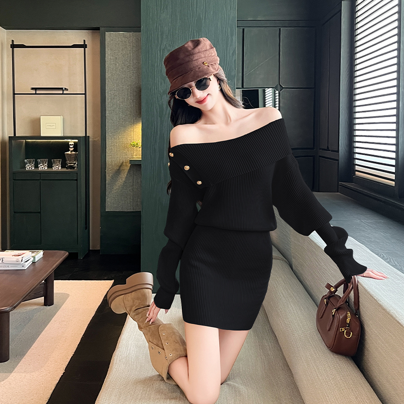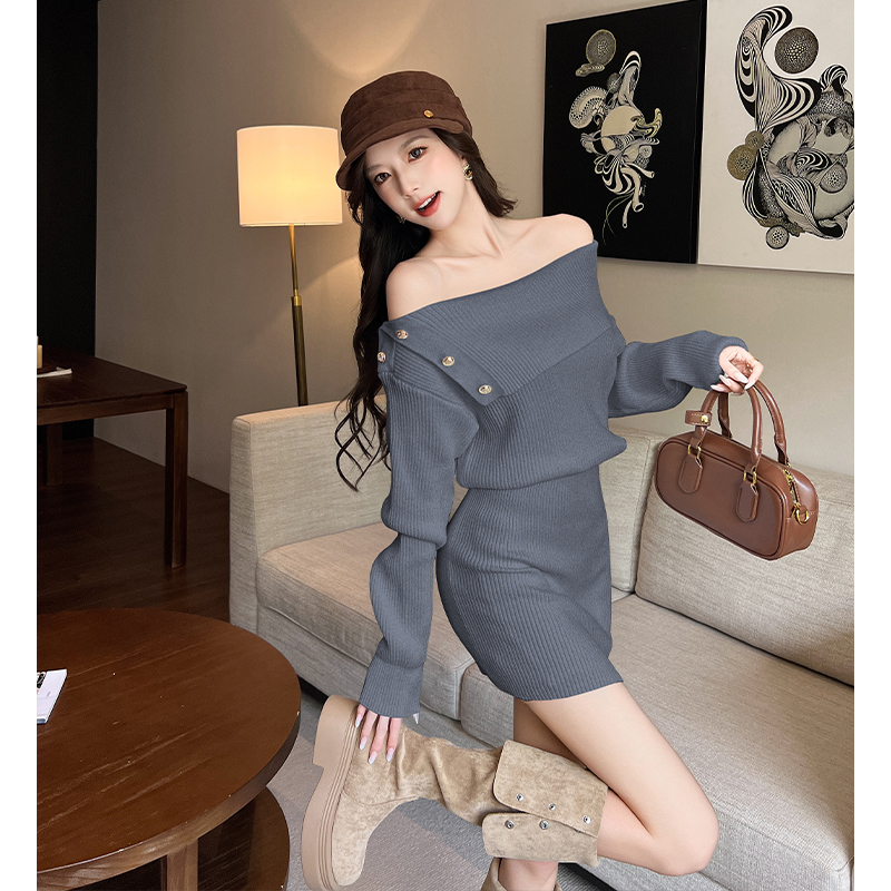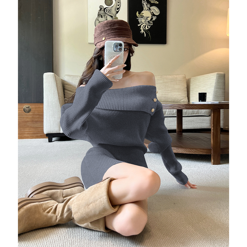 FA46688# 设计感长袖针织连衣裙女早秋新款法式包臀裙一字肩毛衣裙 服裝批發女裝批發服飾貨源