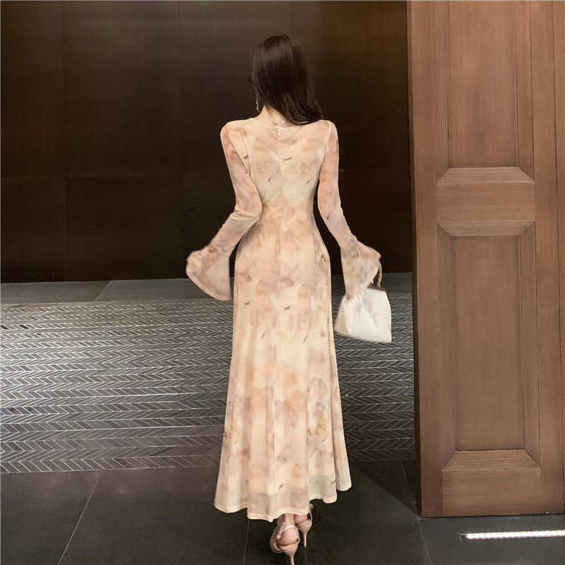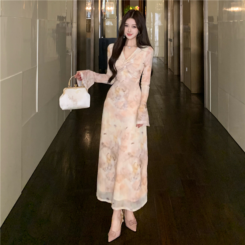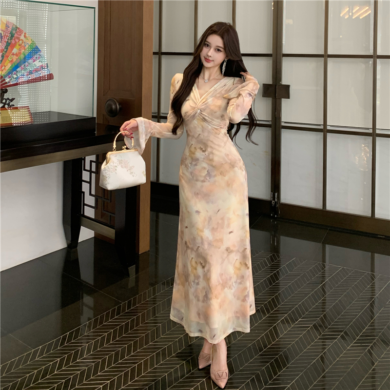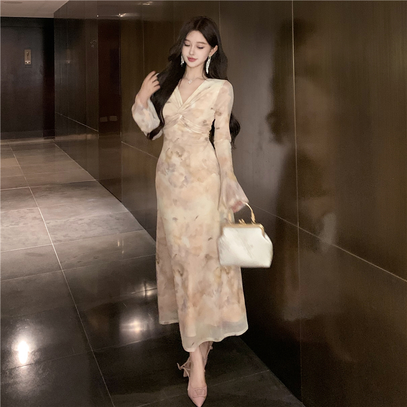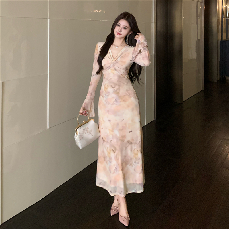 FA46696# 法式气质V领印花修身包臀裙喇叭袖A字显瘦百搭高腰连衣裙 服裝批發女裝批發服飾貨源