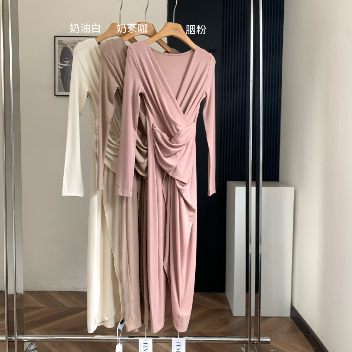 FA46768# ACHI大也池咖色v领仿羊绒褶皱连衣裙女气质收腰长裙长袖开叉裙子 服裝批發女裝批發服飾貨源
