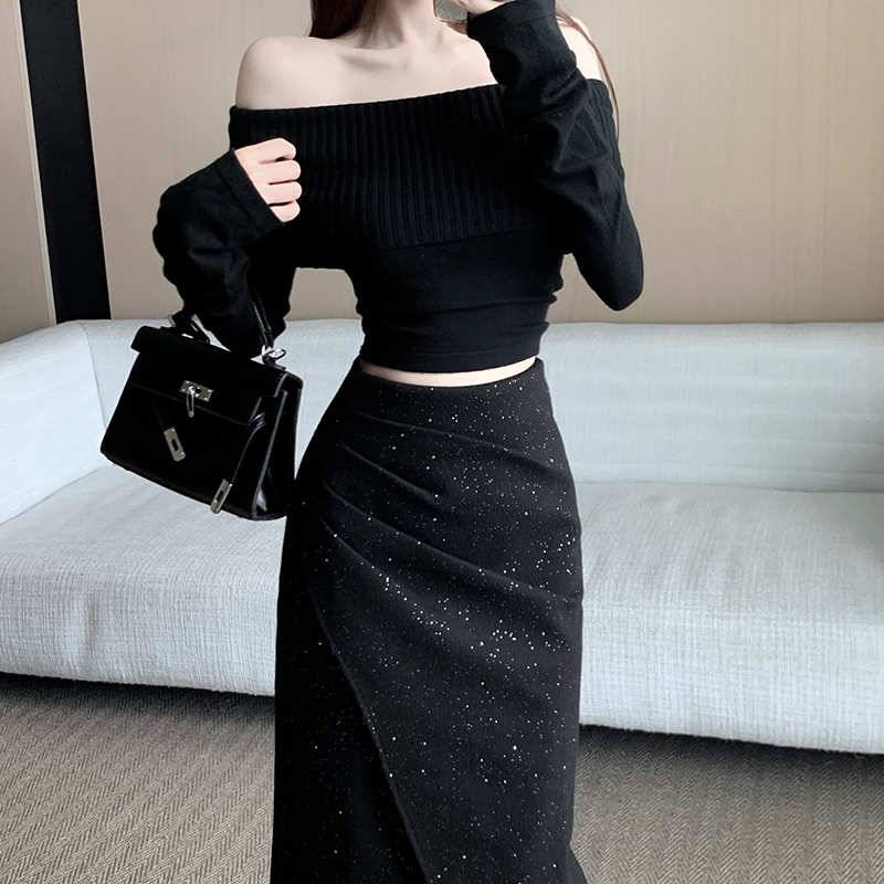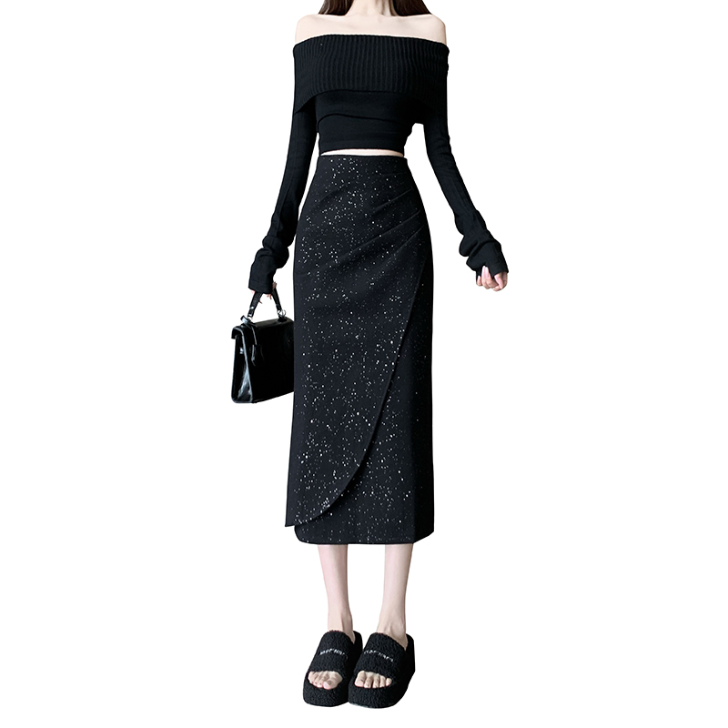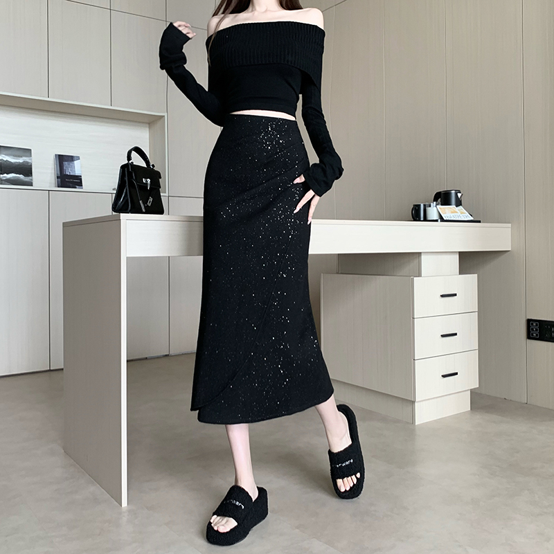 FA46775# 黑色亮片毛呢半身裙冬褶皱高腰显瘦显高修身中长款包臀直筒裙 服裝批發女裝批發服飾貨源