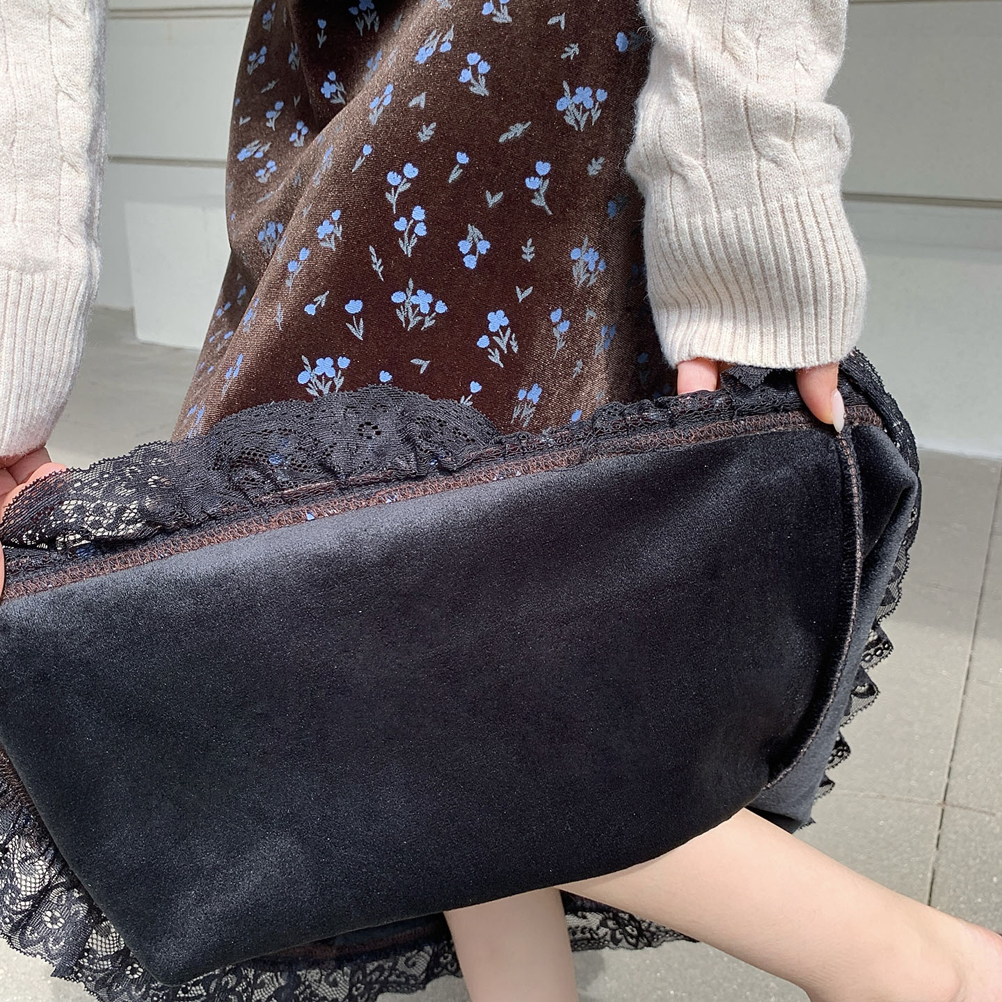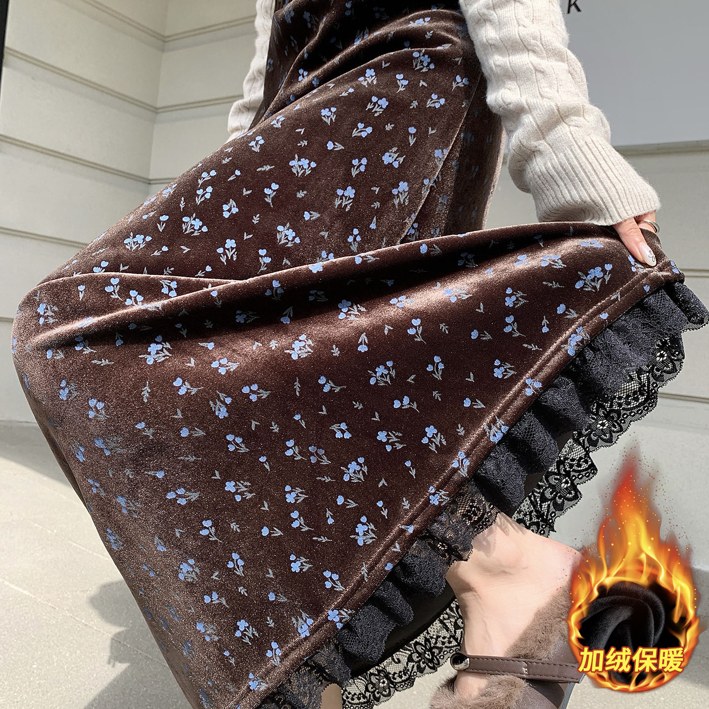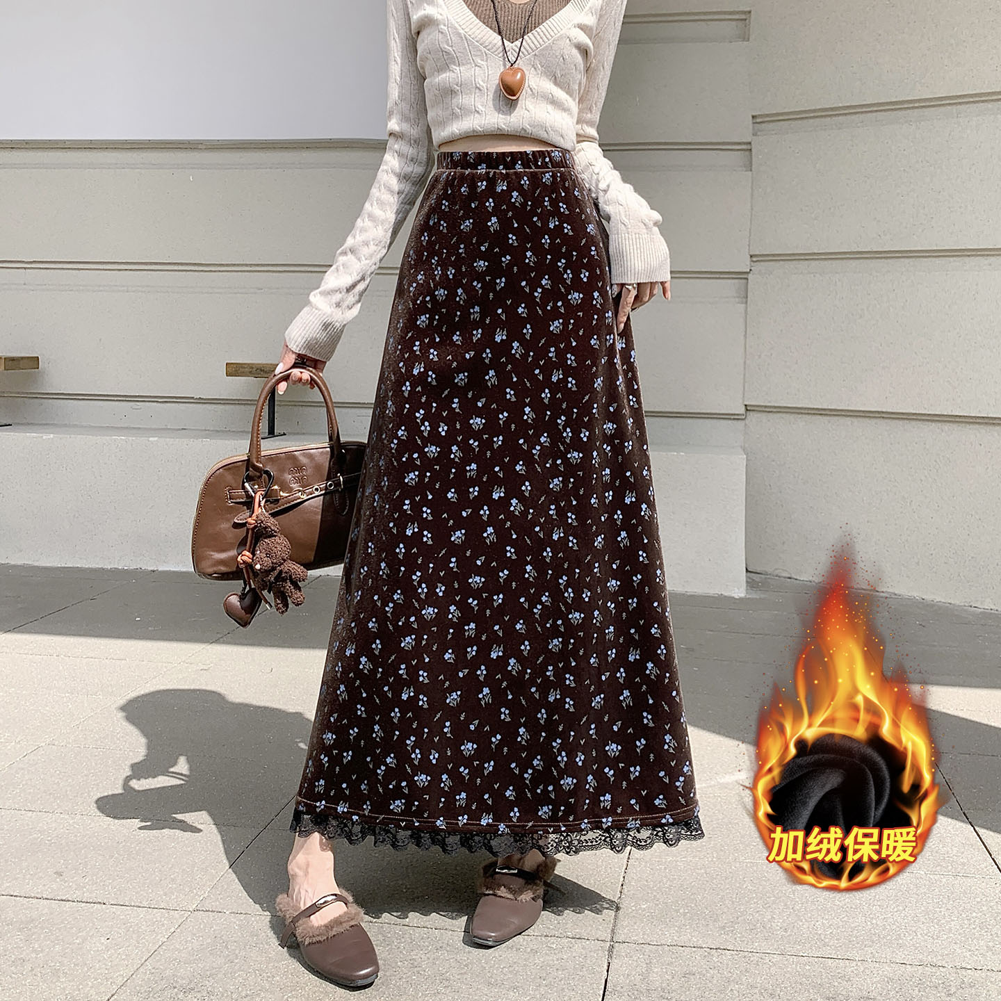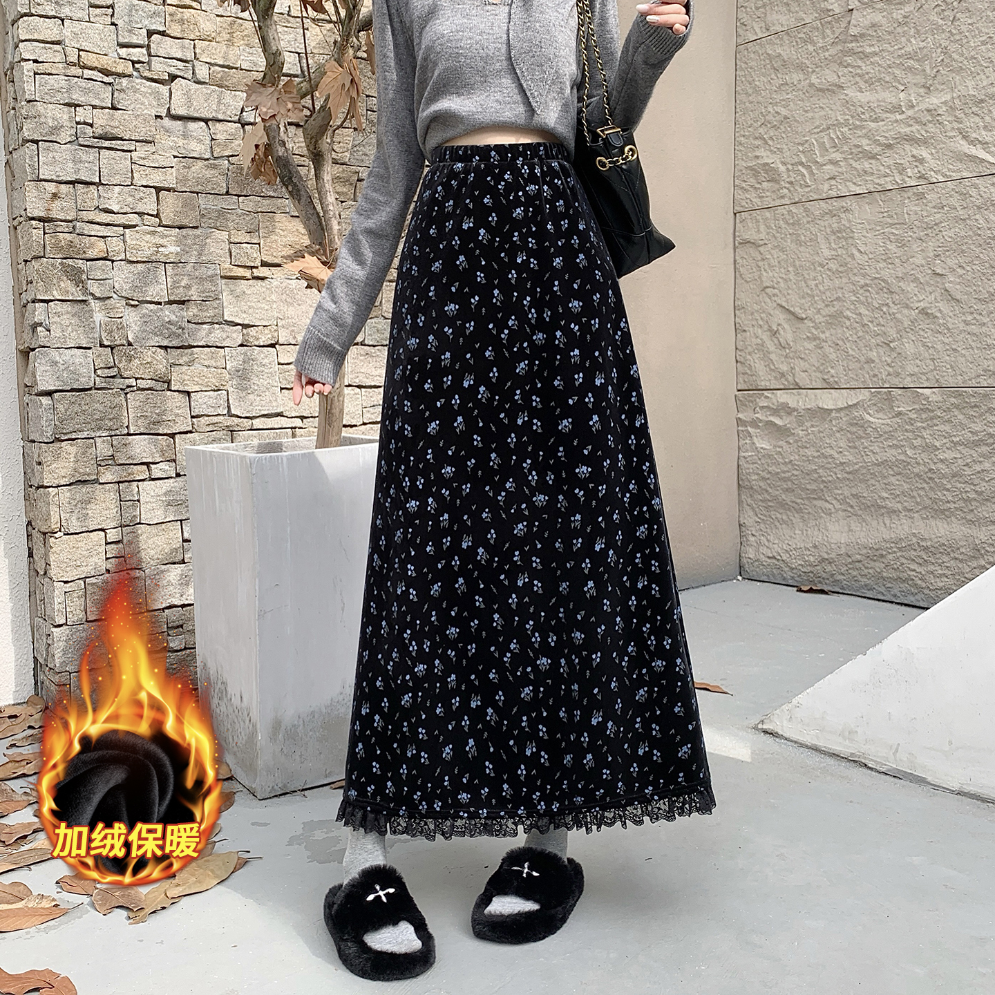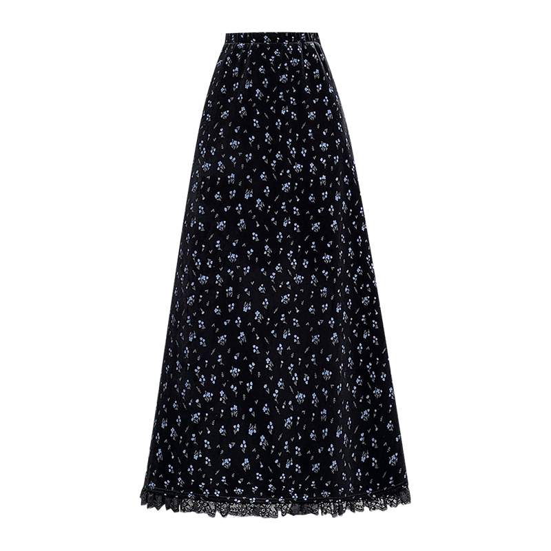 FA46790# 淑女风高级感小花丝绒半裙秋季新款韩版百搭休闲显瘦高腰伞裙 服裝批發女裝批發服飾貨源
