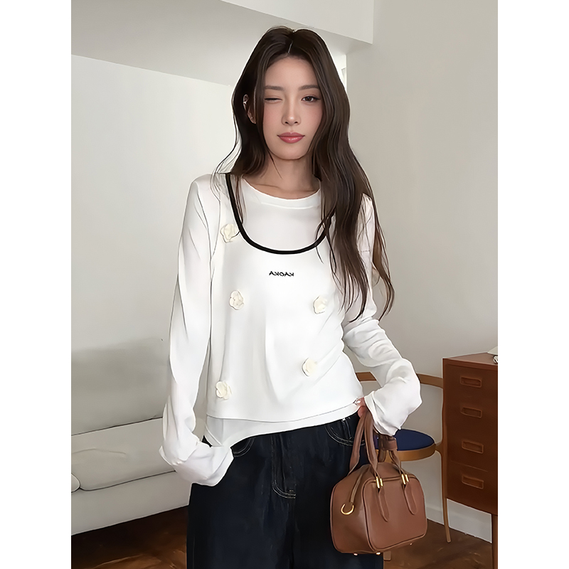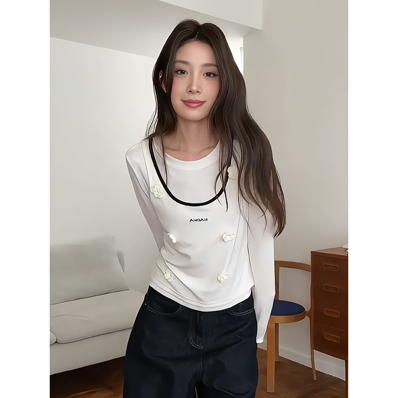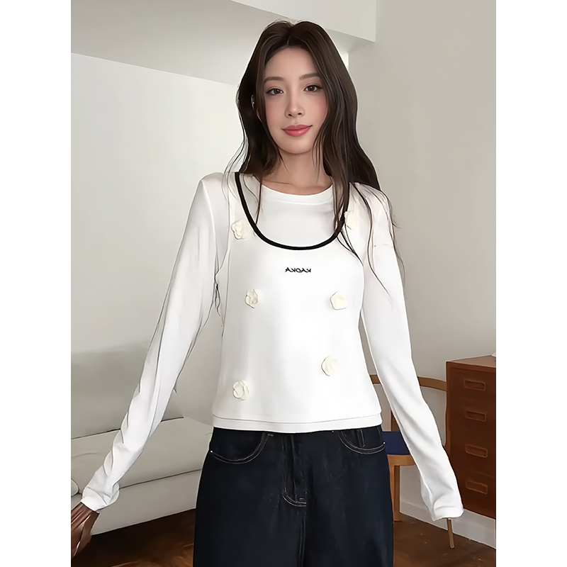 FA46912# 韩系米白色圆领吊带T恤女早秋季立体花朵字母上衣修身显瘦打底衫 服裝批發女裝批發服飾貨源