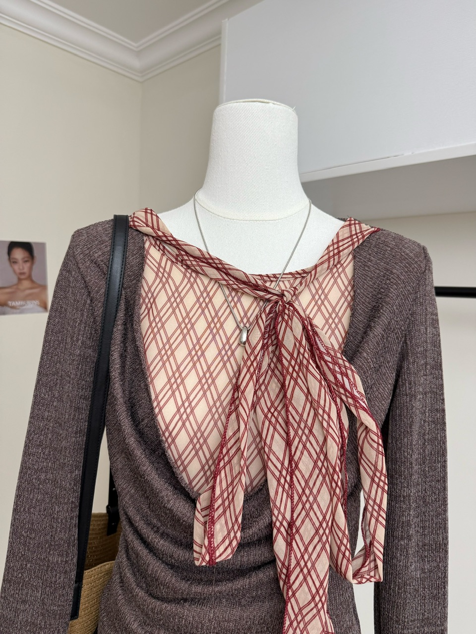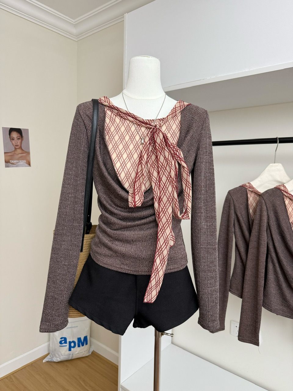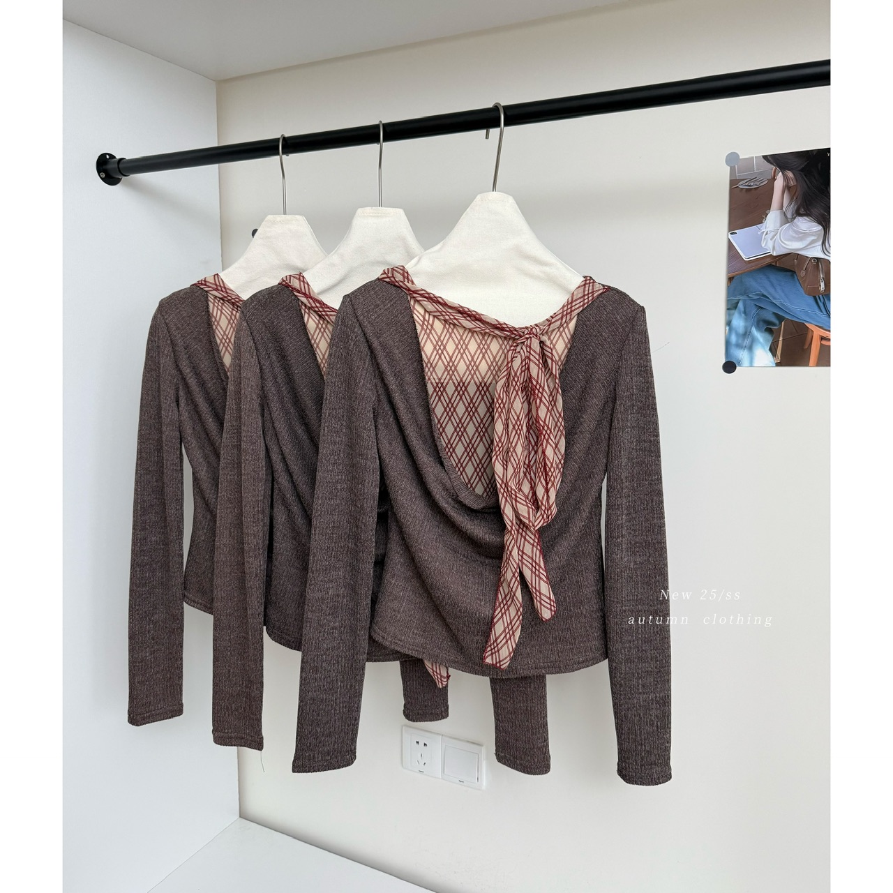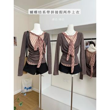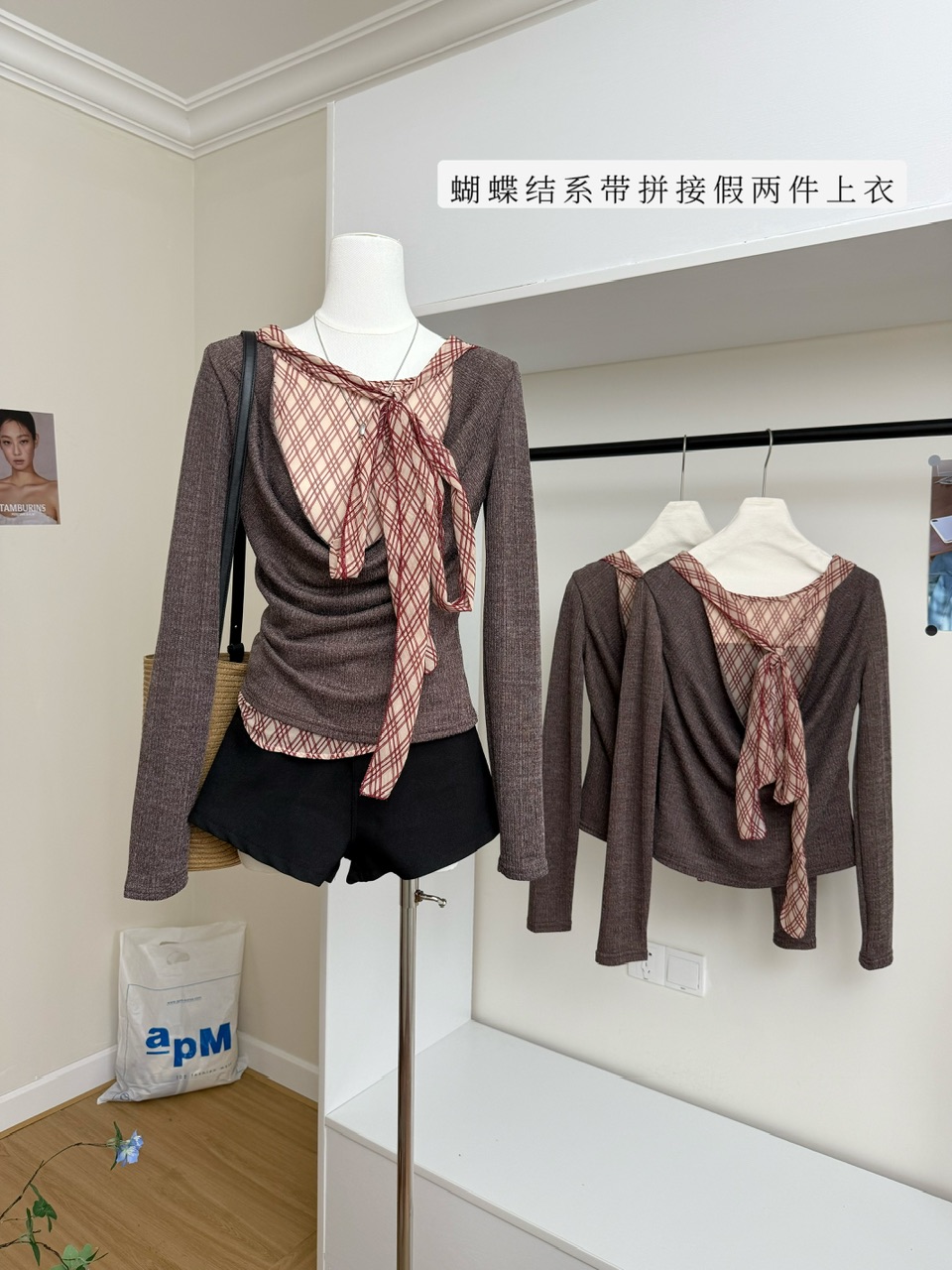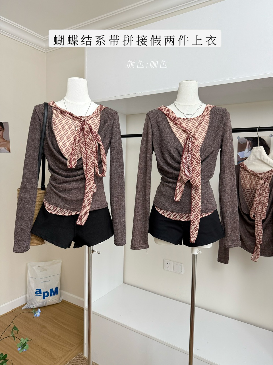 Home > 长袖T恤 > FA46984# 设计蝴蝶结系带咖色拼接假两件格纹荡领长袖上衣T恤女 服裝批發女裝批發服飾貨源