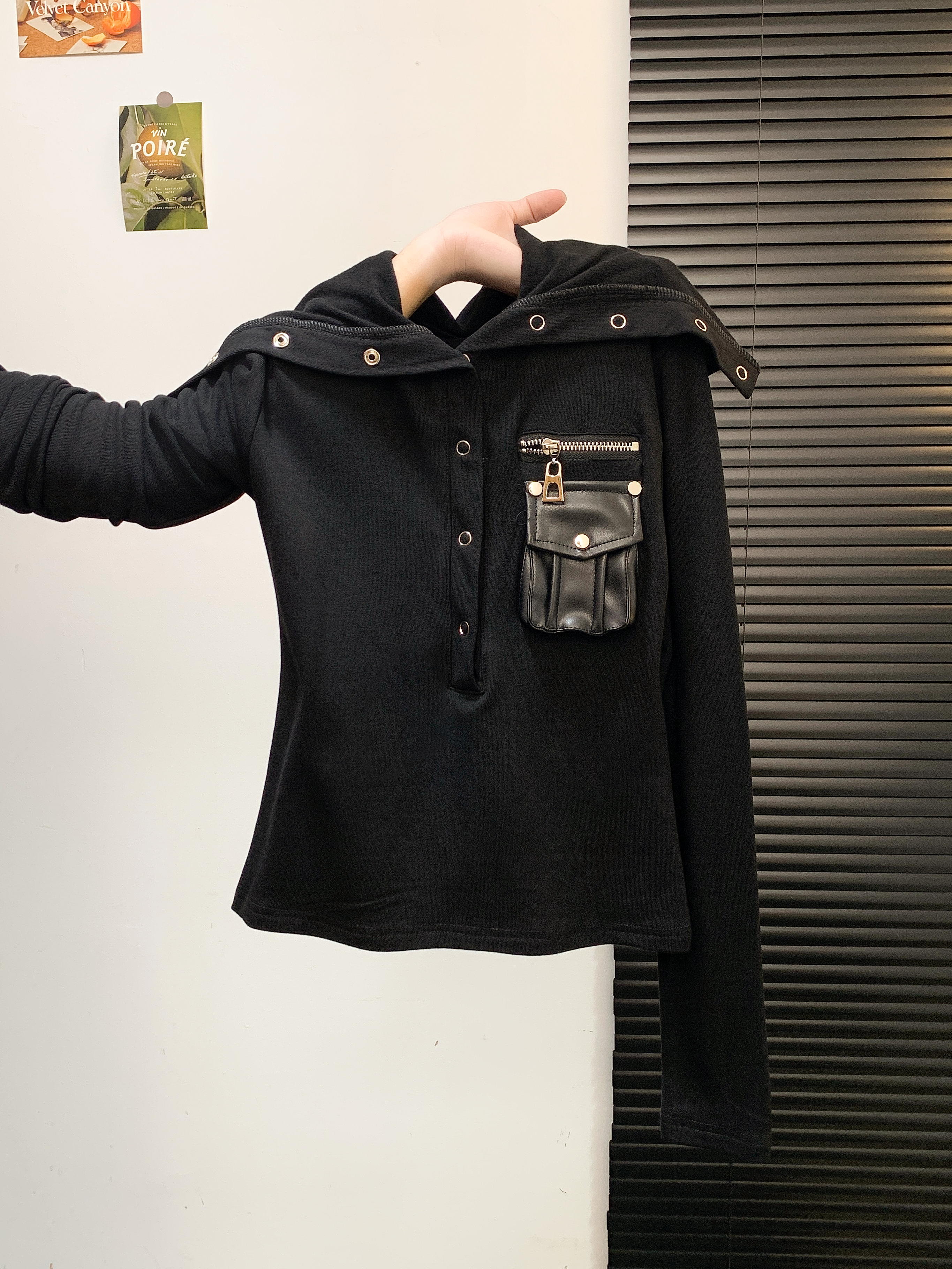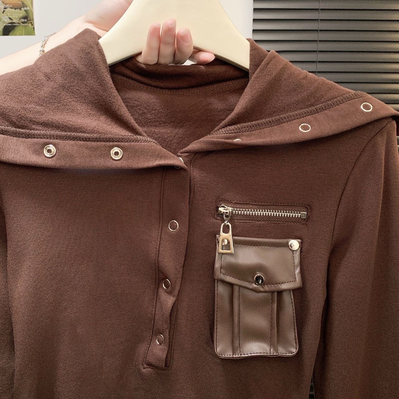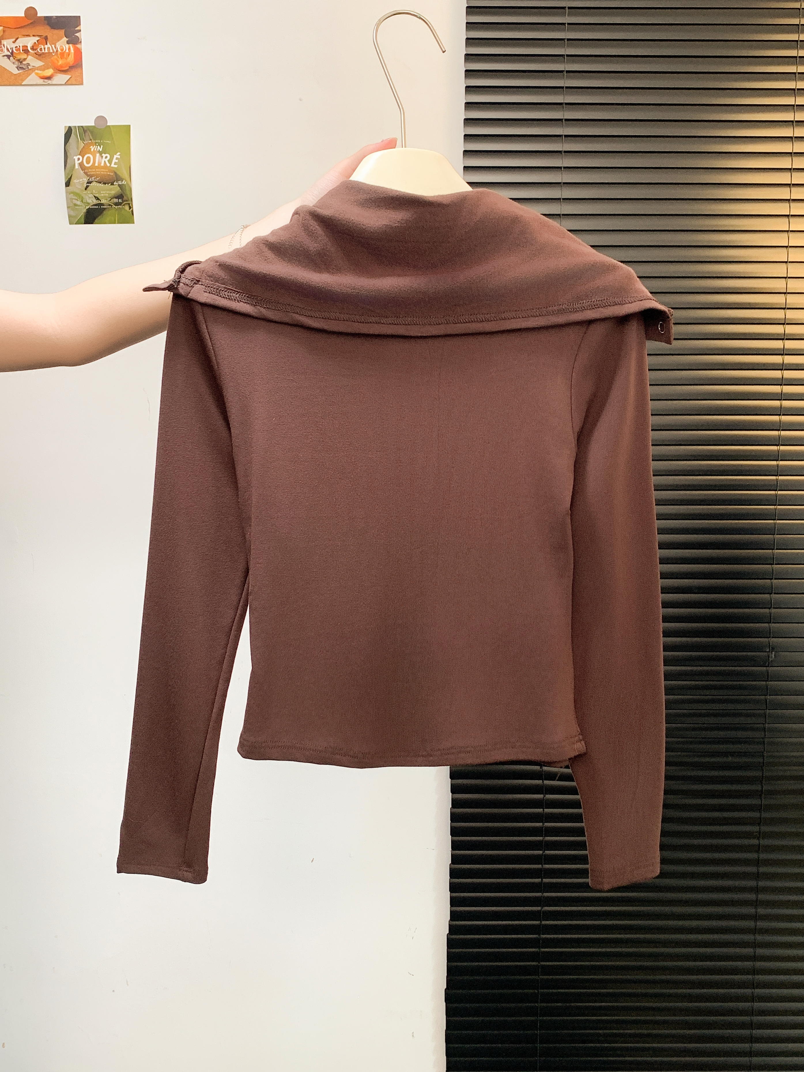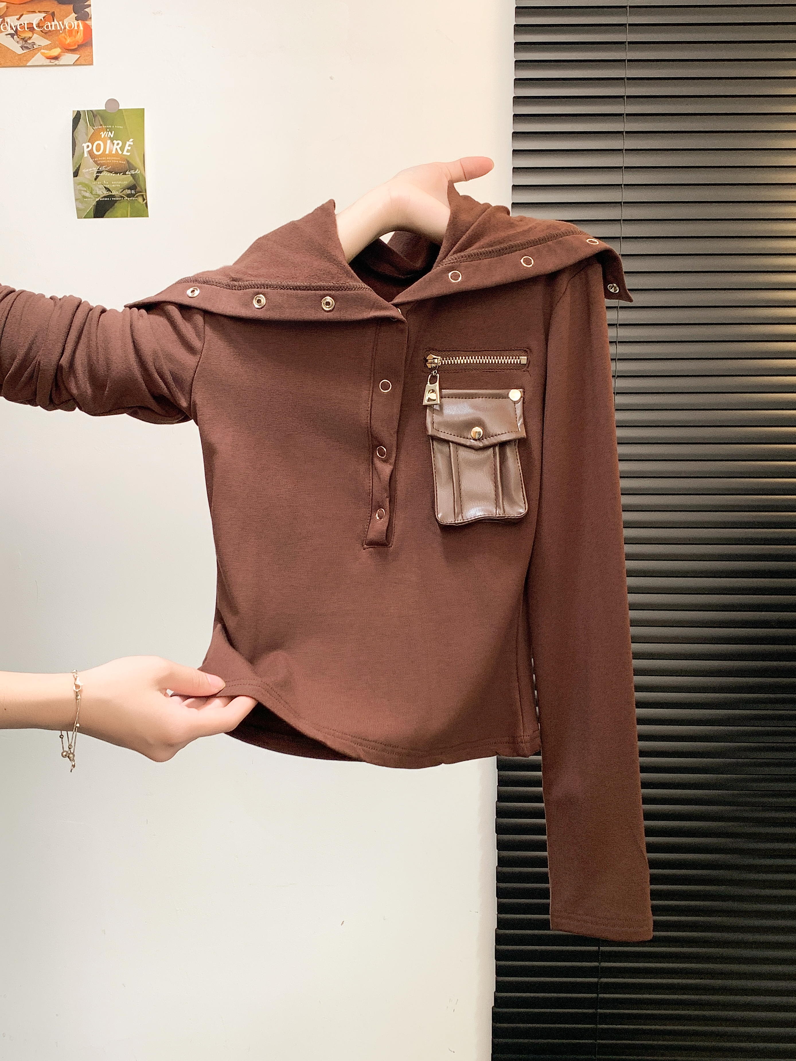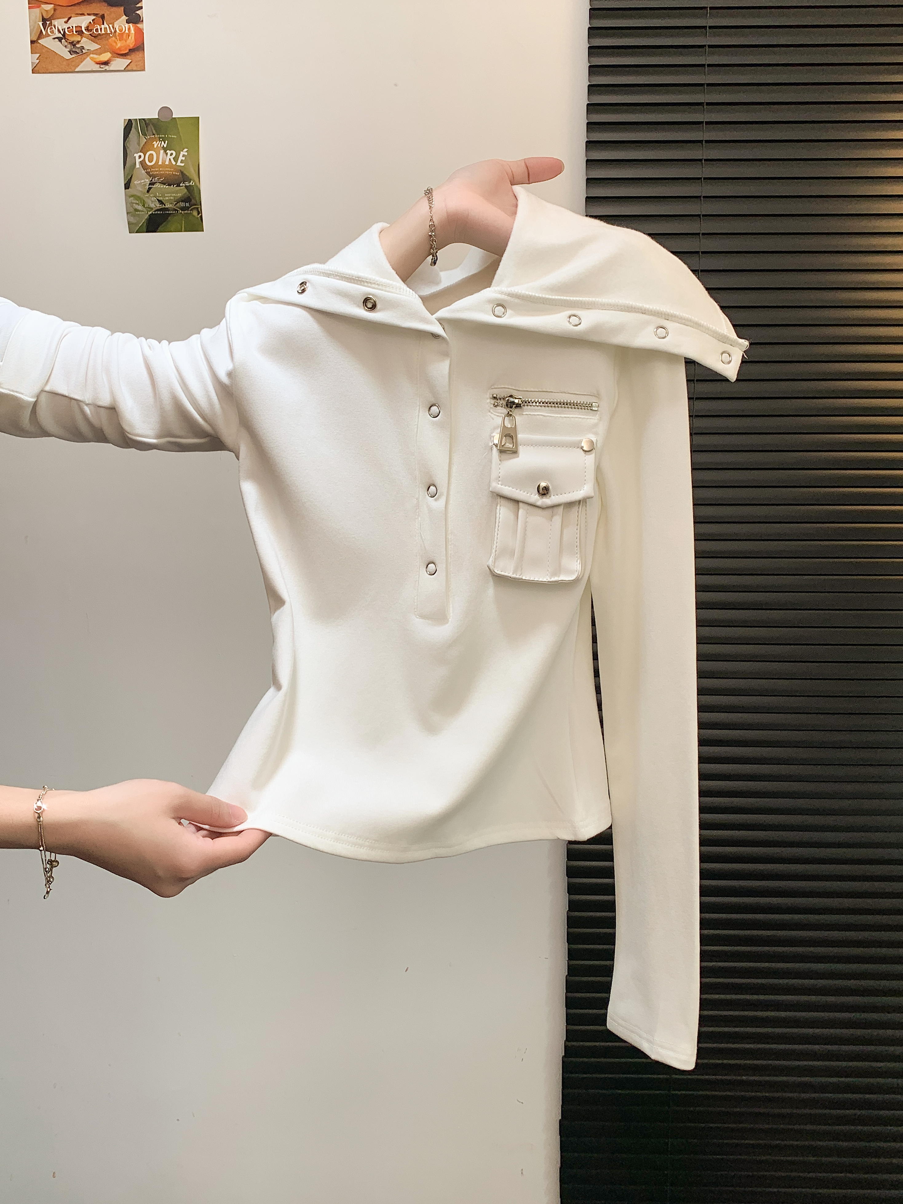 FA47054# 翻领单排扣长袖甜辣T恤衫女秋季新款韩版百搭别致上衣 服裝批發女裝批發服飾貨源
