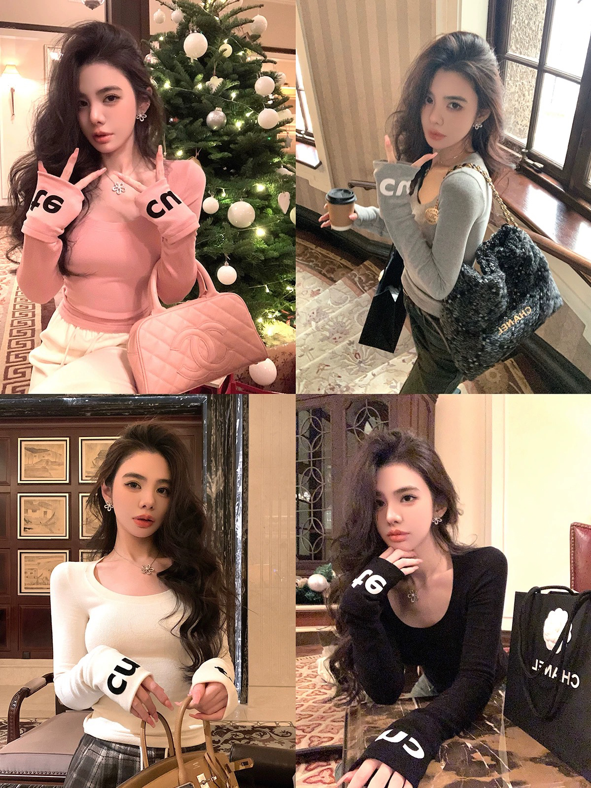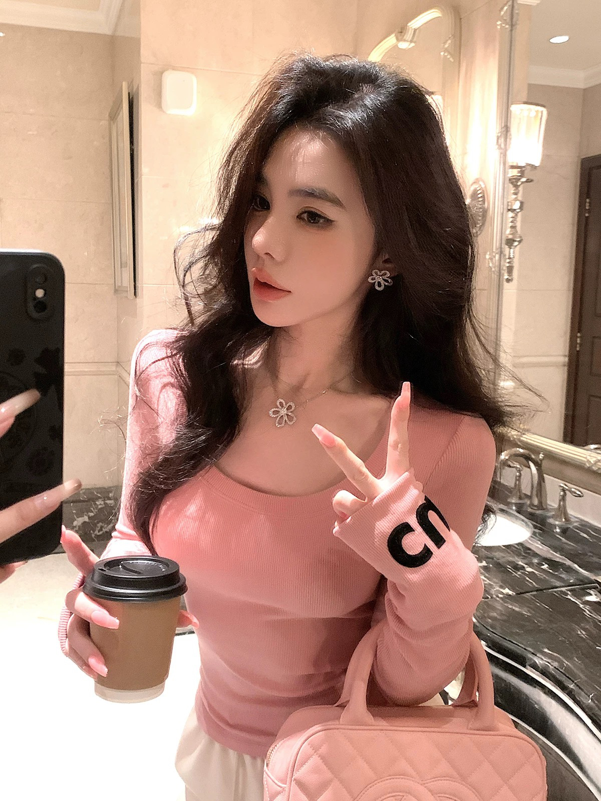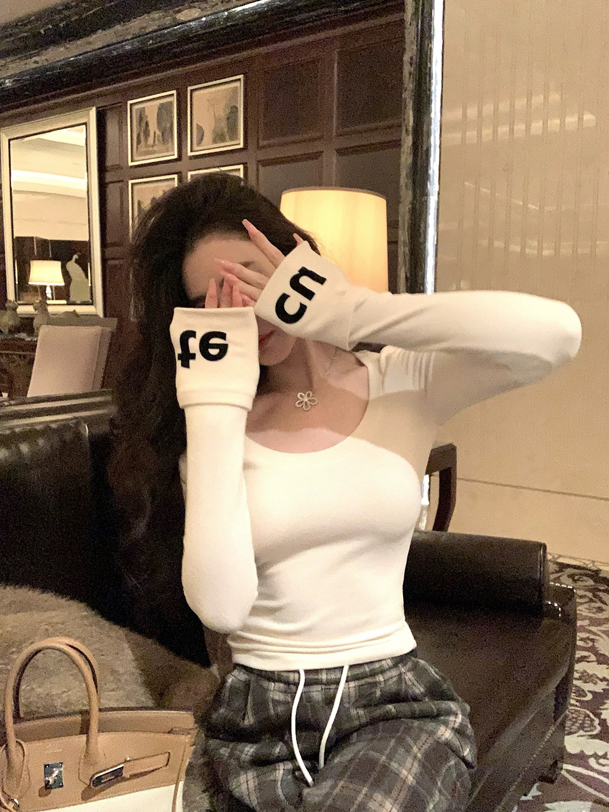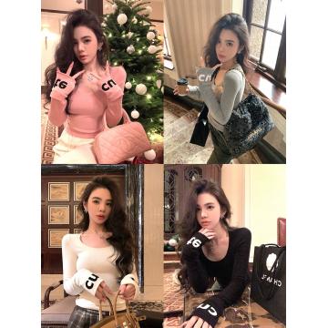 FA47058# 邱肉瑶秋季新款字母印花打底衫纯色修身型显瘦U领内搭长袖T恤女 服裝批發女裝批發服飾貨源