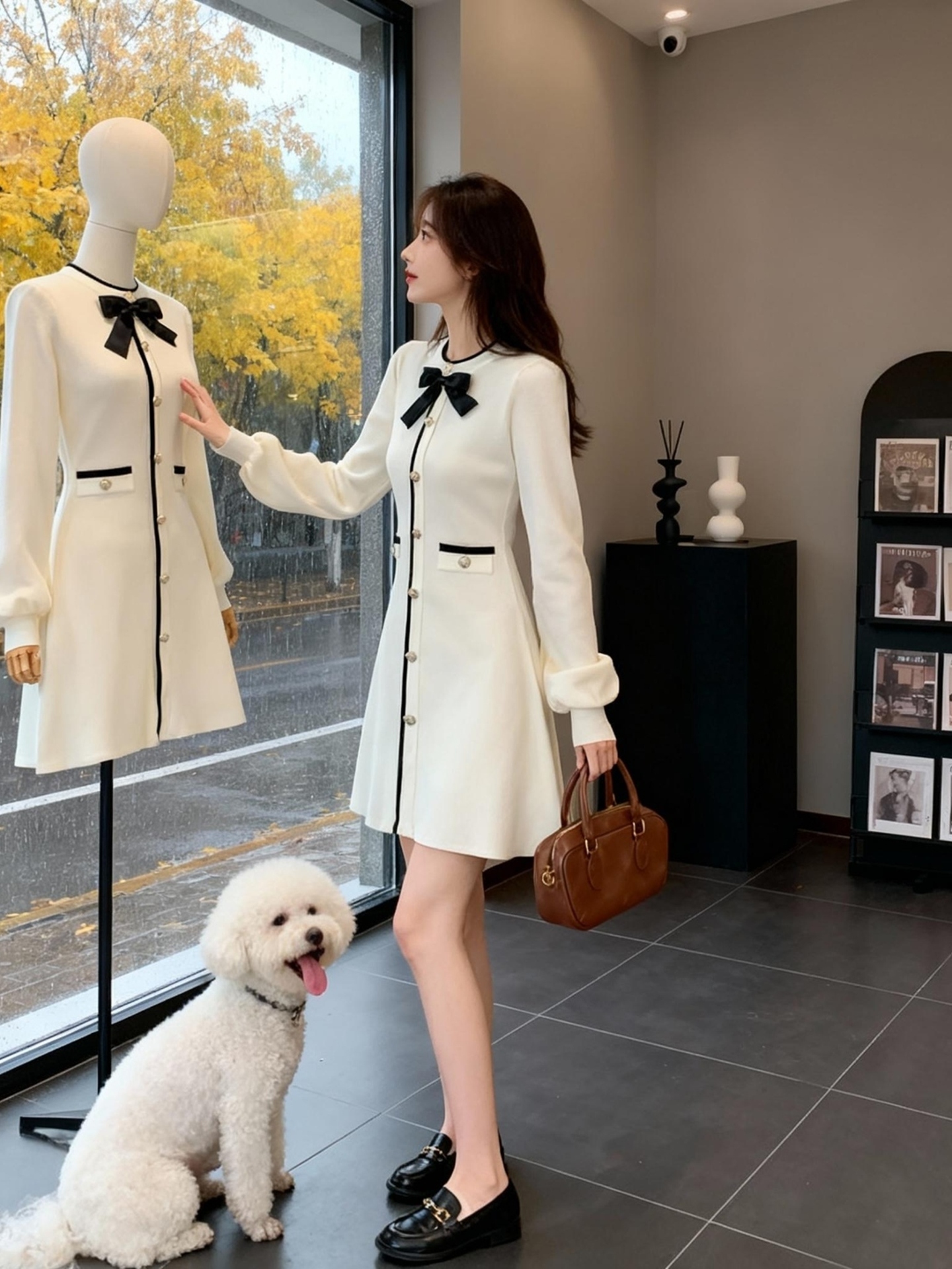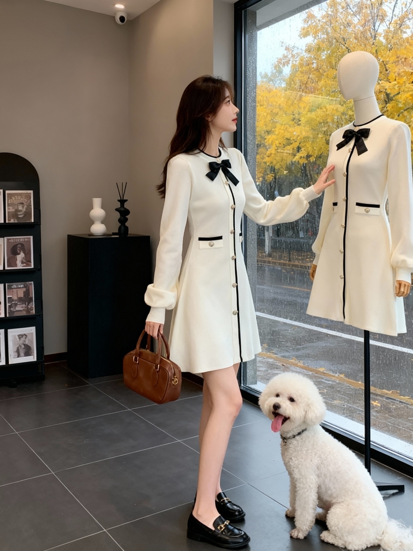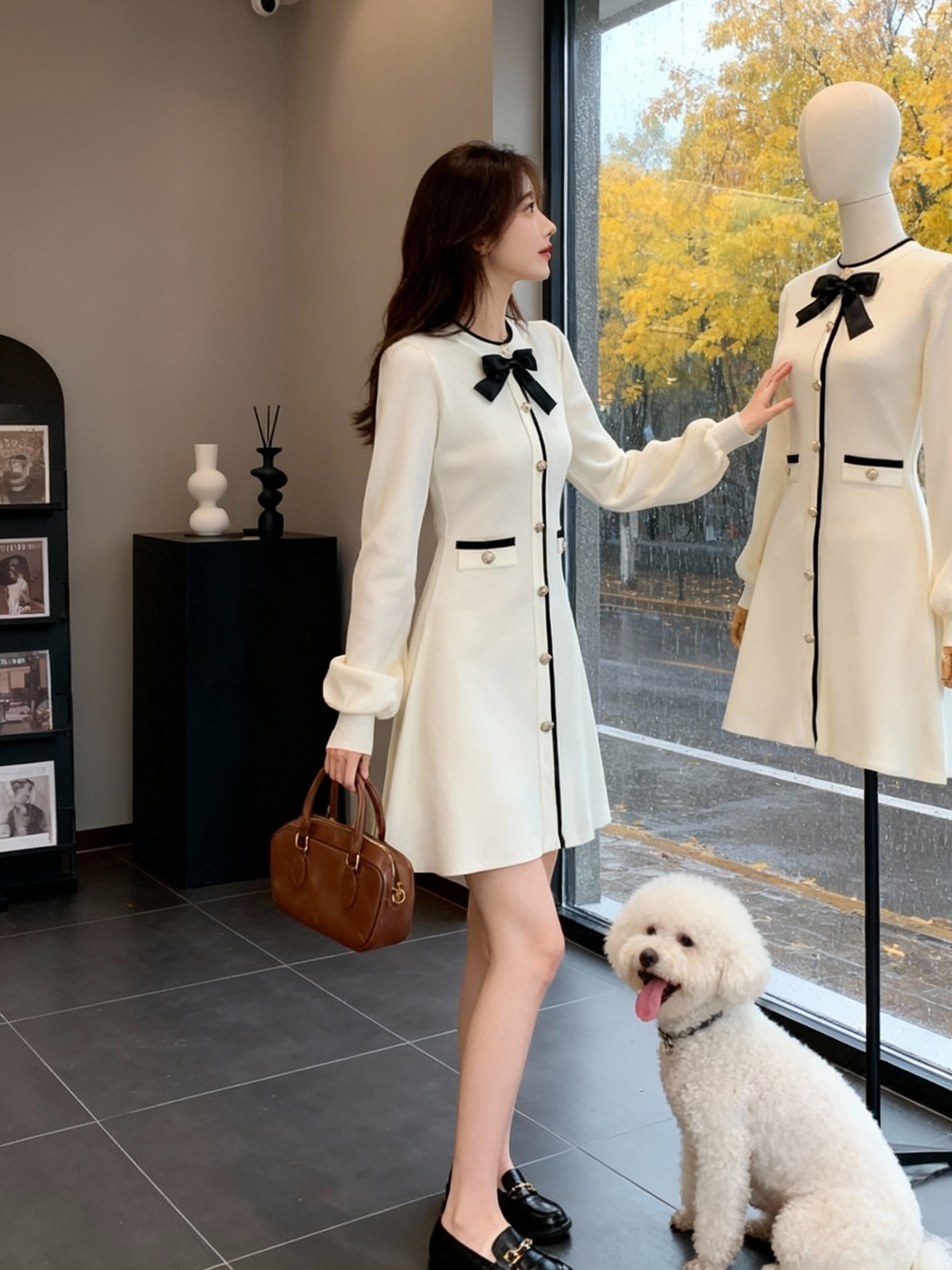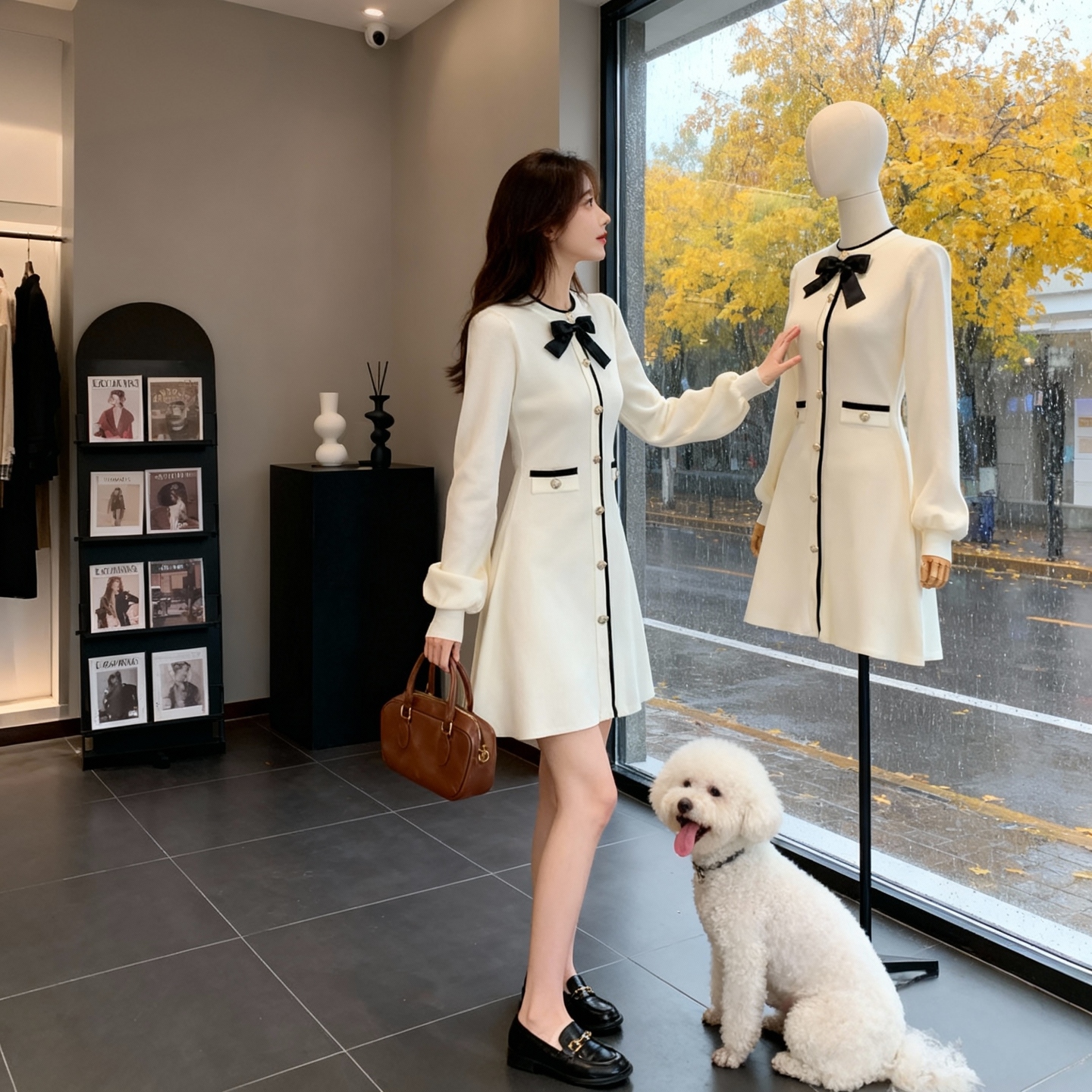 FA47060# 韩国名媛风针织毛衣连衣裙女秋冬高级感蝴蝶结收腰气质小个子短裙 服裝批發女裝批發服飾貨源