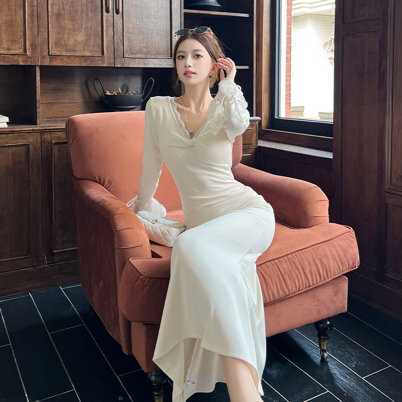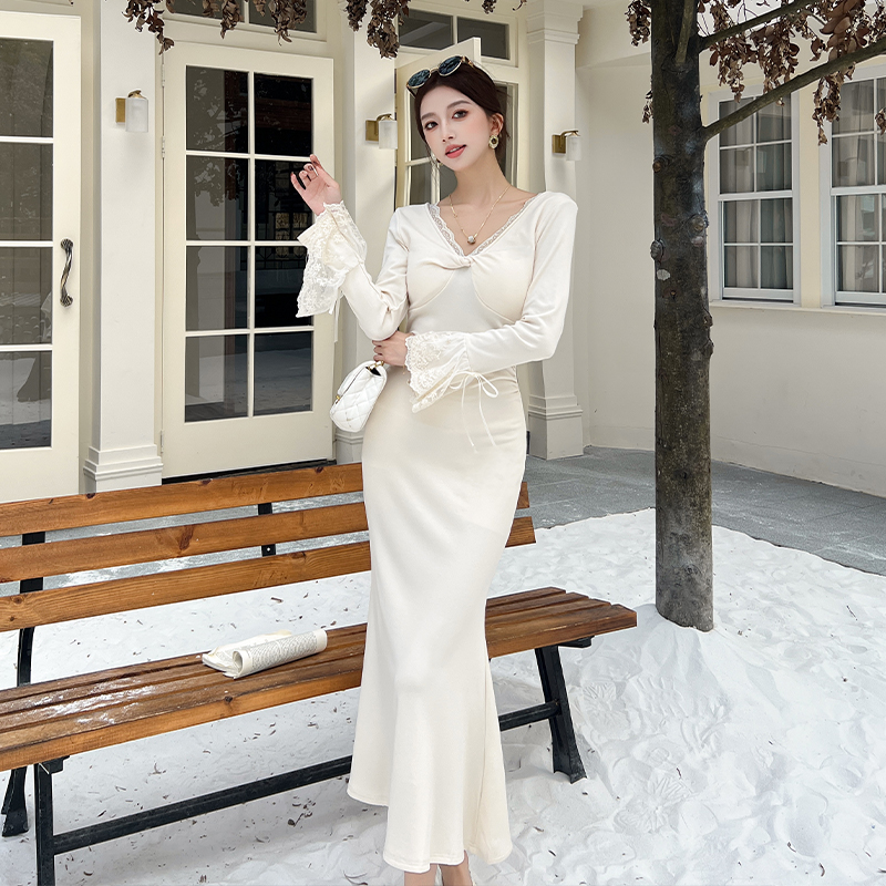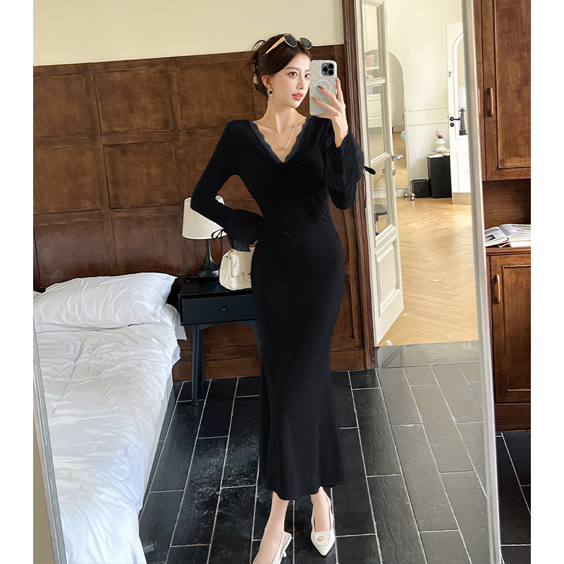 FA47077# 秋冬新款v领蕾丝花边长裙收腰显瘦气质鱼尾连衣裙纯欲温柔风 服裝批發女裝批發服飾貨源