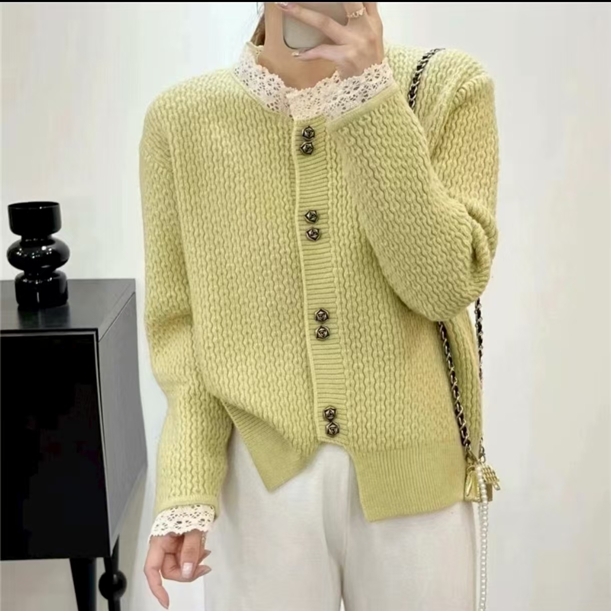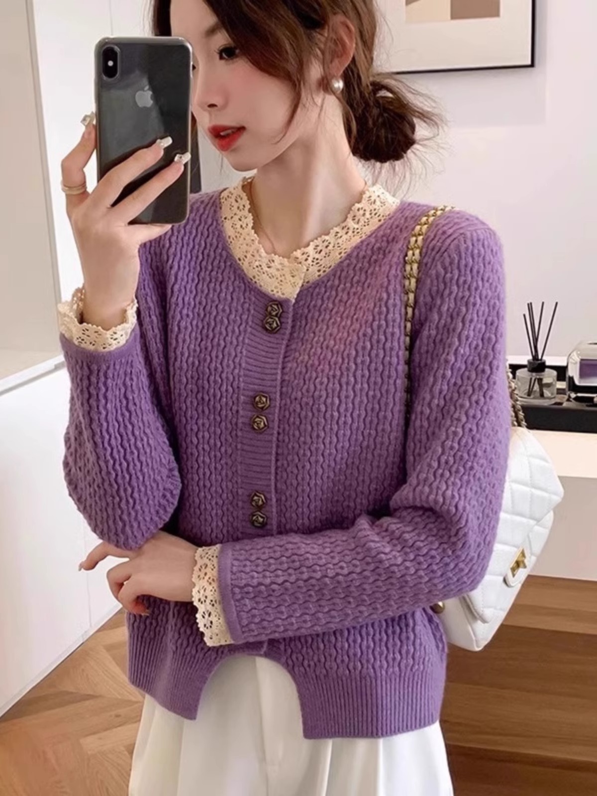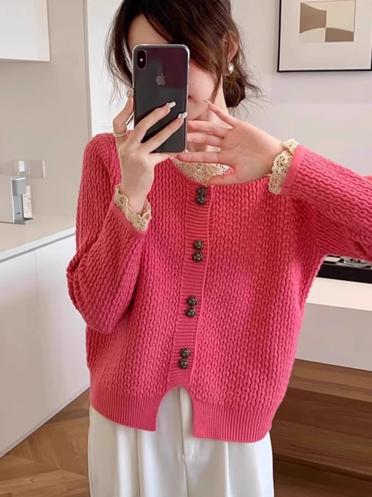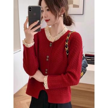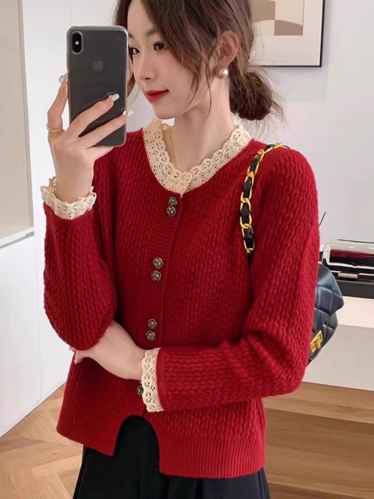 FA47083# 欧式新款红色开衫女蕾丝边短款针织衫毛衣秋冬慵懒风加厚内搭上衣 服裝批發女裝批發服飾貨源