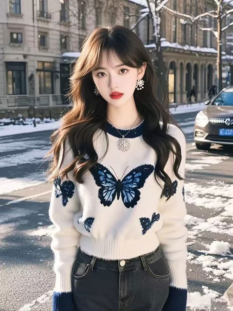 FA47084# 白色蝴蝶印花毛衣女秋冬羊毛高级设计感针织衫独特超好看上衣 服裝批發女裝批發服飾貨源
