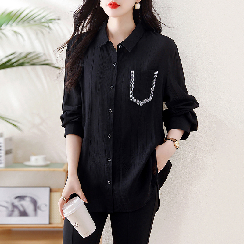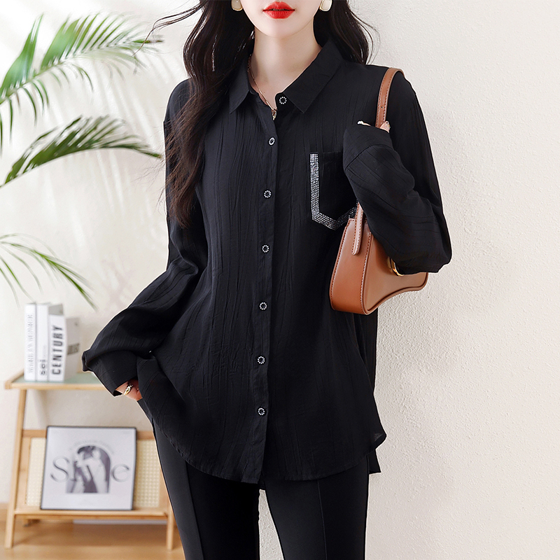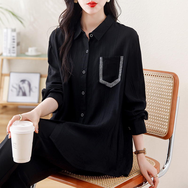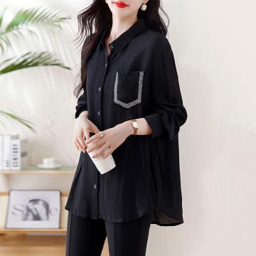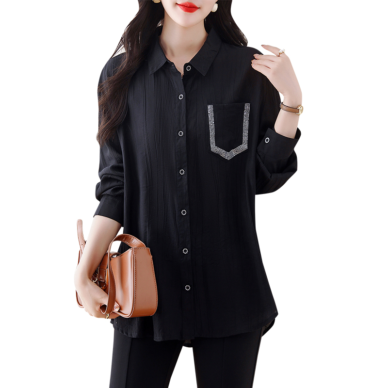 FA47094# 黑色高级感长袖小衫春季新款大码女装宽松遮肚显瘦上衣女 服裝批發女裝批發服飾貨源