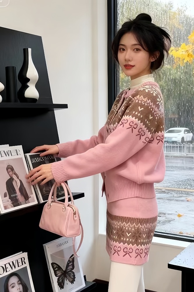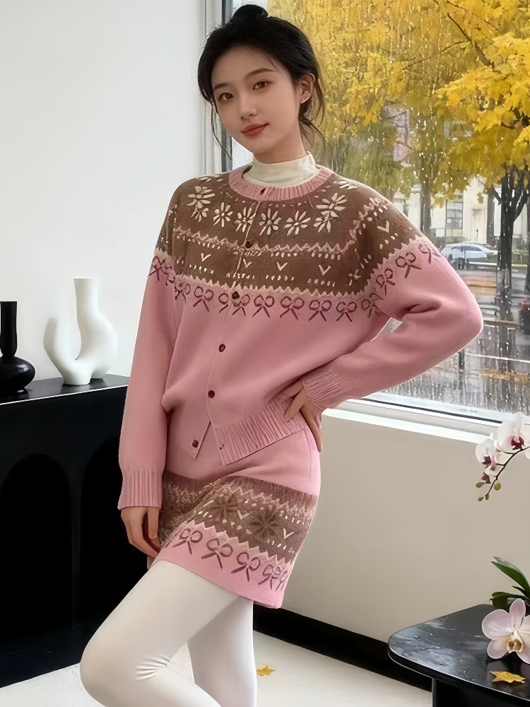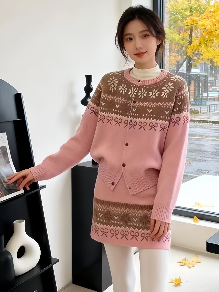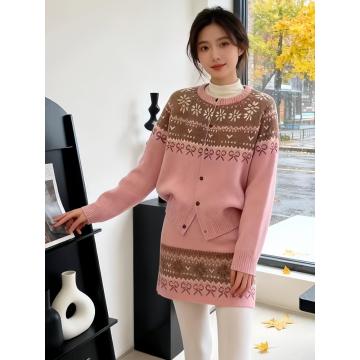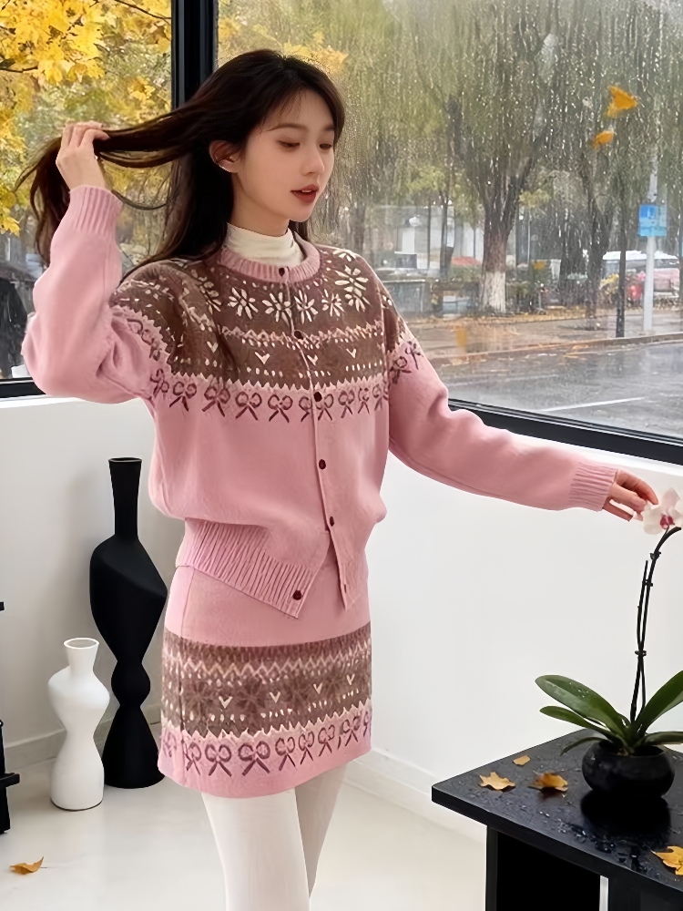 FA47117# 温柔系穿搭套装女韩系复古费尔岛提花加厚毛衣高腰显瘦半裙两件套 服裝批發女裝批發服飾貨源