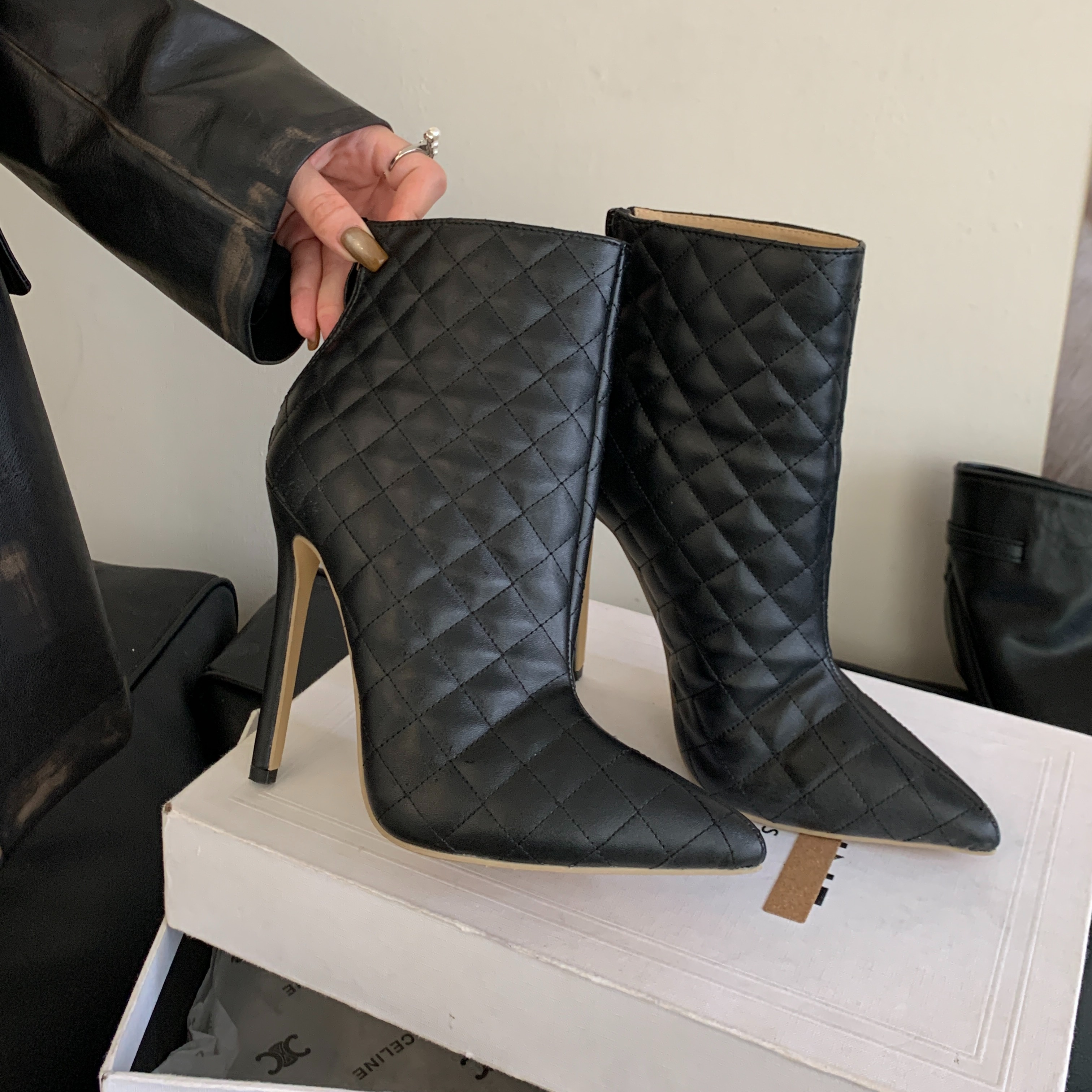 X-32857# 新款御姐范黑色菱形绣线尖头细高跟靴 鞋子批发女鞋批发货源