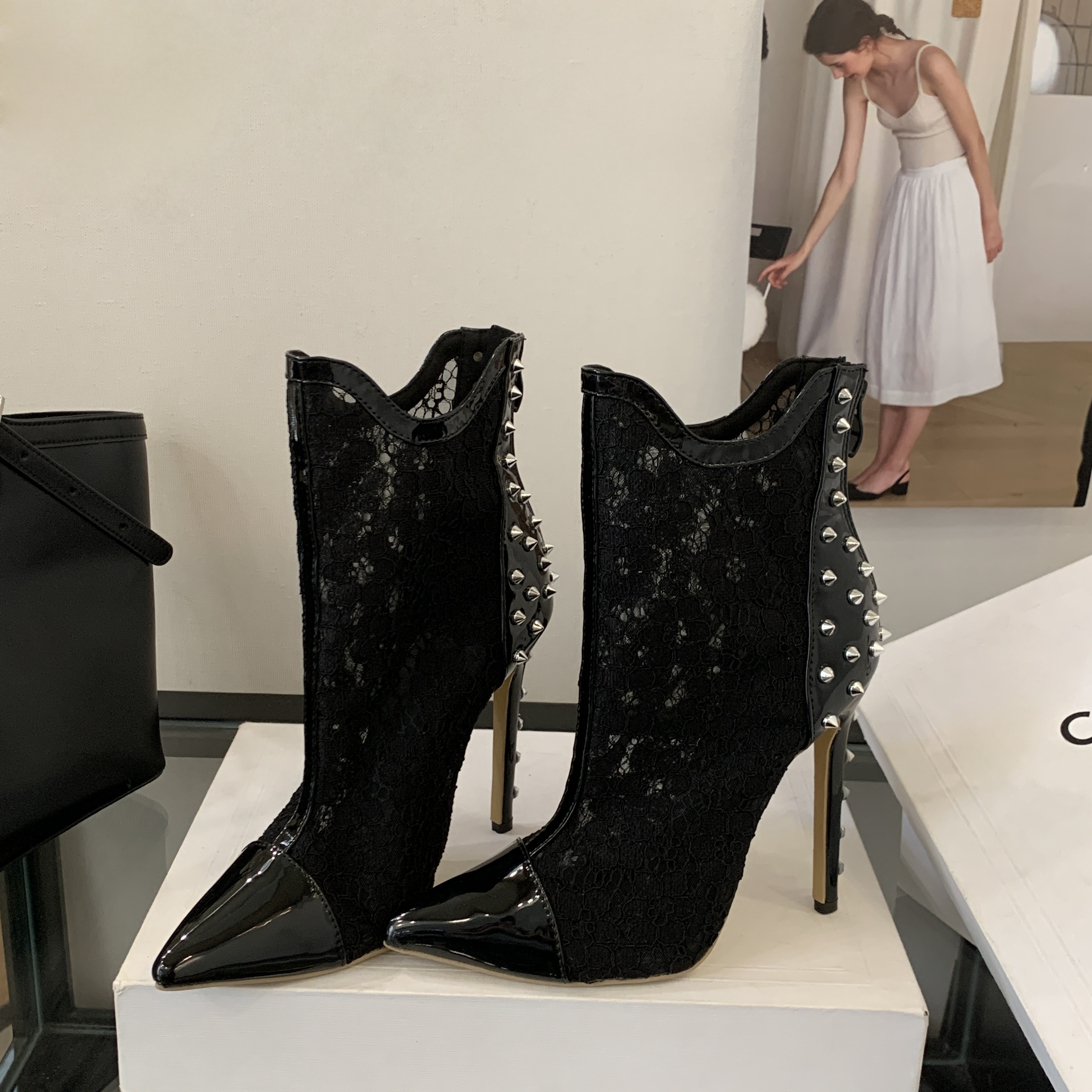 X-32858# 新款欧美金典黑色性感蕾丝铆钉高跟靴 鞋子批发女鞋批发货源