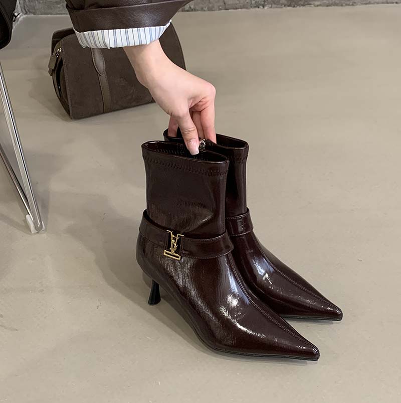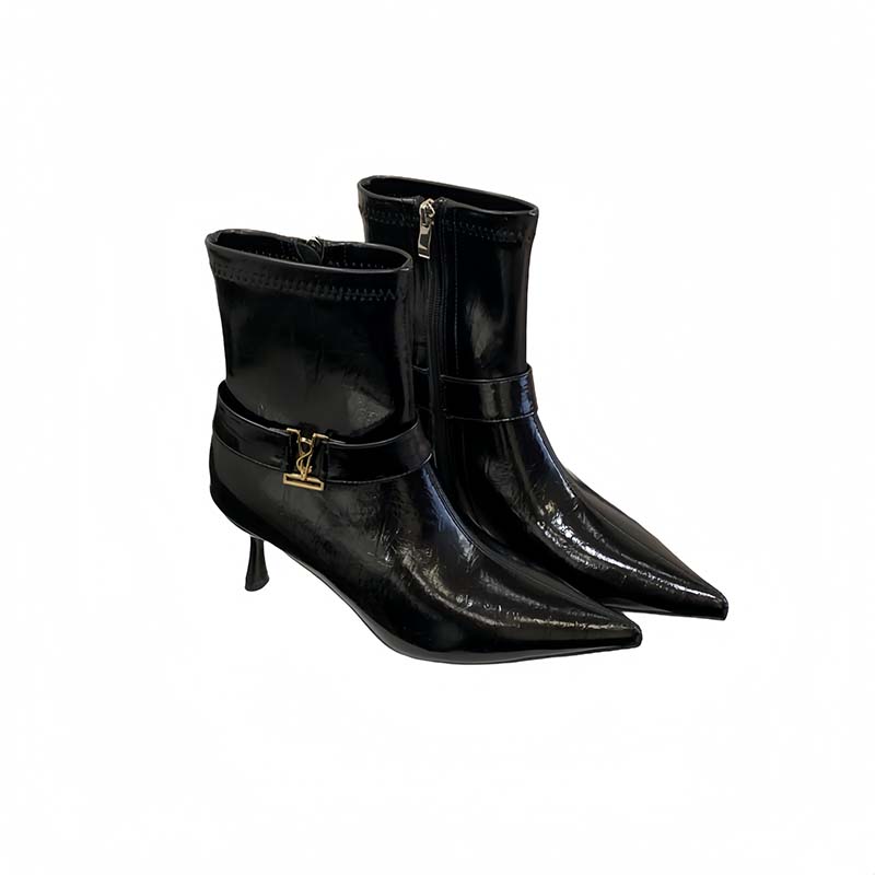 X-32868# 秋冬新款设计感尖头细跟时装靴黑色性感金属高跟瘦瘦靴女短靴 鞋子批发女鞋批发货源