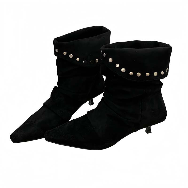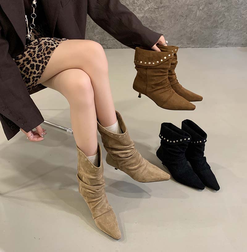 X-32869# 欧美时尚铆钉褶皱堆堆靴女新款绒面小方头细跟显瘦气质短靴 鞋子批发女鞋批发货源