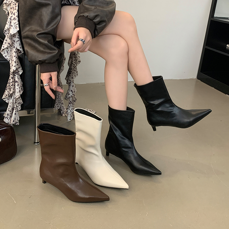 X-32880# 欧美风简约气质尖头短靴时尚通勤百搭纯色及踝靴舒适猫跟套筒靴子 鞋子批发女鞋批发货源