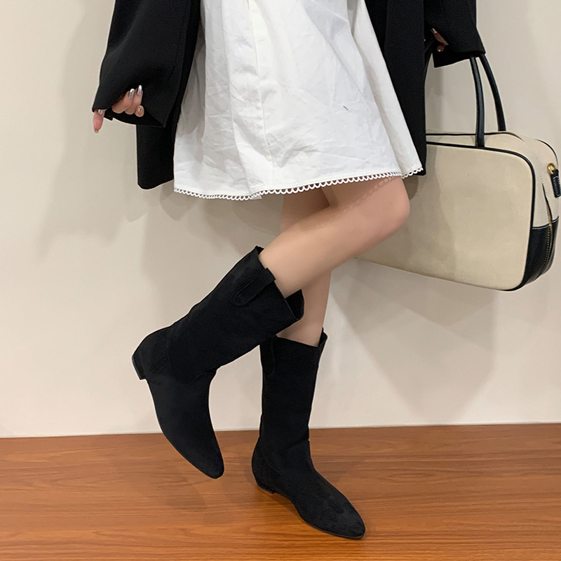 X-32883# 秋冬高品质手工堆堆靴尖头套筒平底牛仔靴纯色百搭绒面中筒靴 鞋子批发女鞋批发货源