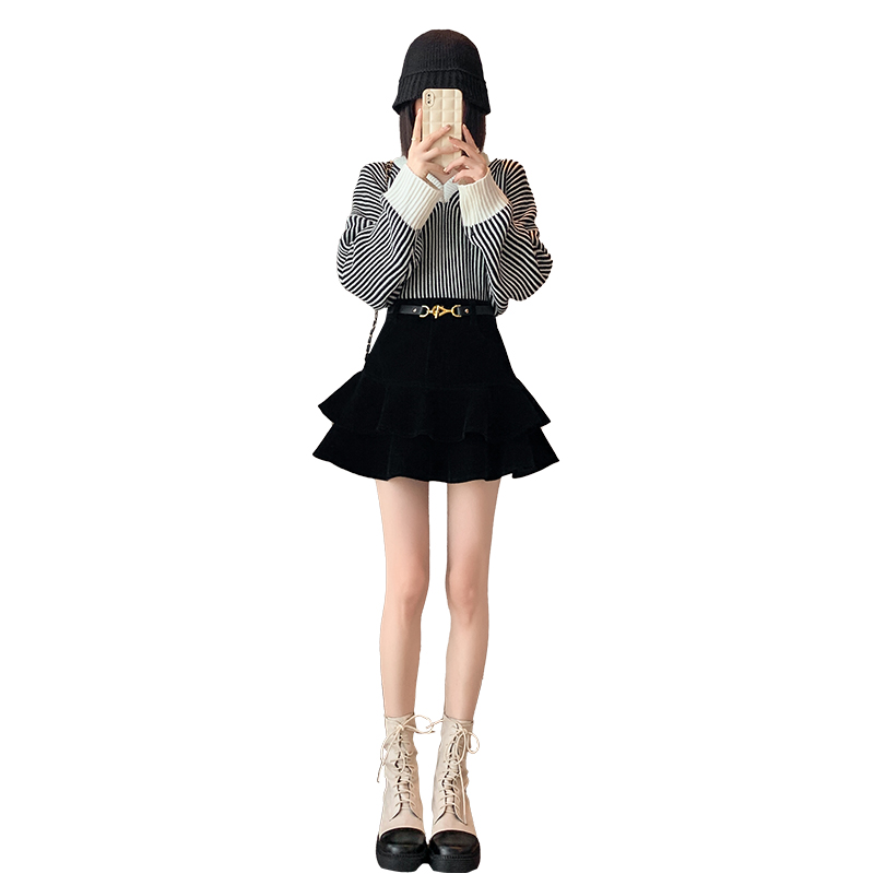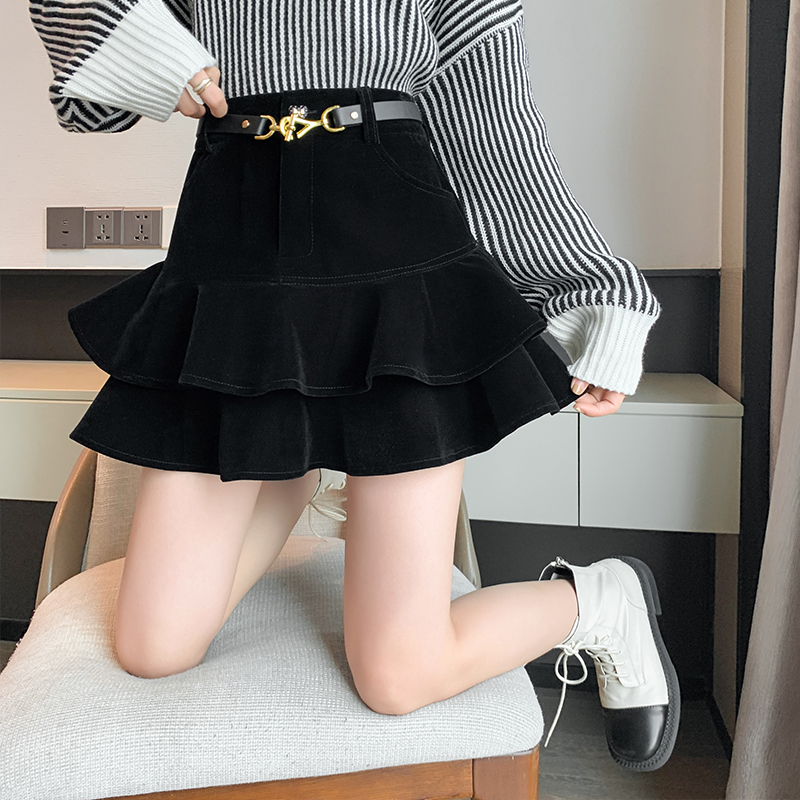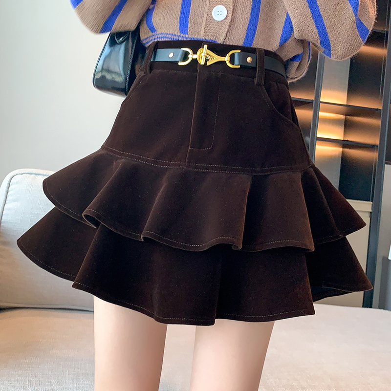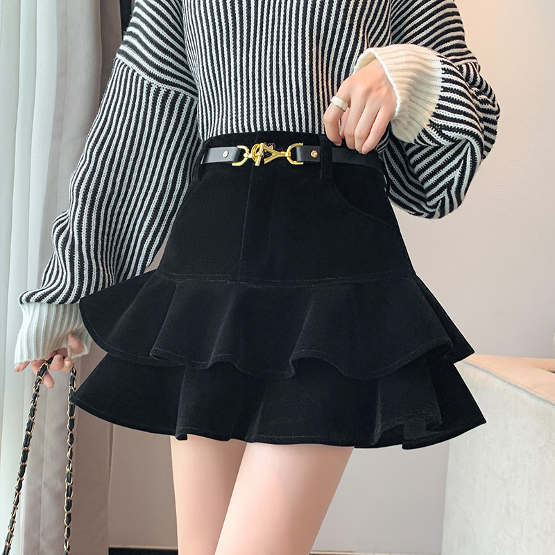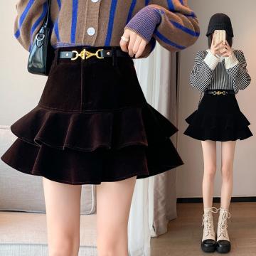 FA47289# 秋季新款韩版高腰复古荷叶边金丝绒蓬蓬金扣蛋糕裙女短裙半身裙子 服裝批發女裝批發服飾貨源