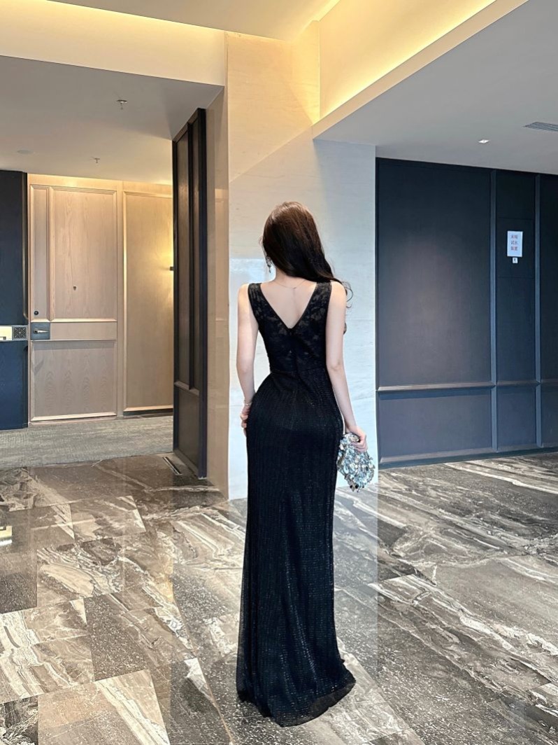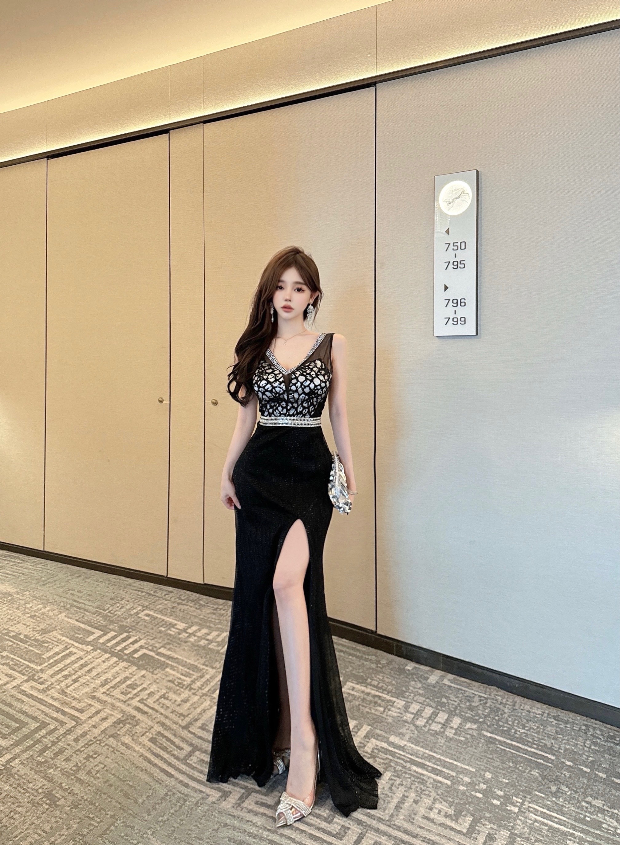 新款性感修身包臀轻奢气质开叉高端晚礼服双肩连衣裙