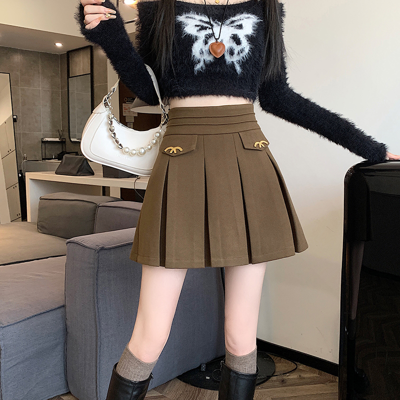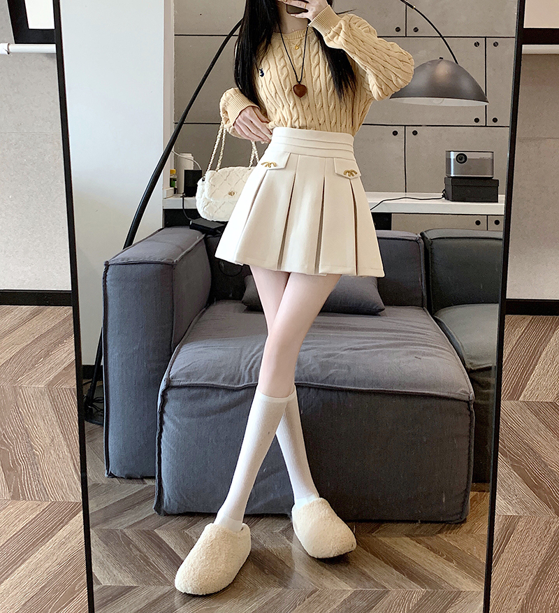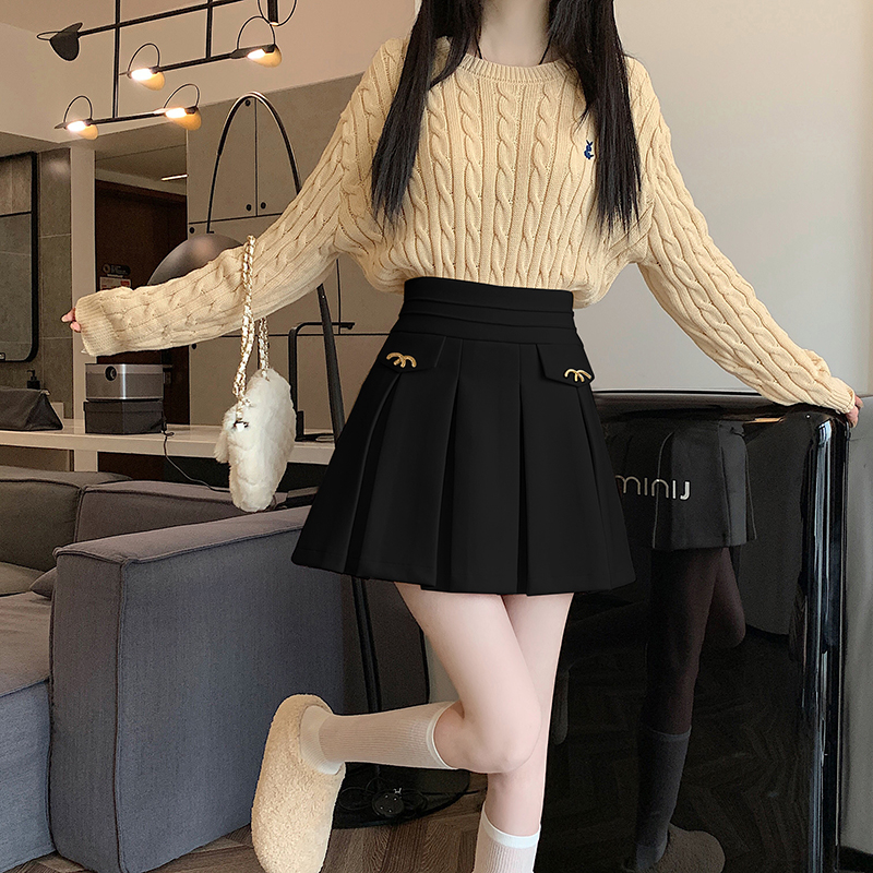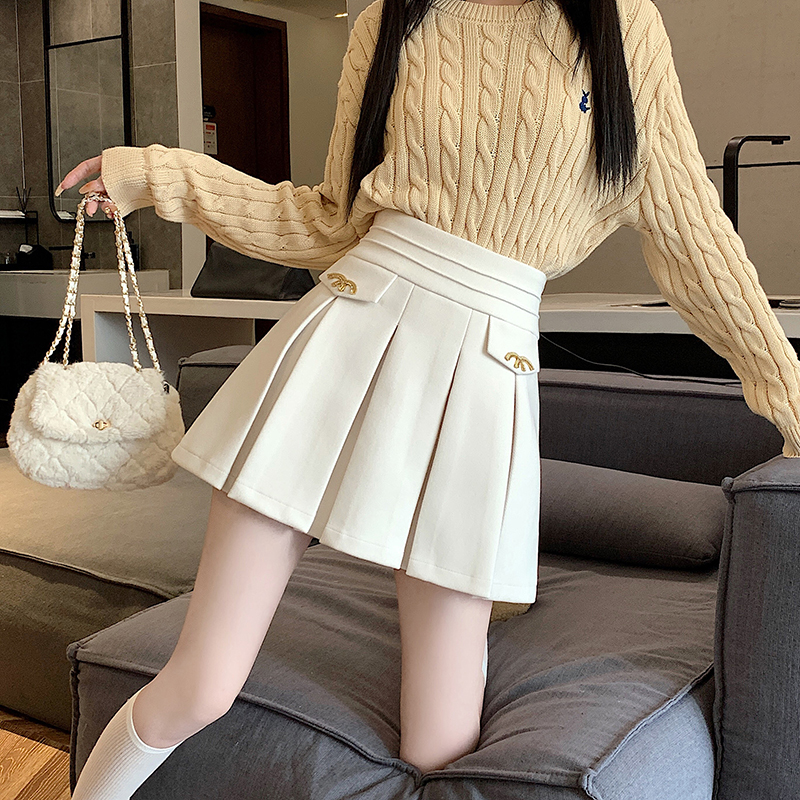 FA49462# 秋冬新款韩系小香风A字半身裙时尚M扣高腰显瘦毛呢百褶裙 服裝批發女裝批發服飾貨源
