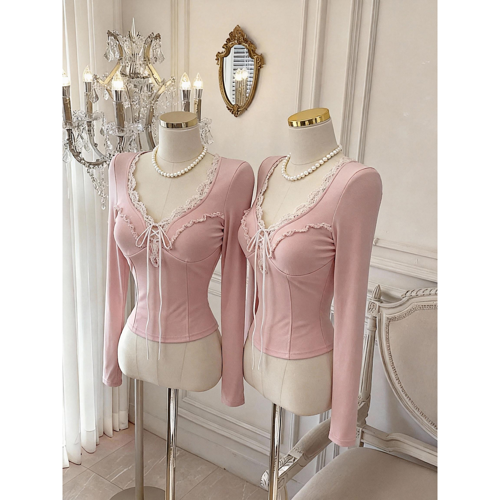 FA49672# 法式温柔风蕾丝拼接v领女内搭收腰显瘦长袖上衣秋冬