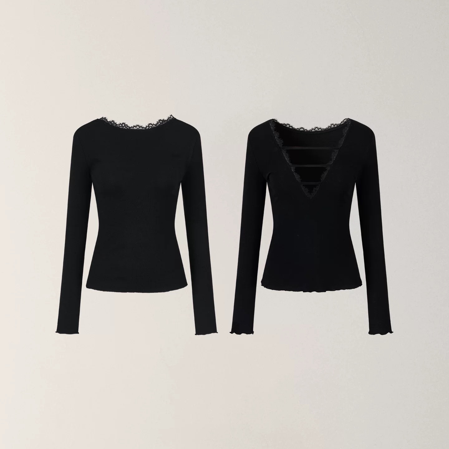 FA49834# 设计感正反两穿蕾丝拼接长袖T恤女装秋冬修身莱赛尔上衣 服裝批發女裝批發服飾貨源