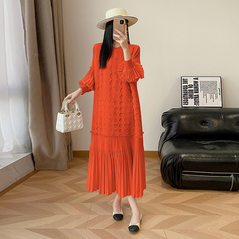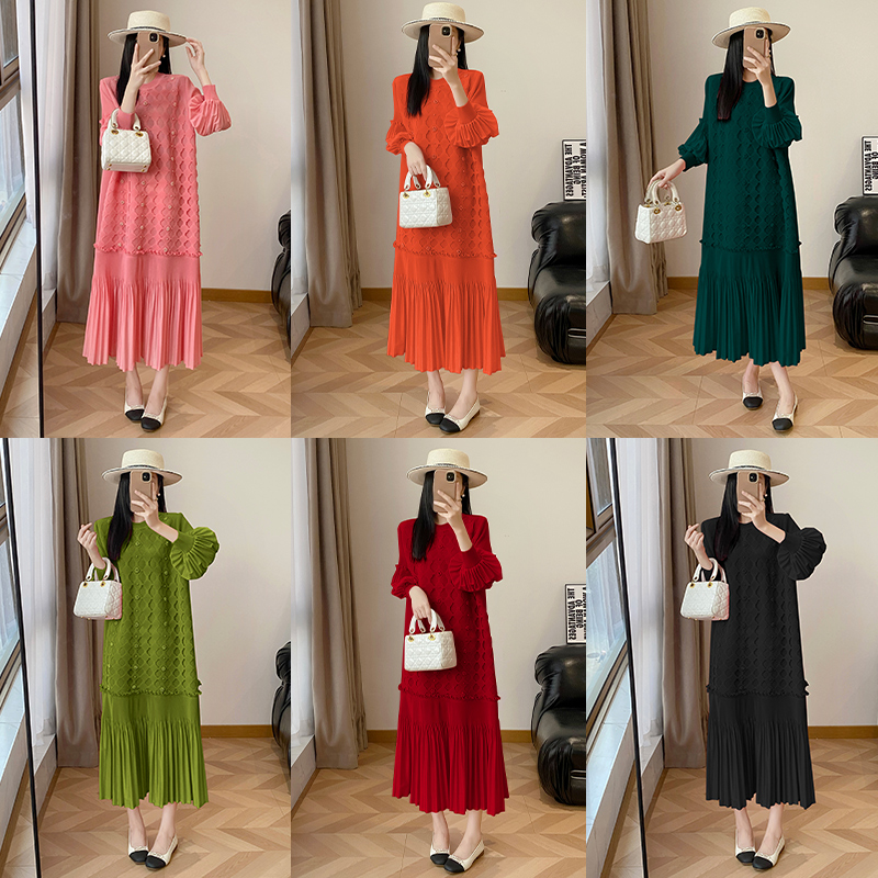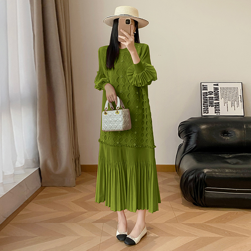 FA50215# 欧美时尚重工钉珠灯笼袖宽松压褶连衣裙女秋季休闲高级感长裙 服裝批發女裝批發服飾貨源