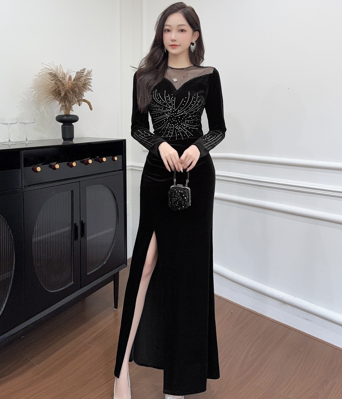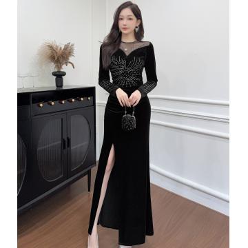 FA50222# 黑色法式高级感礼服吊带丝绒开叉连衣裙 服裝批發女裝批發服飾貨源