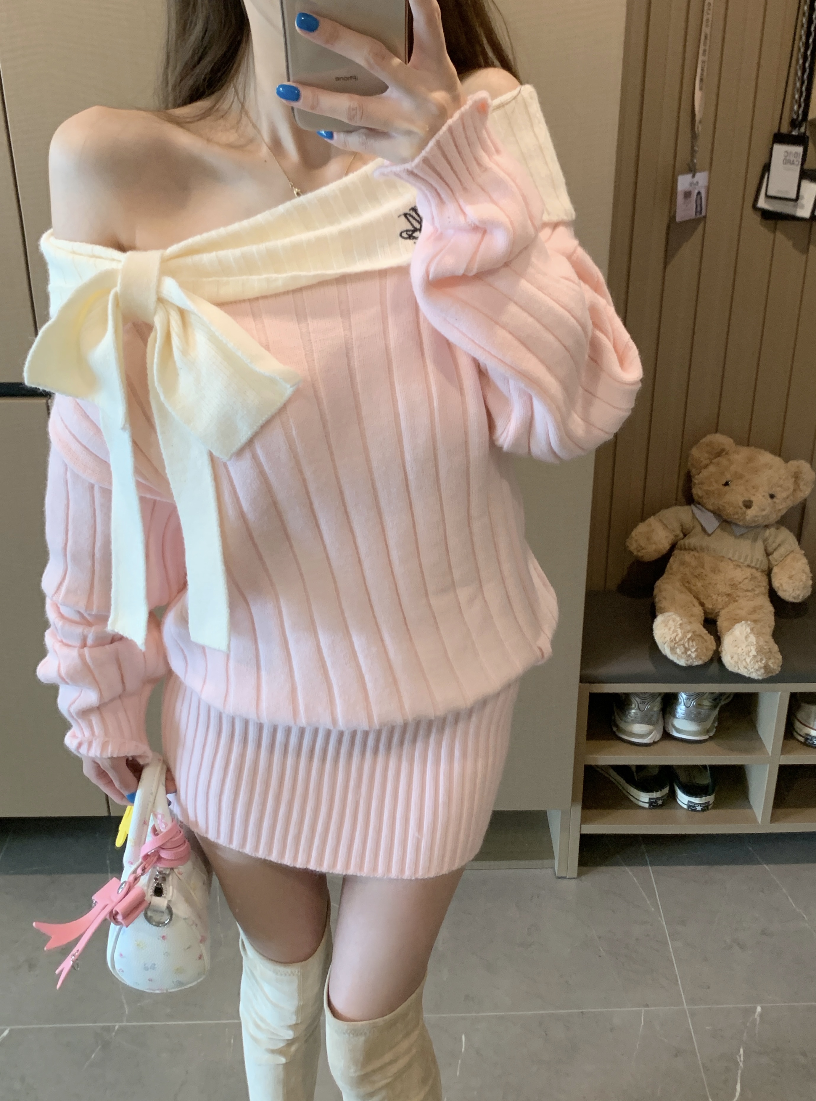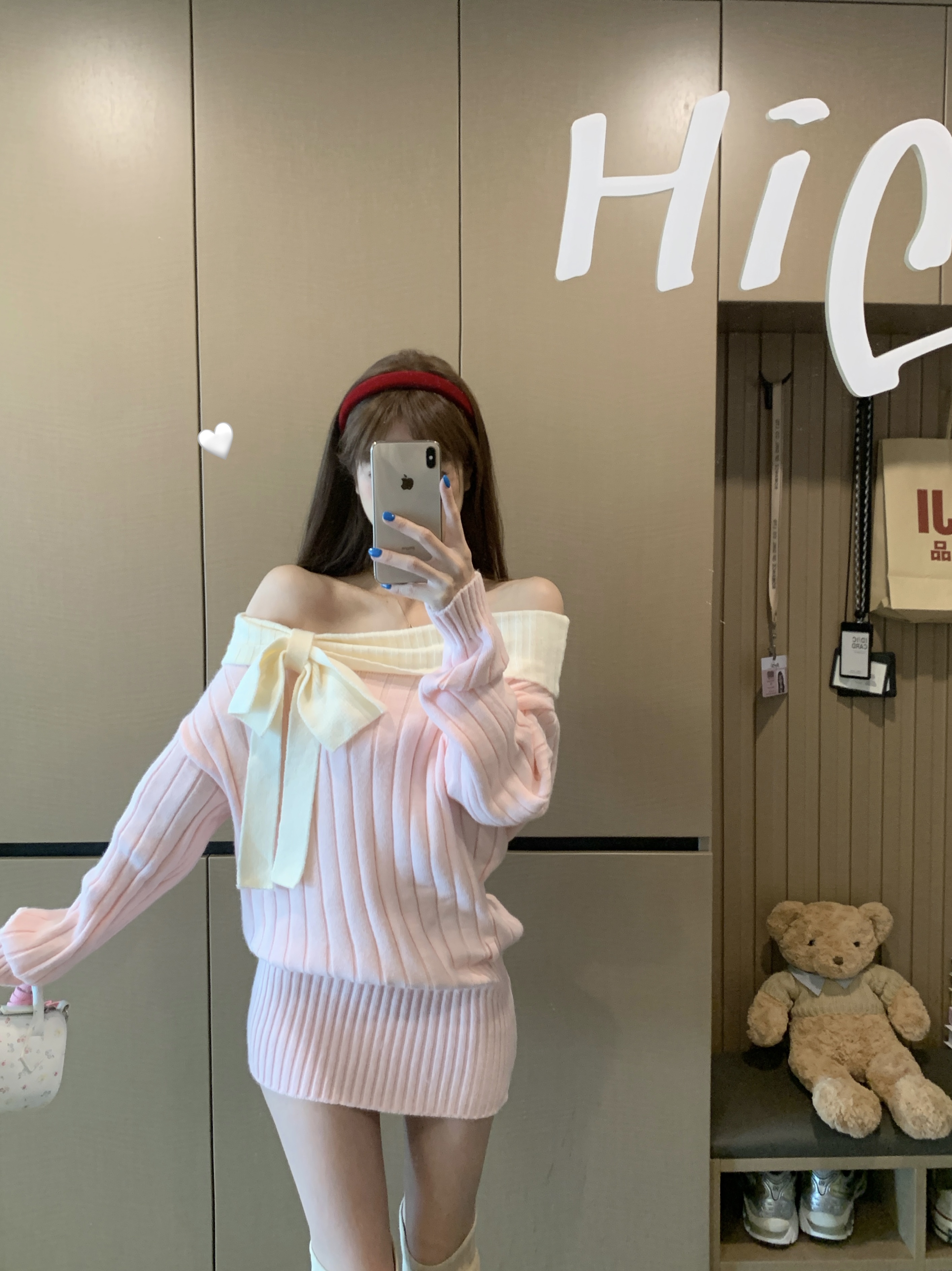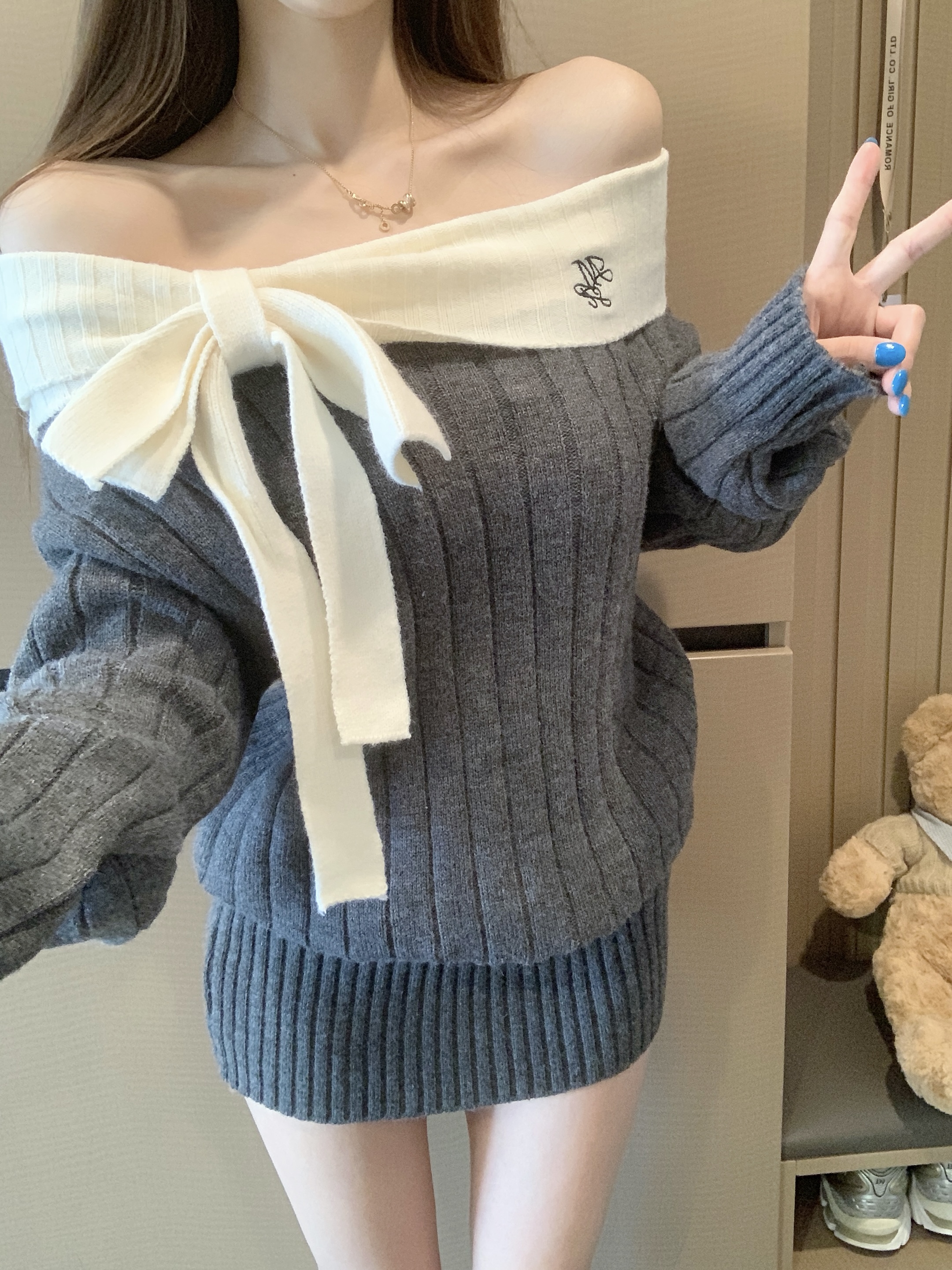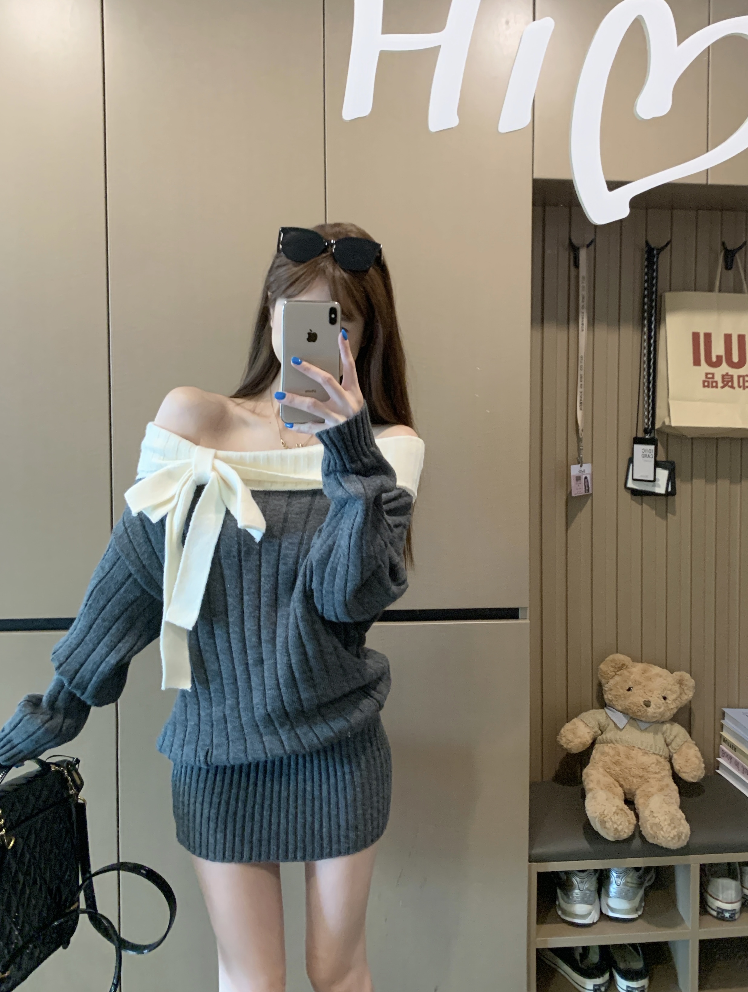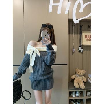 FA50223# 灰色一字肩长袖针织连衣裙女秋冬小个子收腰修身包臀短裙 服裝批發女裝批發服飾貨源