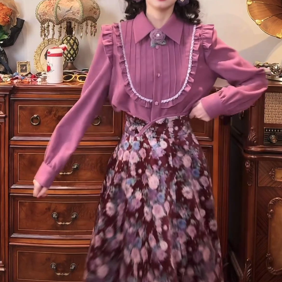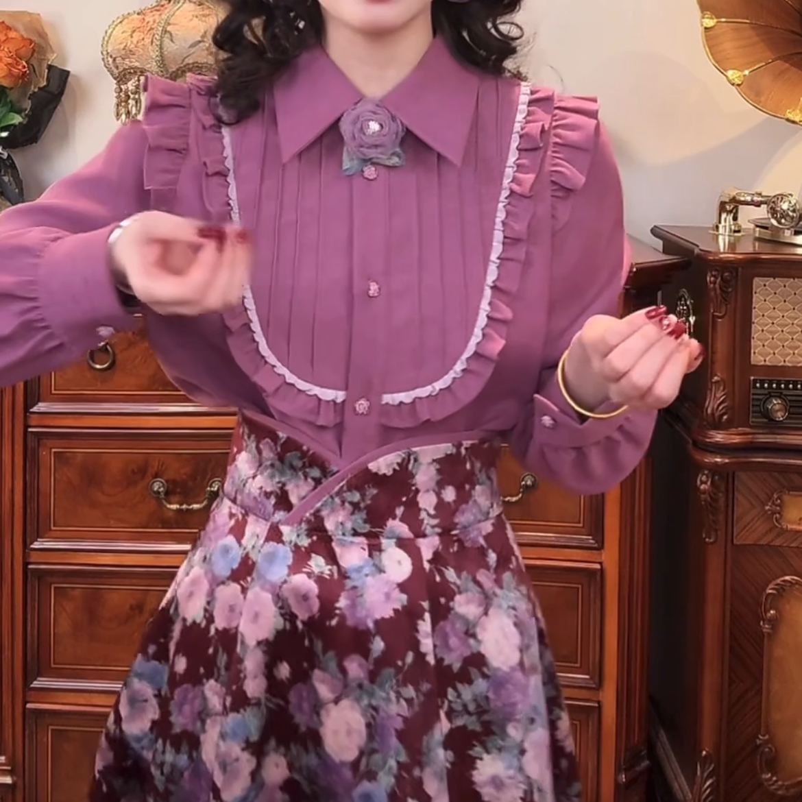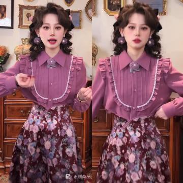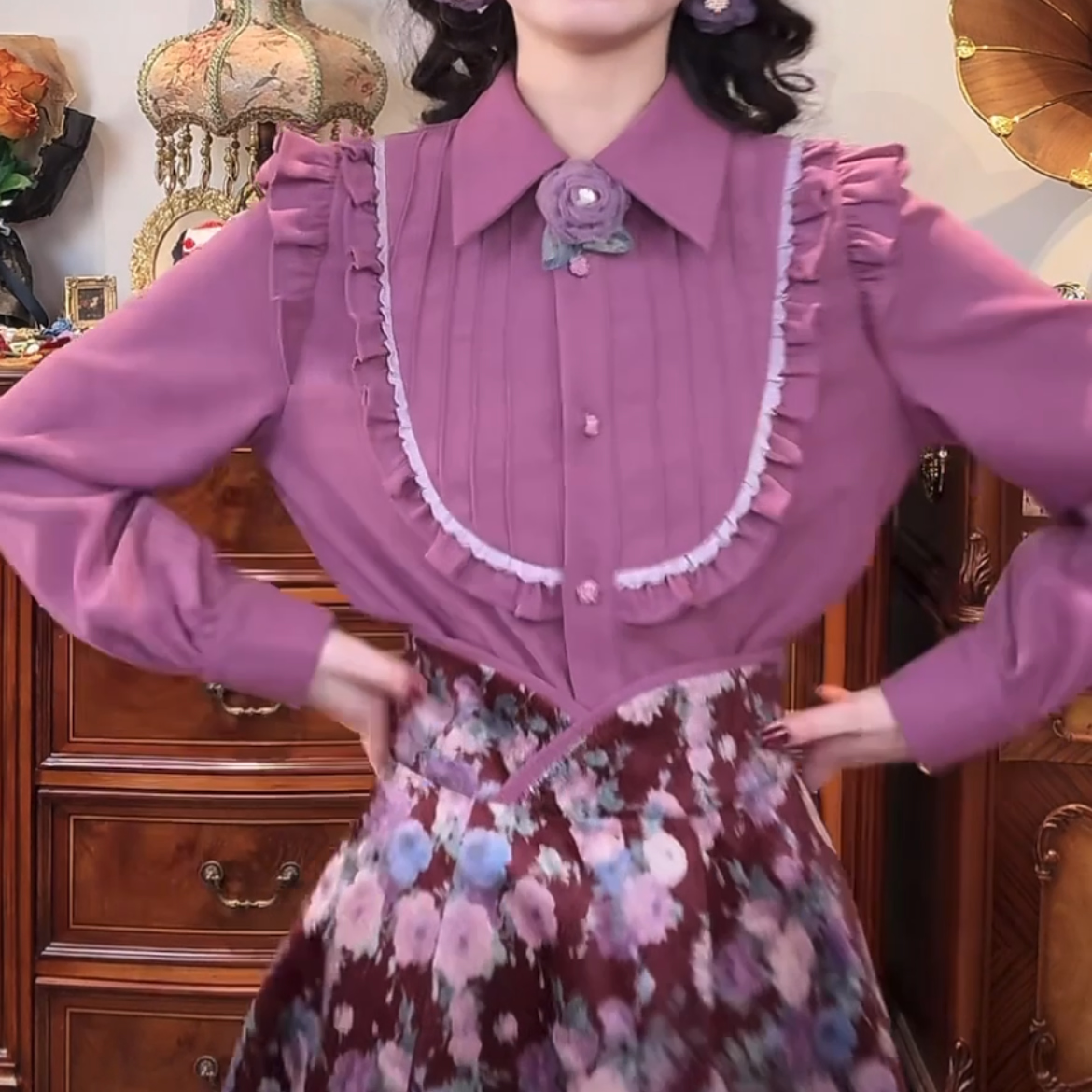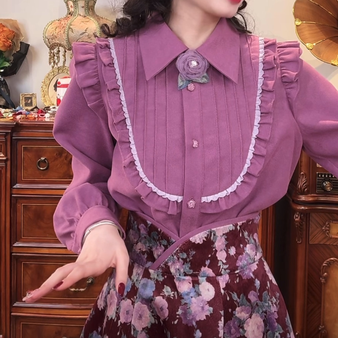 FA50244# 甘蓝紫秋冬复古设计感荷叶边打条加厚长袖衬衫女 服裝批發女裝批發服飾貨源