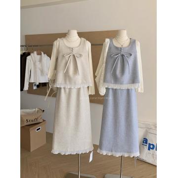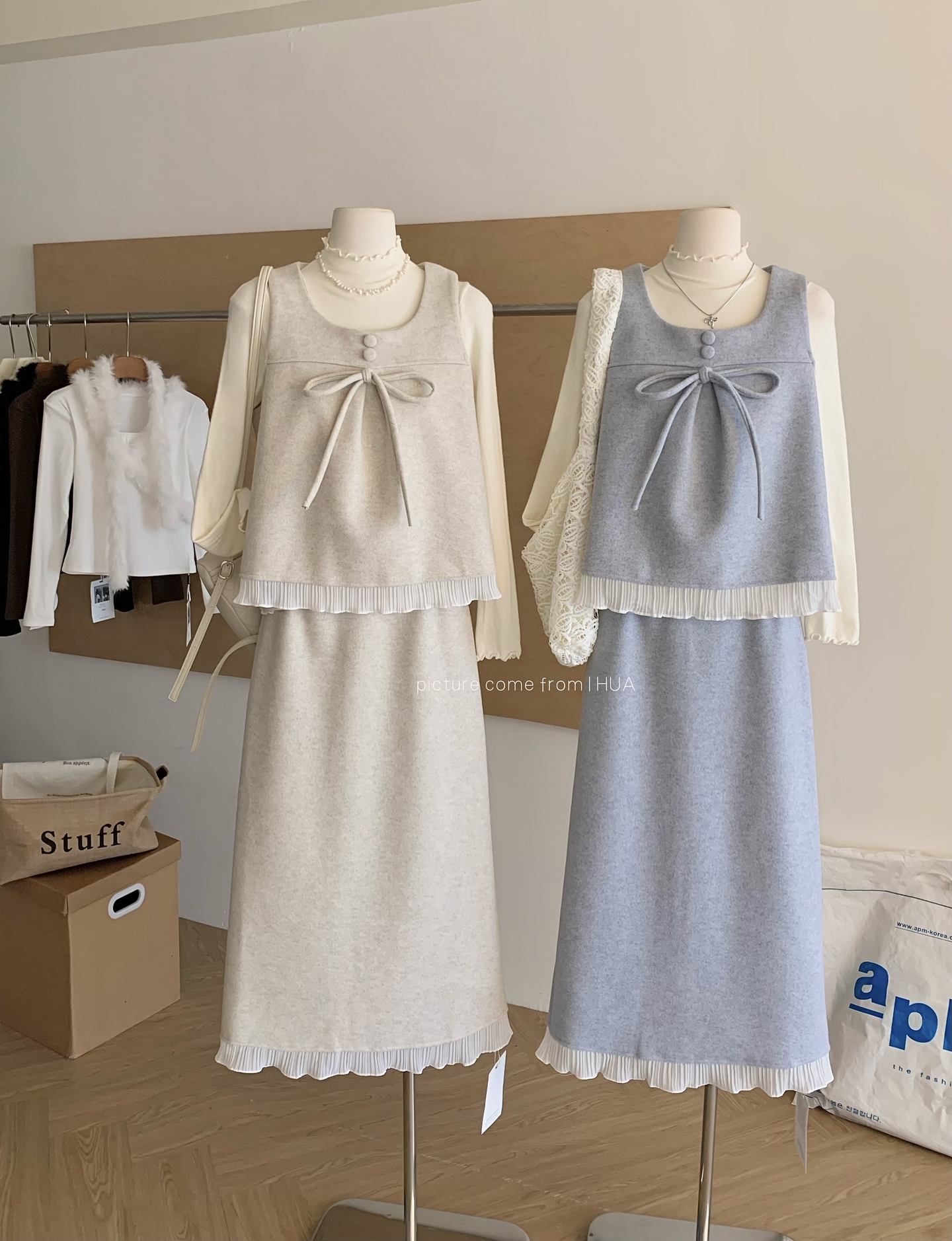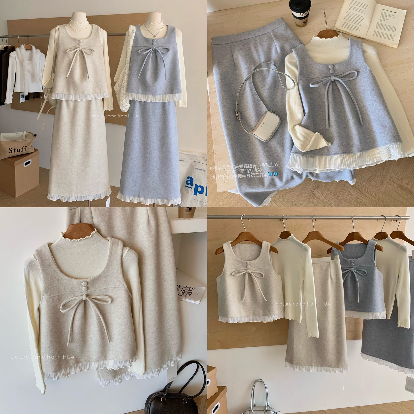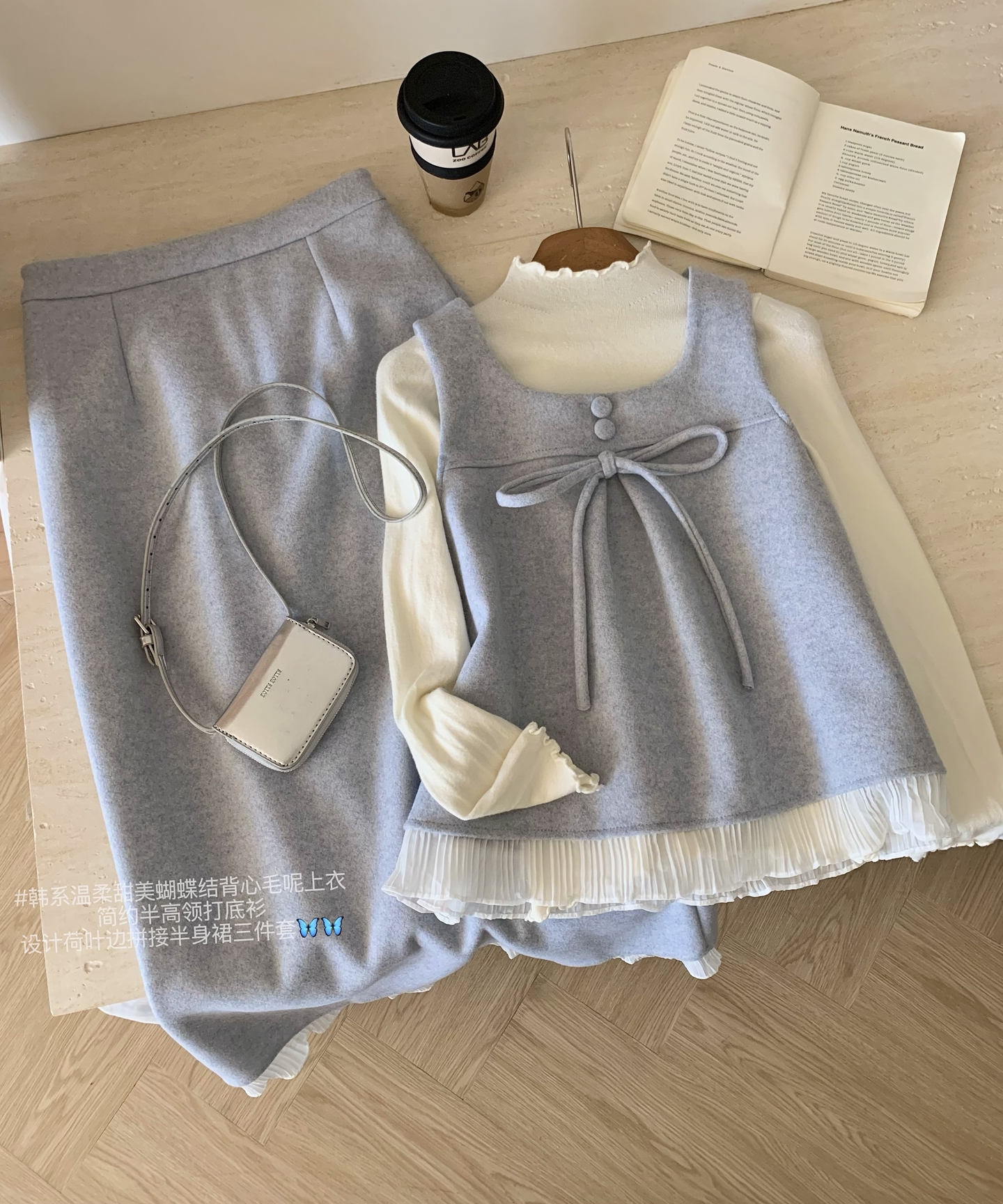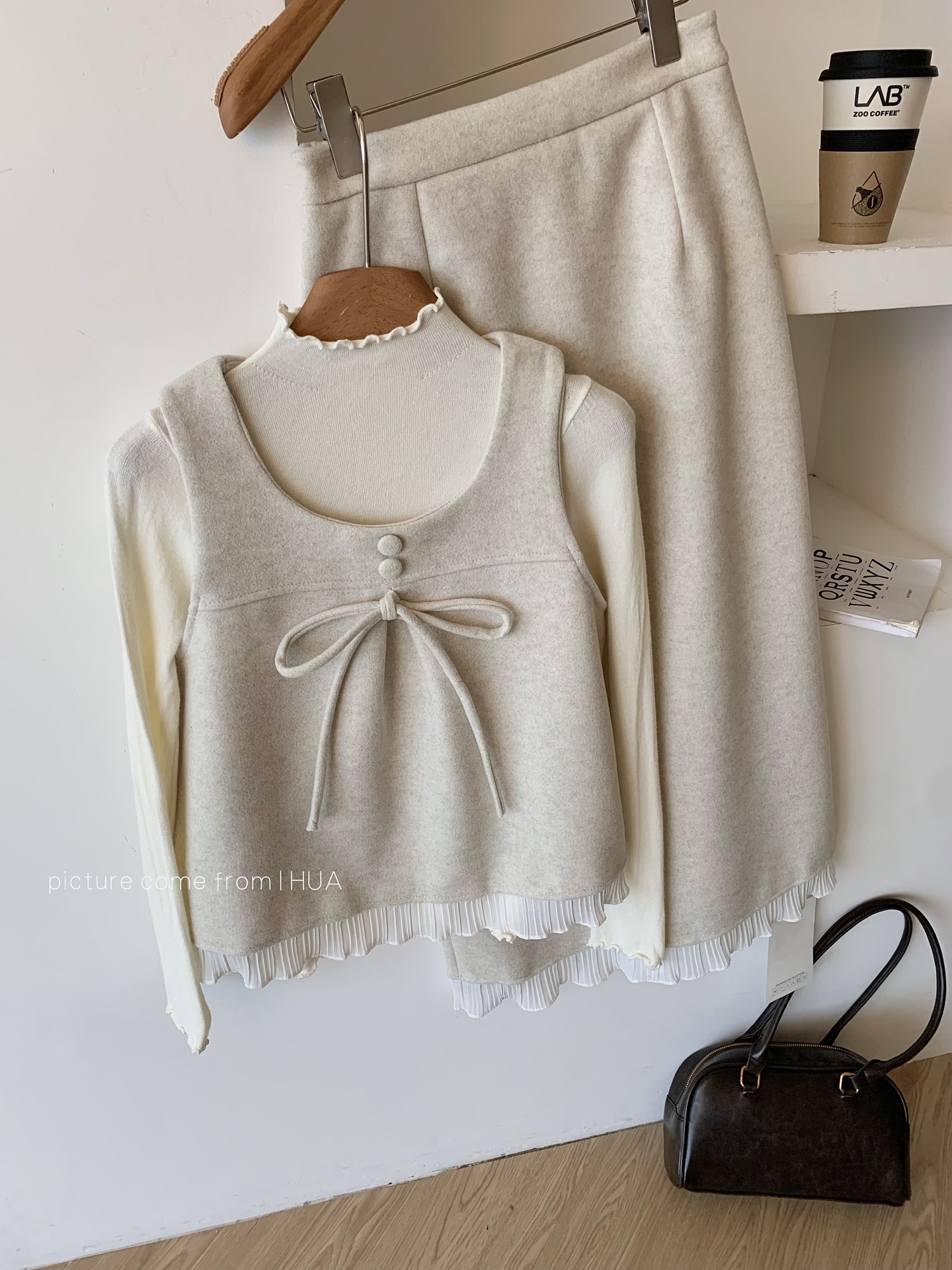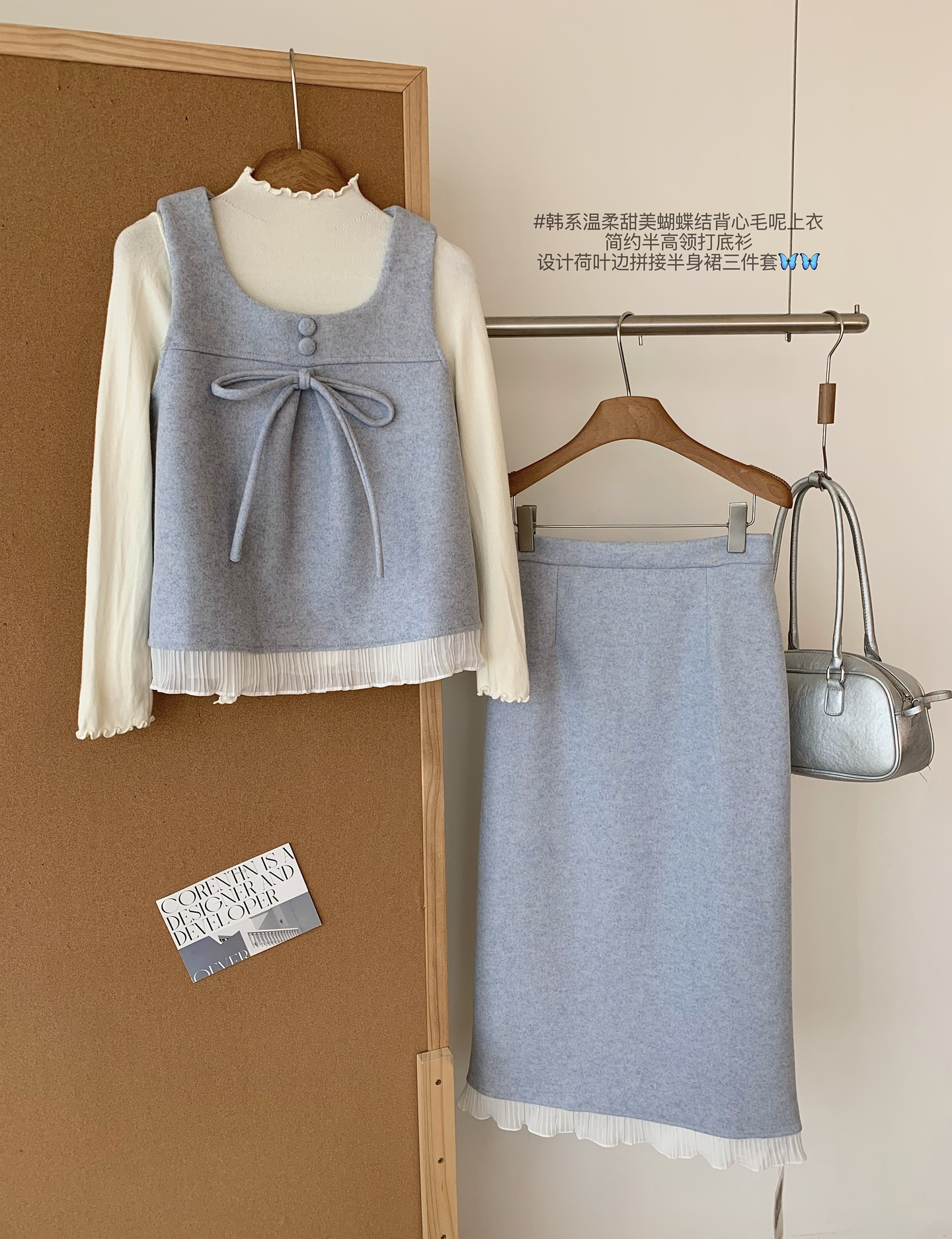 冬季新款蝴蝶结毛呢马甲背心+打底衫+百褶花边半身裙三件套女 服裝批發女裝批發服飾貨源