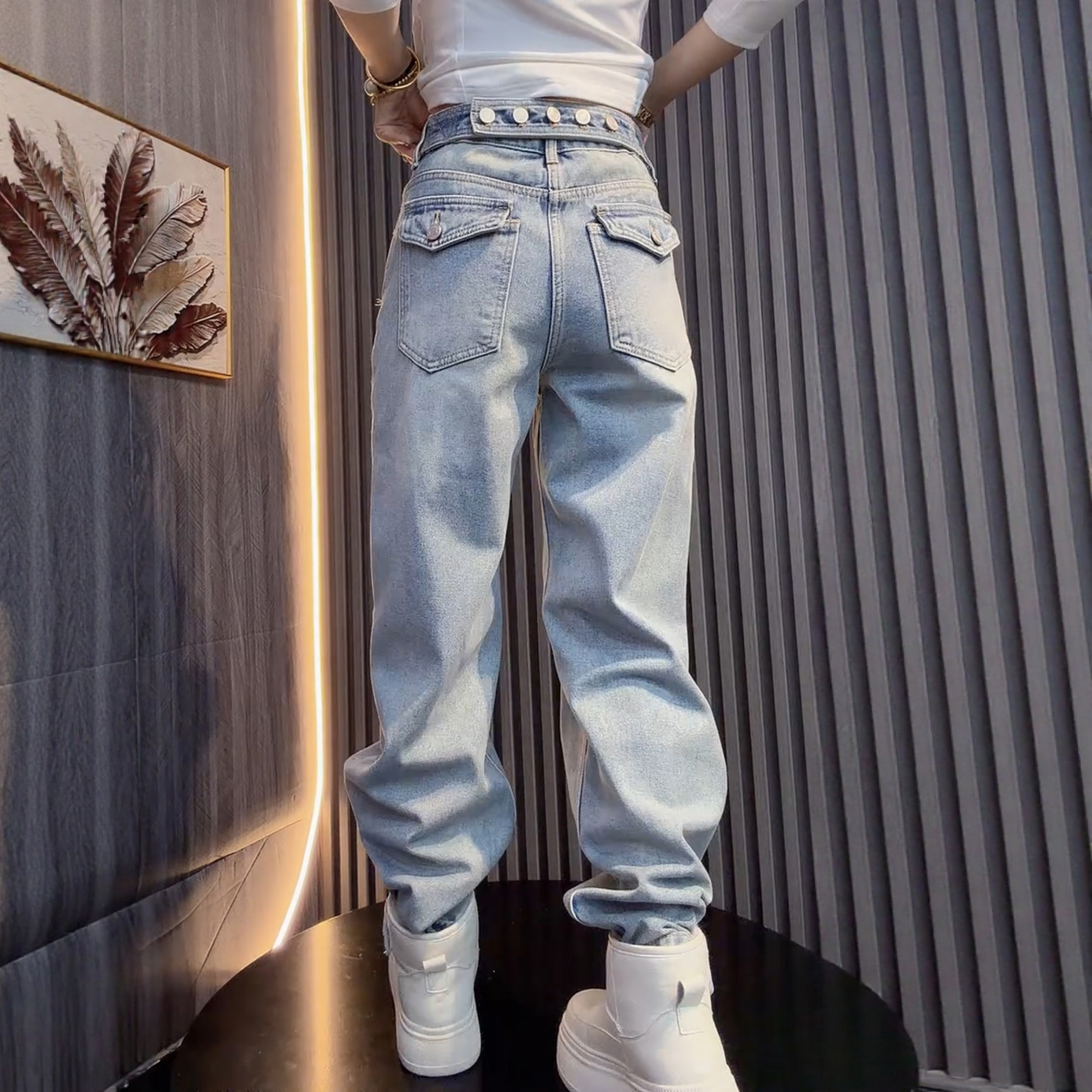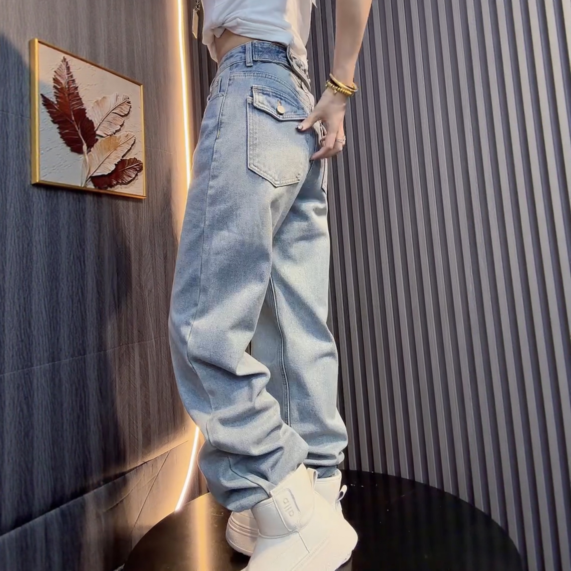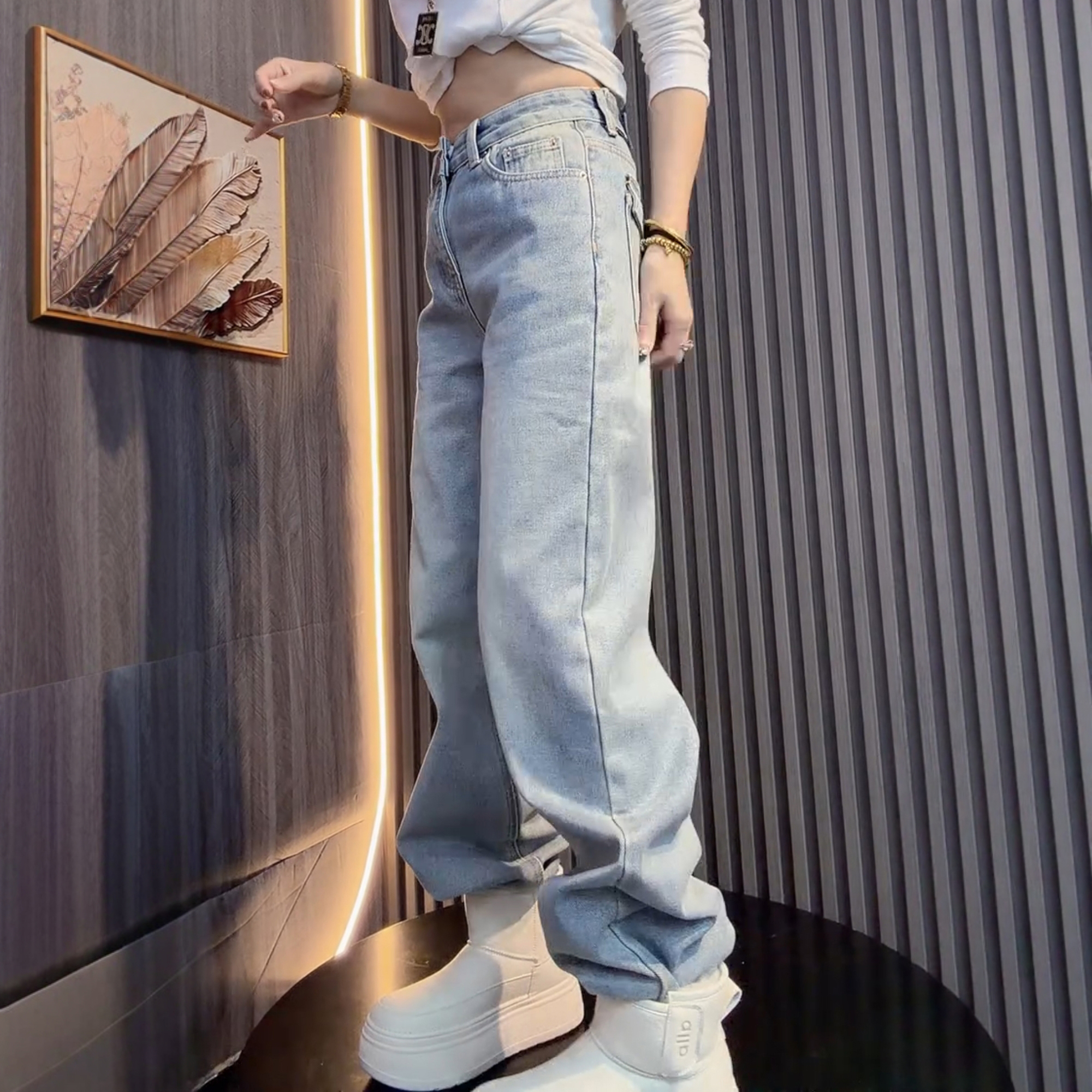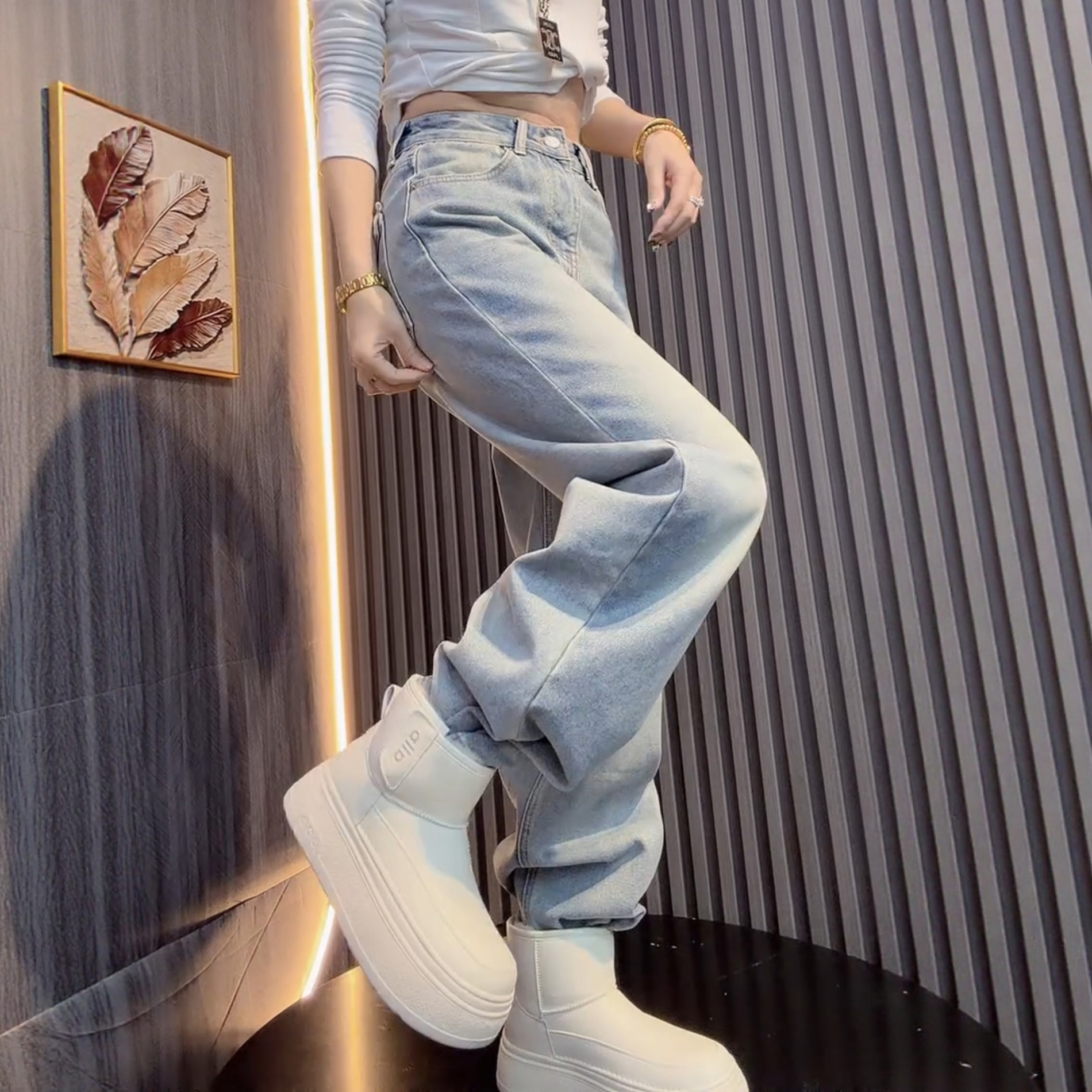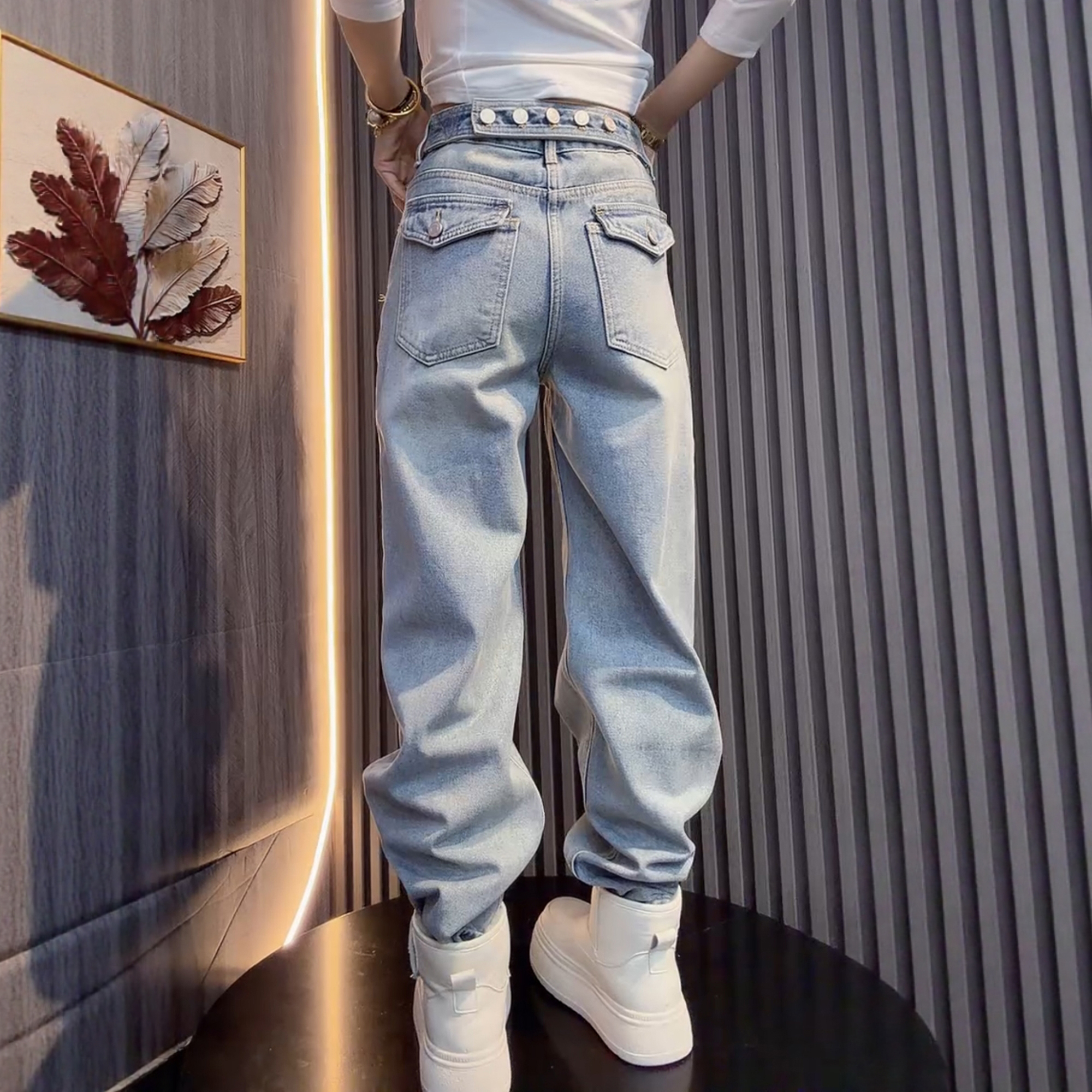FA50701# 秋冬季新款大码高腰显瘦宽松直筒长裤女胖mm加绒加厚后腰扣牛仔裤