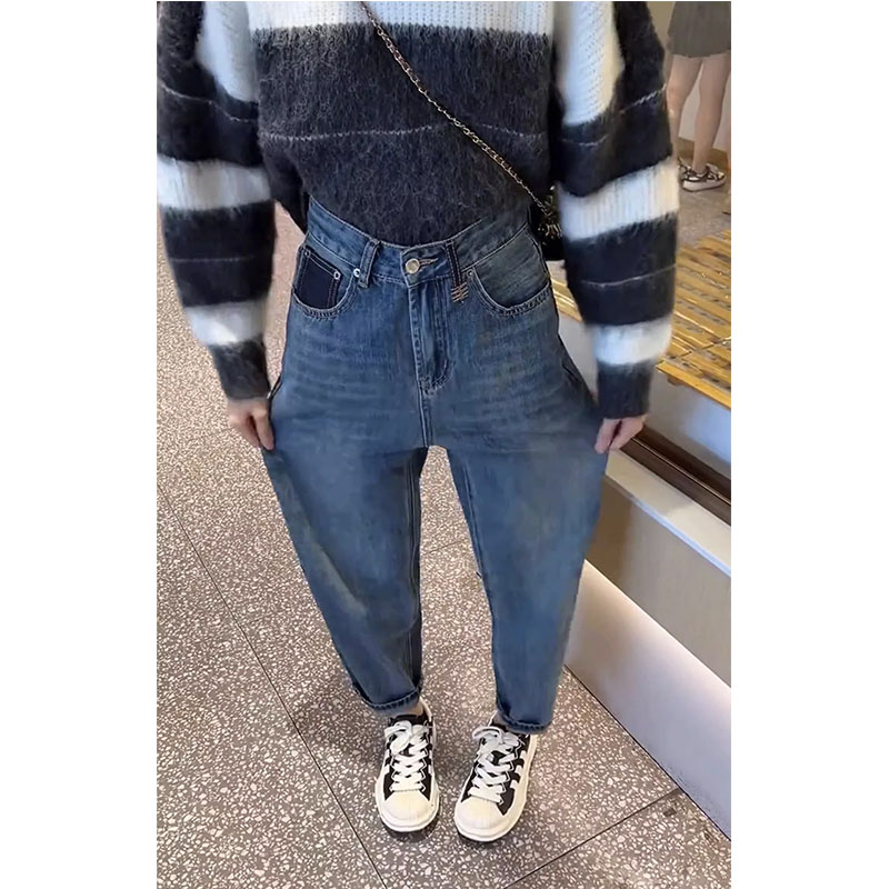 FA51104# 高腰撞色刺绣后袋阔腿牛仔裤女秋新款宽松显瘦直筒拖地长裤子 服裝批發女裝批發服飾貨源