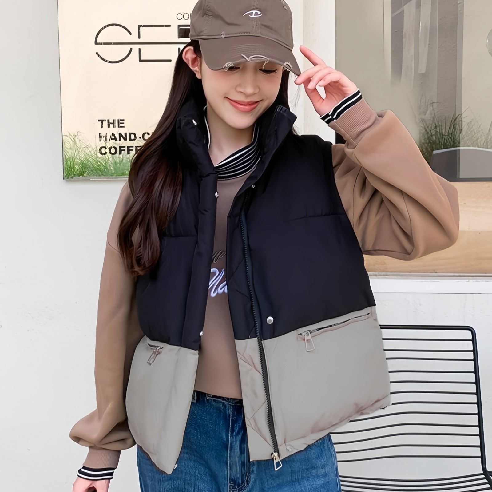FA51105# 韩国ins新款面包服冬季外套小棉袄拼接羽绒棉衣马甲女韩版 服裝批發女裝批發服飾貨源