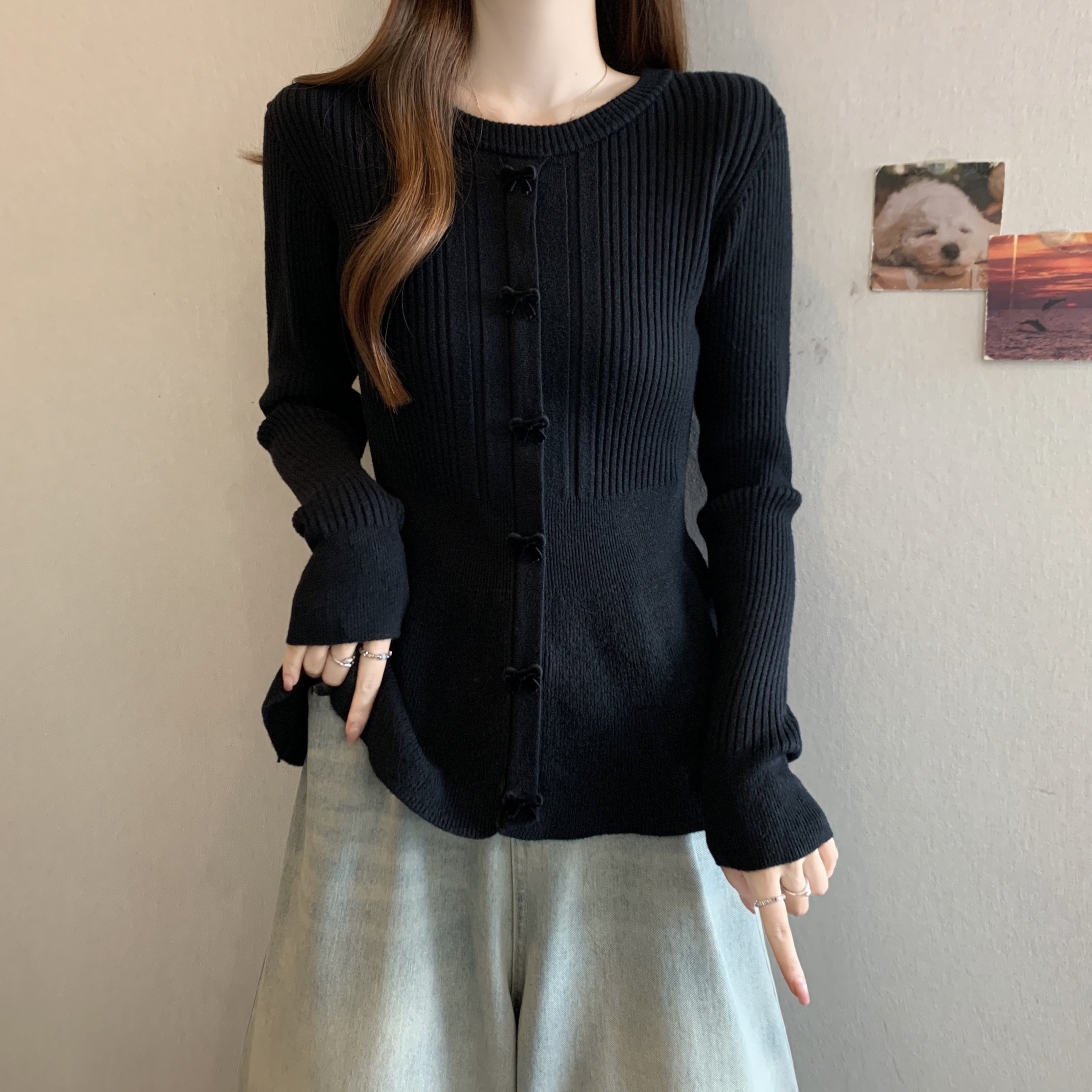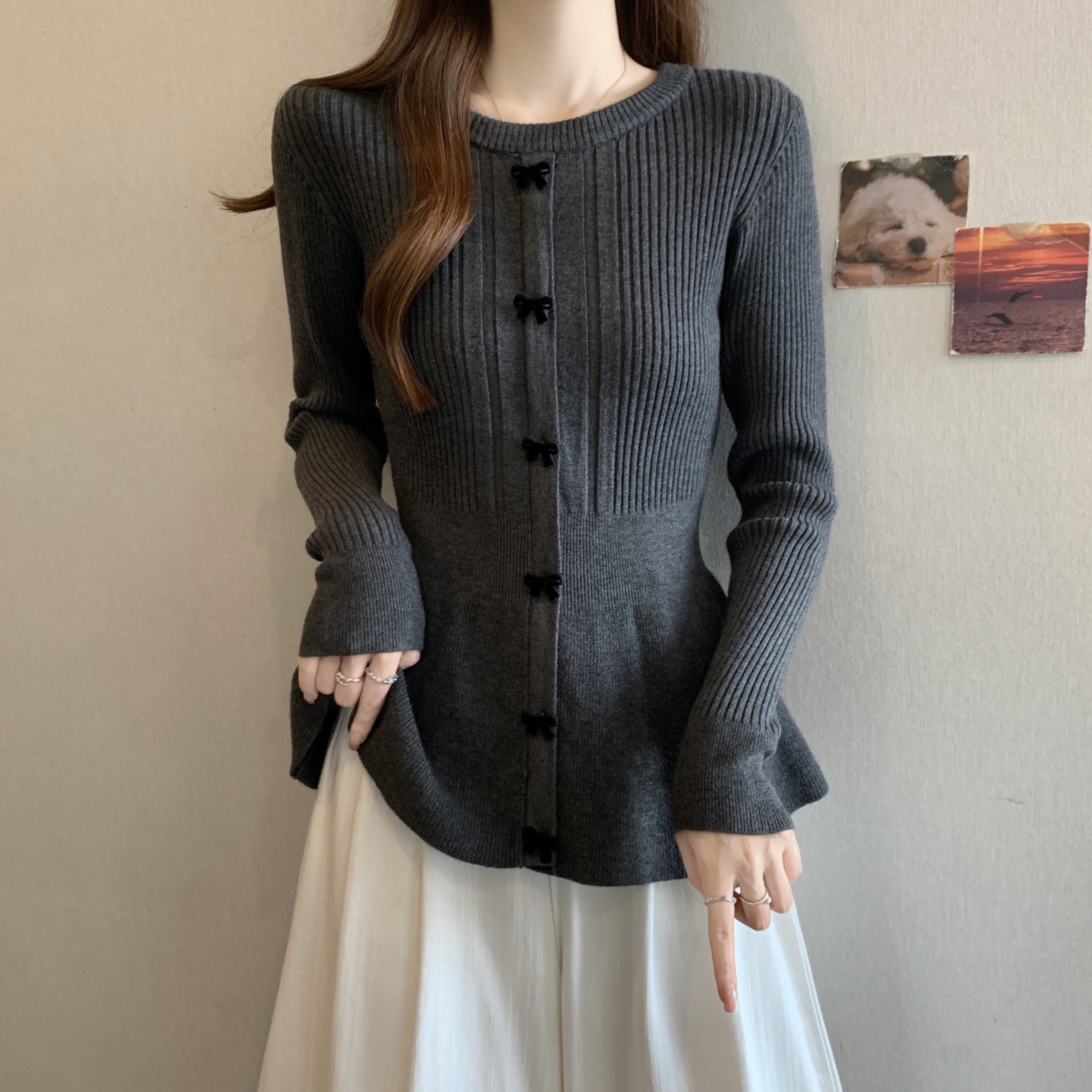 Home > 毛衣、针织衫 > FA51107# 蝴蝶结圆领收腰单排扣长袖针织衫女冬季新款韩版百搭杏色上衣 服裝批發女裝批發服飾貨源