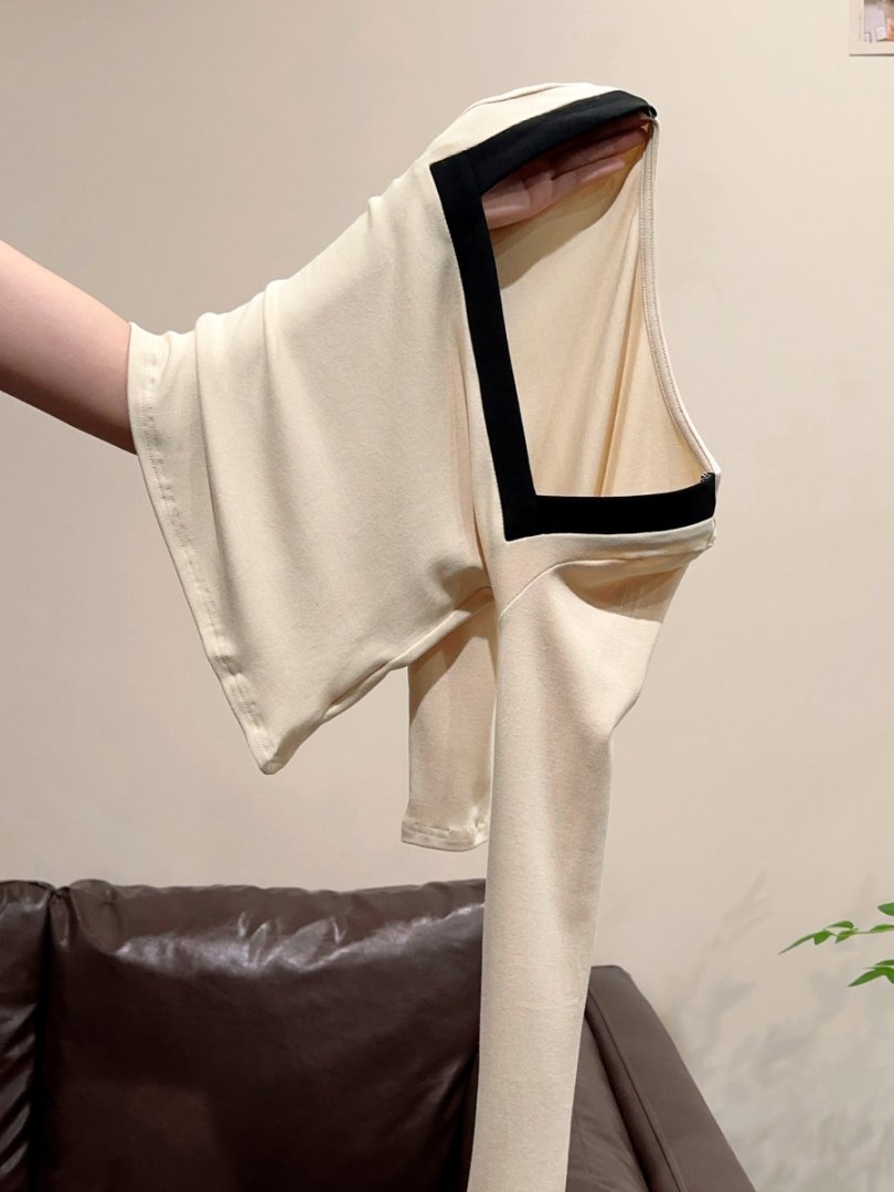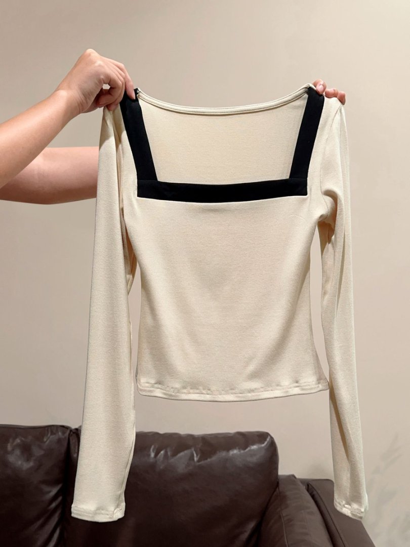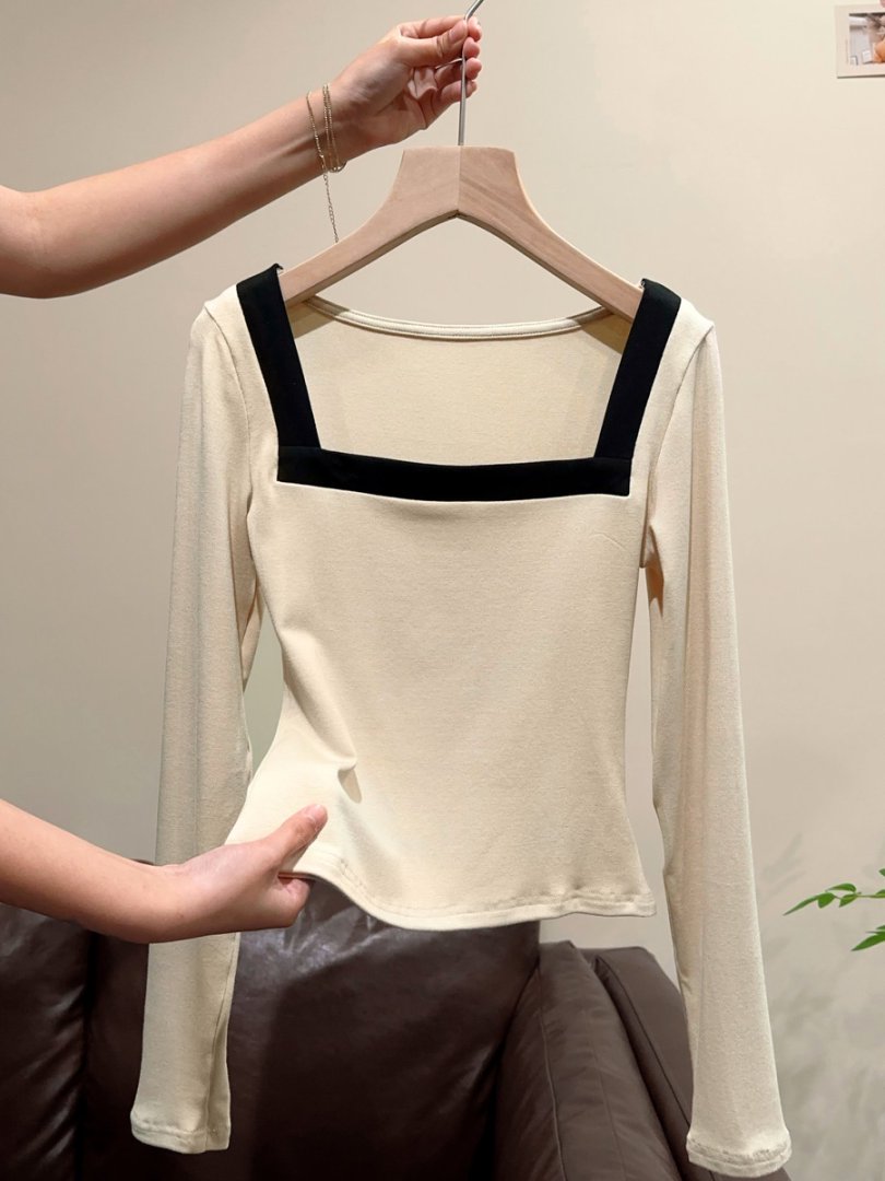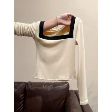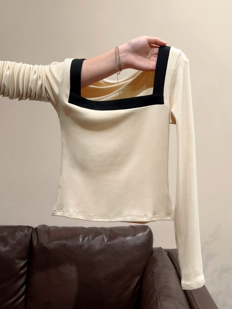 FA51111# 气质温柔风撞色方领长袖打底衫女秋冬新款修身显瘦百搭上衣 服裝批發女裝批發服飾貨源
