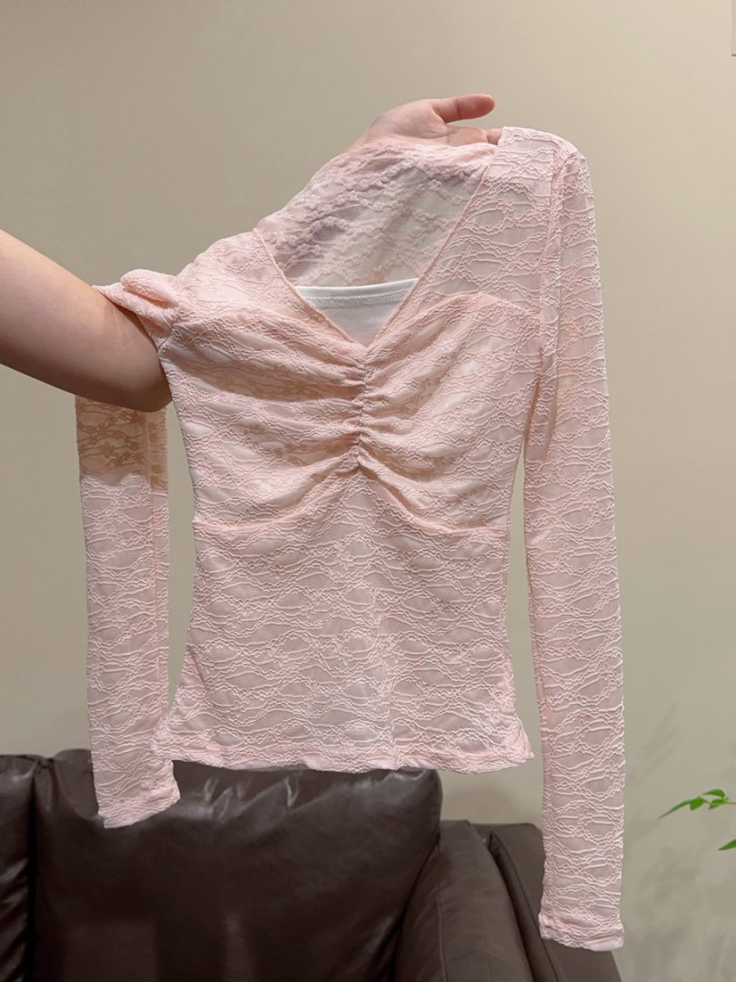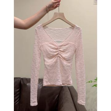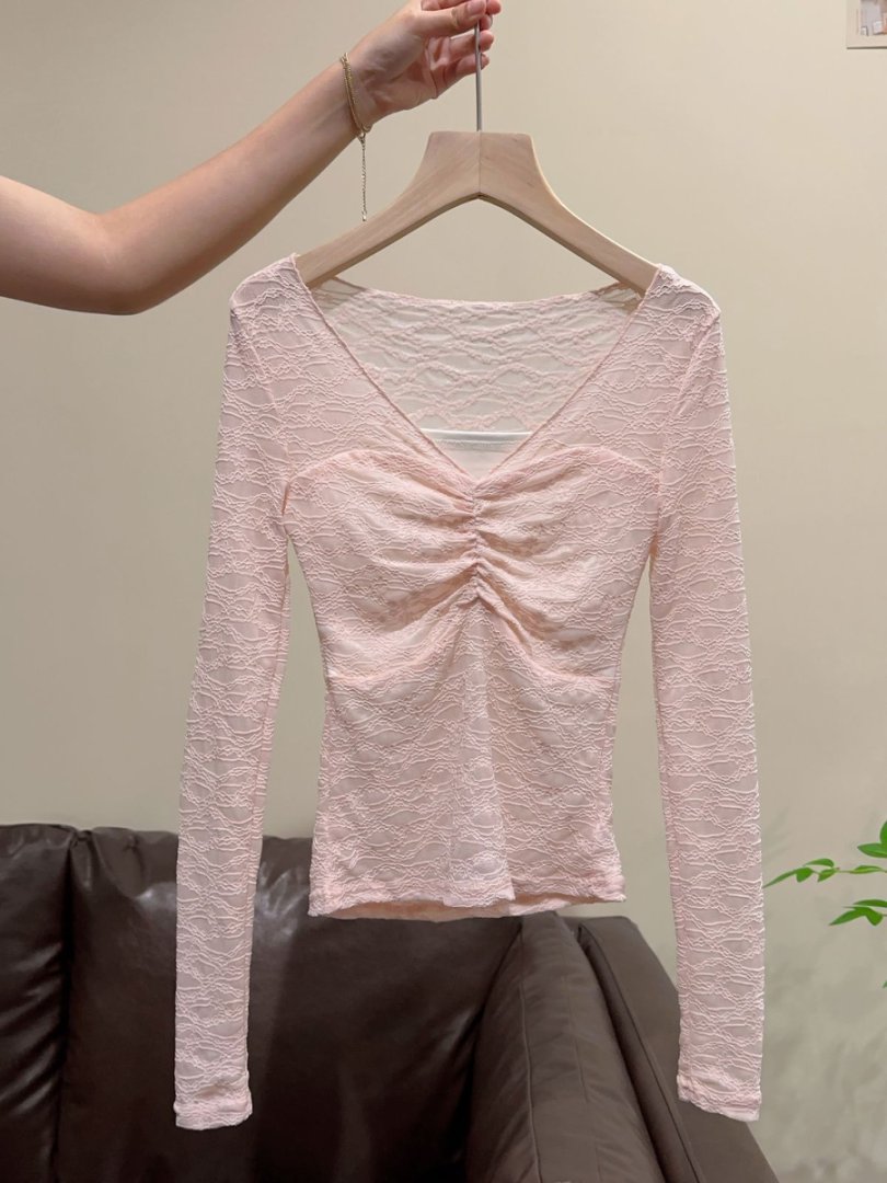 FA51113# 性感辣妹风V领蕾丝拼接打底衫T恤女秋冬新款修身显瘦内搭上衣 服裝批發女裝批發服飾貨源