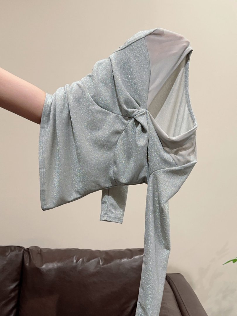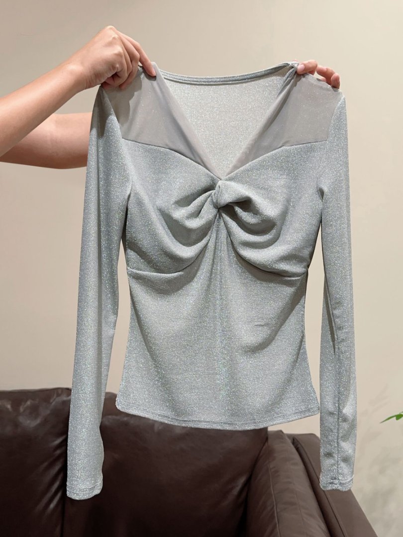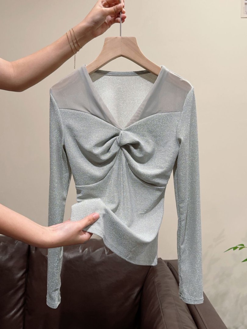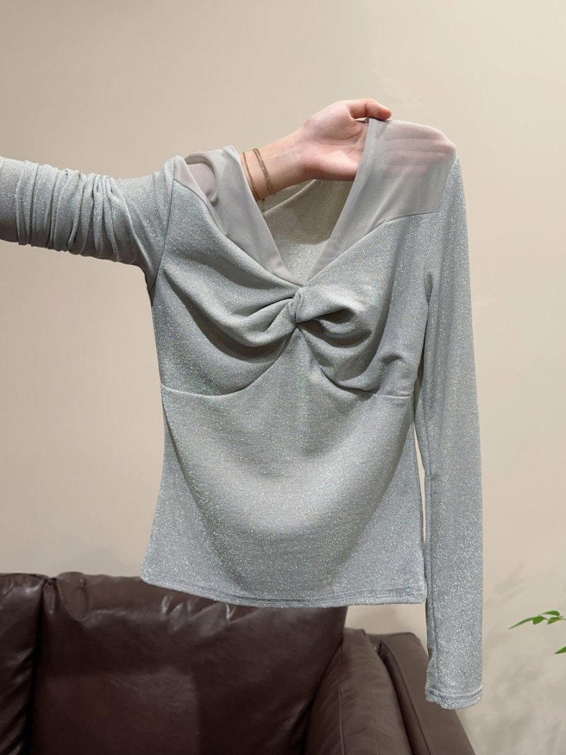 FA51114# 时尚褶皱网纱拼接长袖内搭上衣女秋季新款气质显瘦打底衫T恤 服裝批發女裝批發服飾貨源