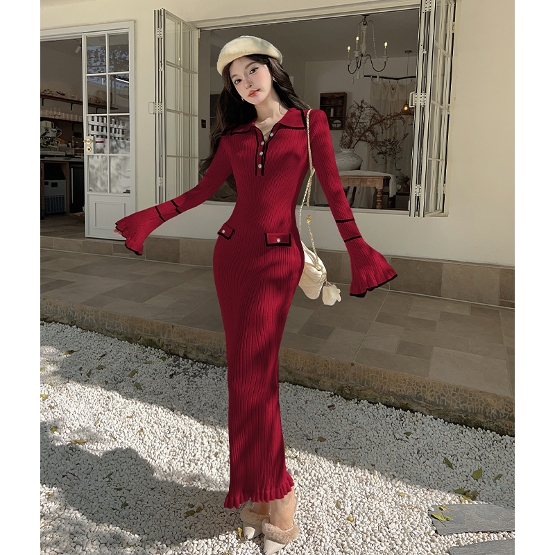 FA51117# 法式轻奢复古荷叶边针织连衣裙女秋冬新翻领撞色修身显瘦过膝长裙 服裝批發女裝批發服飾貨源