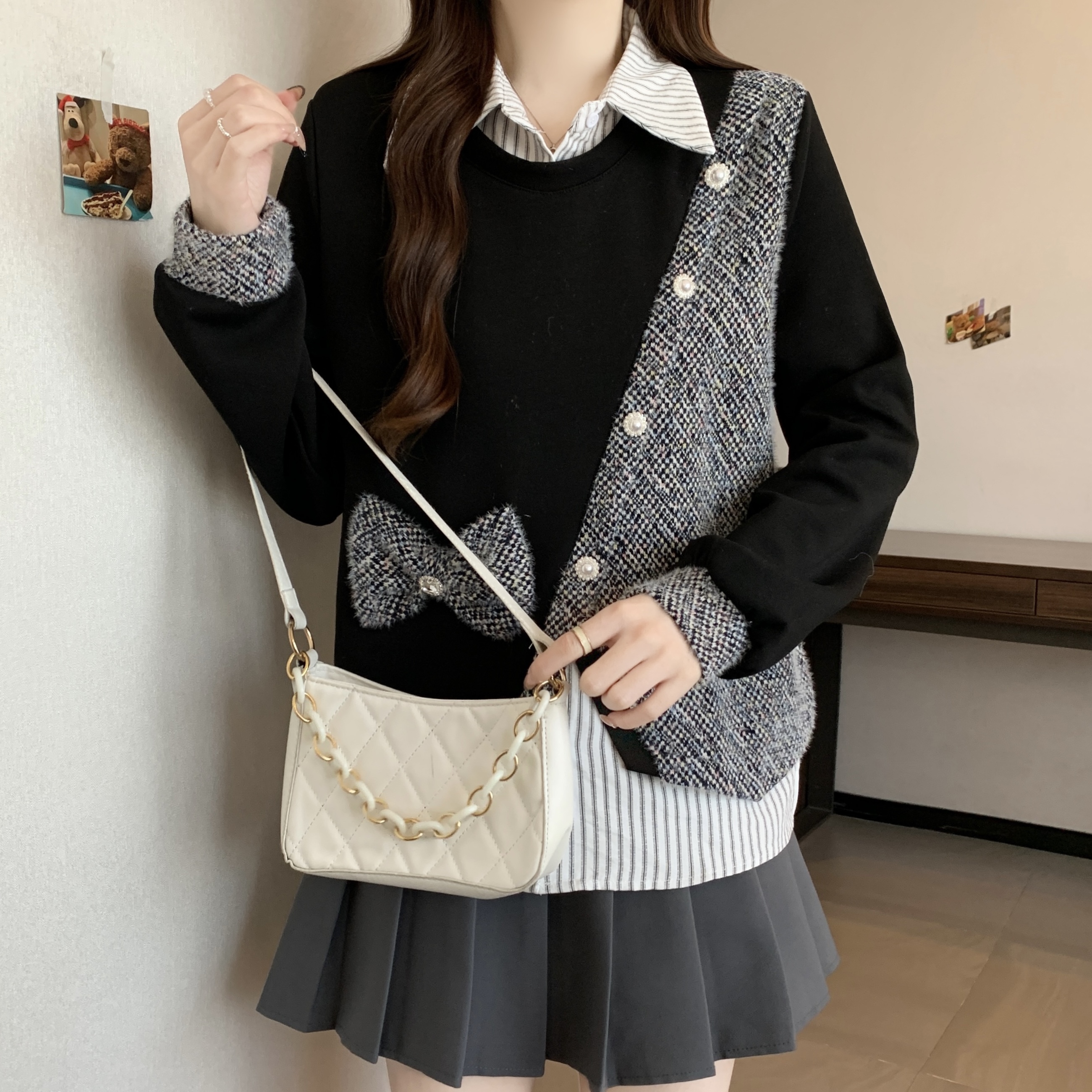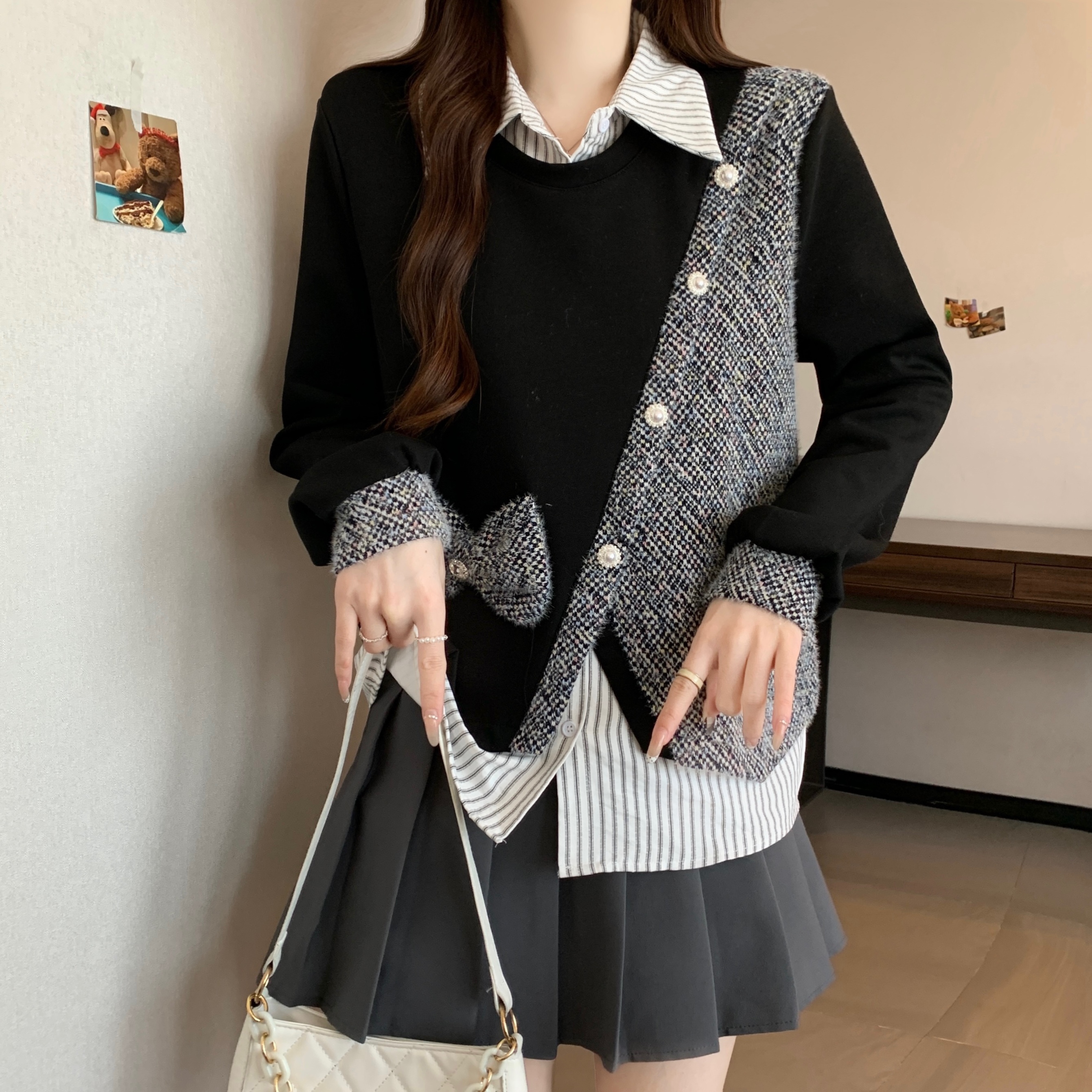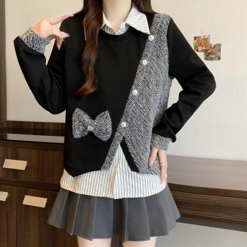 FA51120# 胖mm冬季新款假两件条纹拼接翻领长袖卫衣女减龄显瘦百搭上衣 服裝批發女裝批發服飾貨源