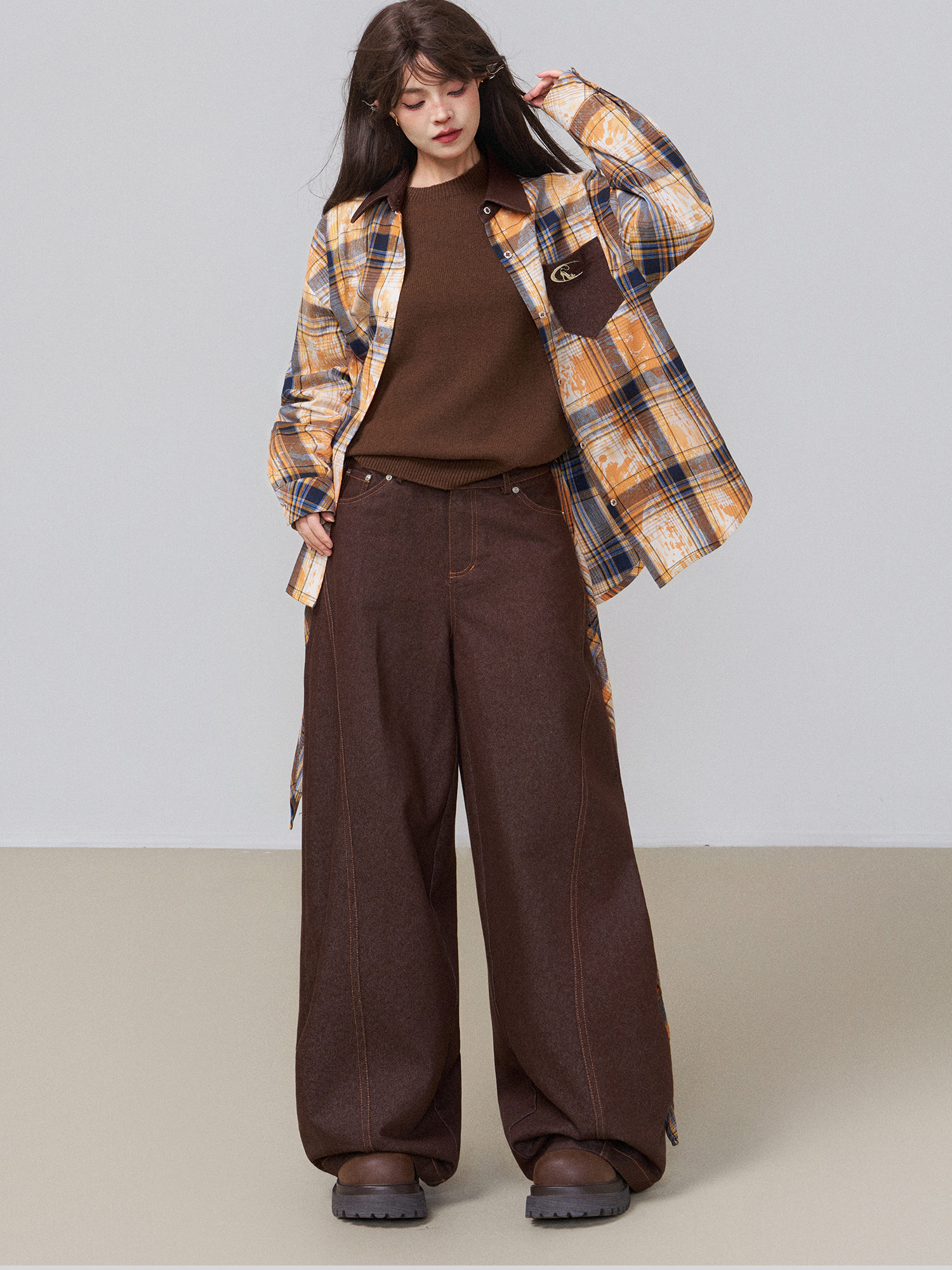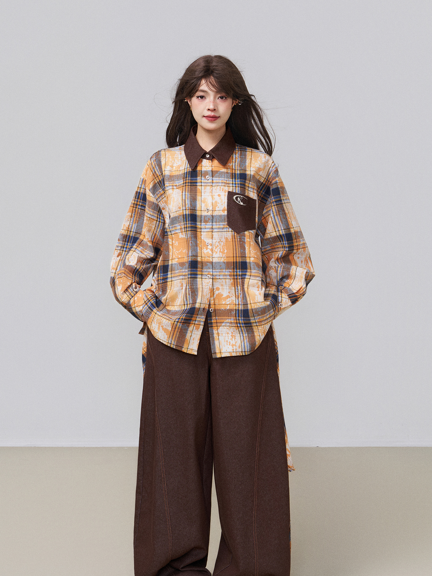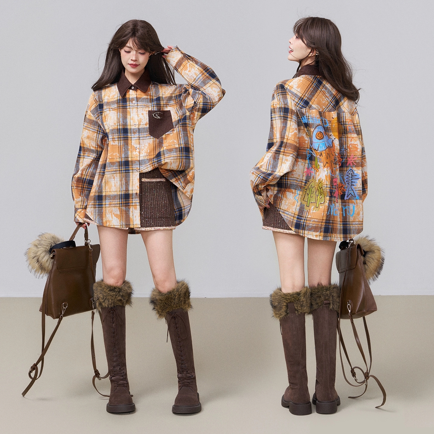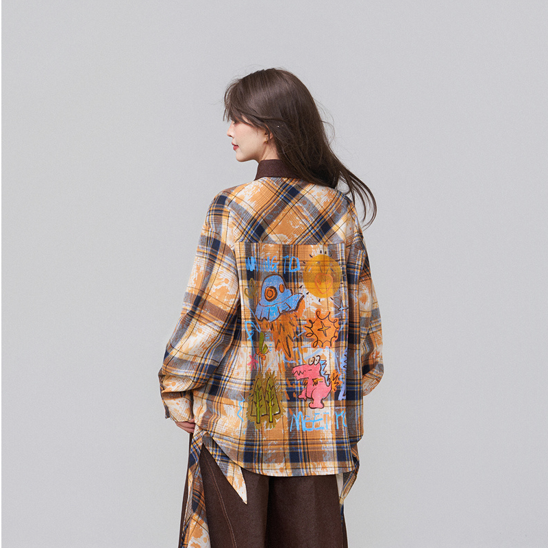 FA51127# 韩国chic秋季格纹长袖衬衫女元气感涂鸦印花撞色翻领外套上衣 服裝批發女裝批發服飾貨源