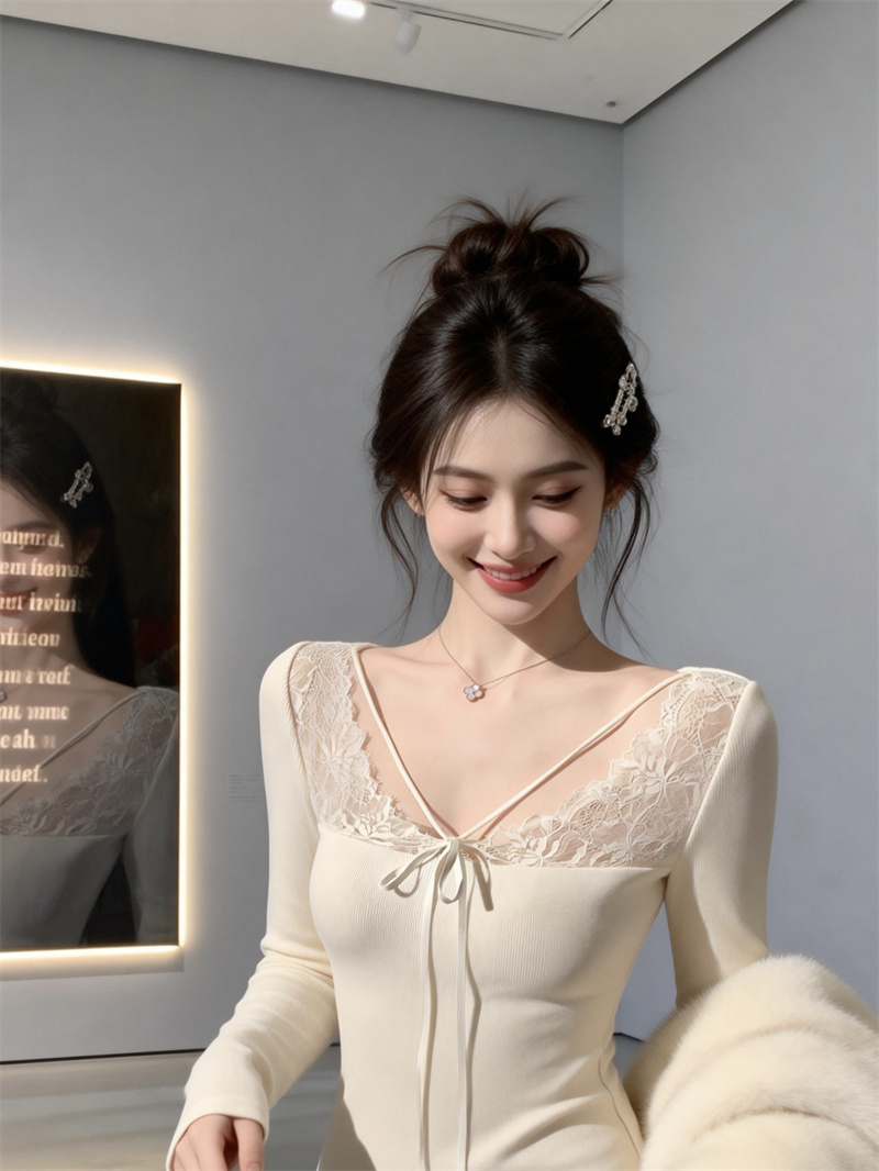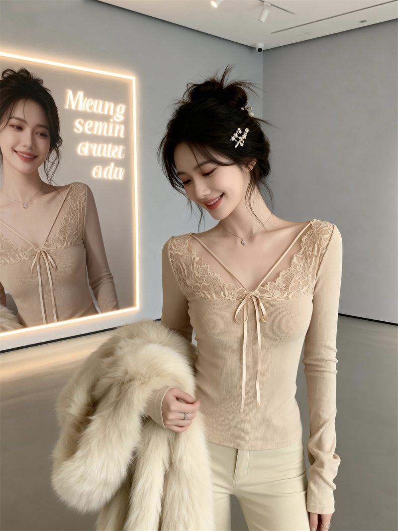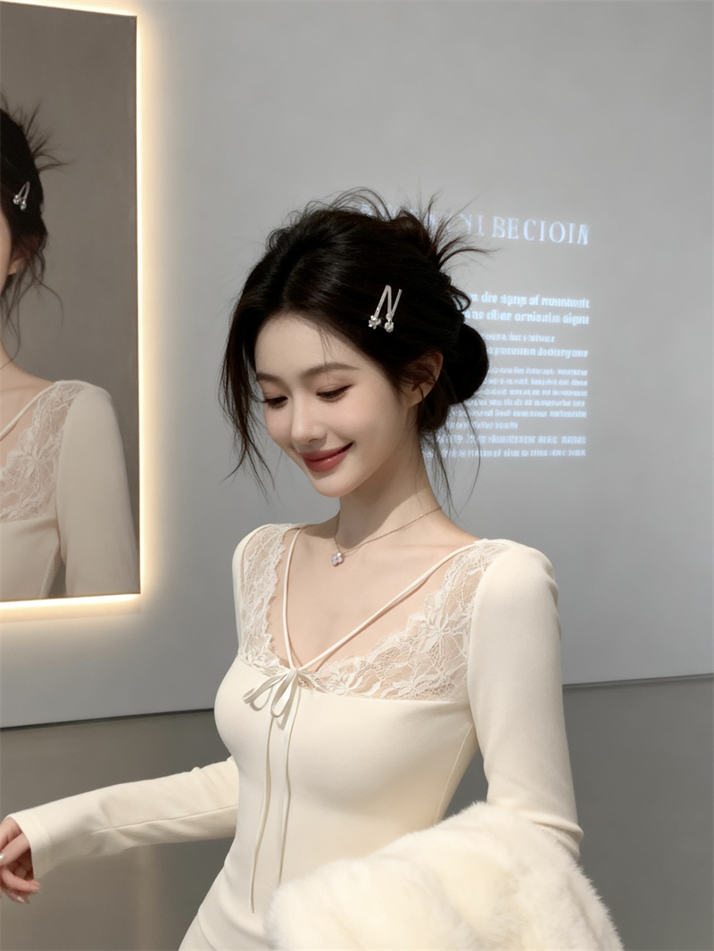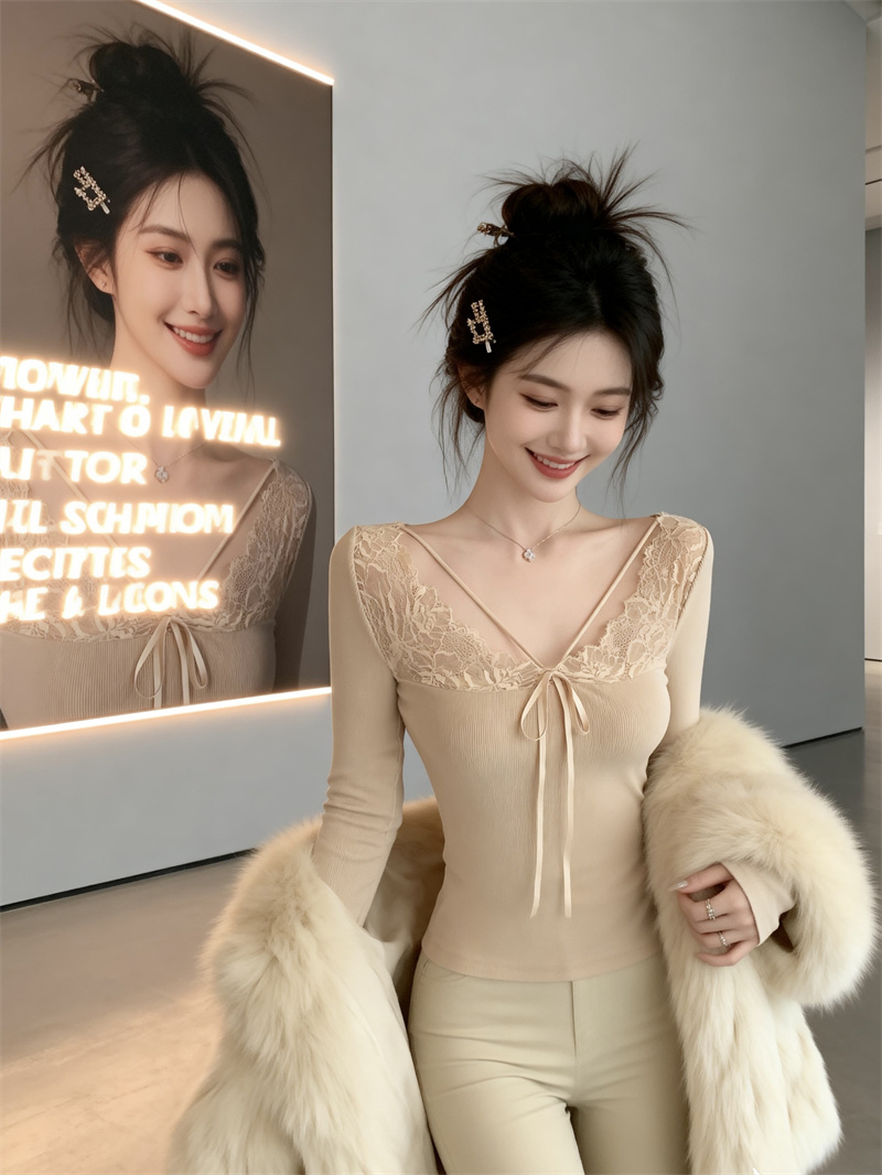 FA51134# 春季嗲欲辣妹性感蕾丝V领拼接长袖T恤女士内搭打底上衣 服裝批發女裝批發服飾貨源