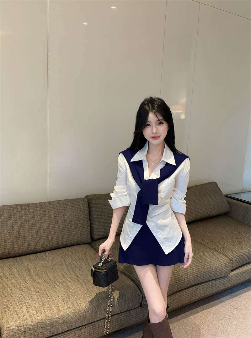白衬衫加藏蓝披肩
