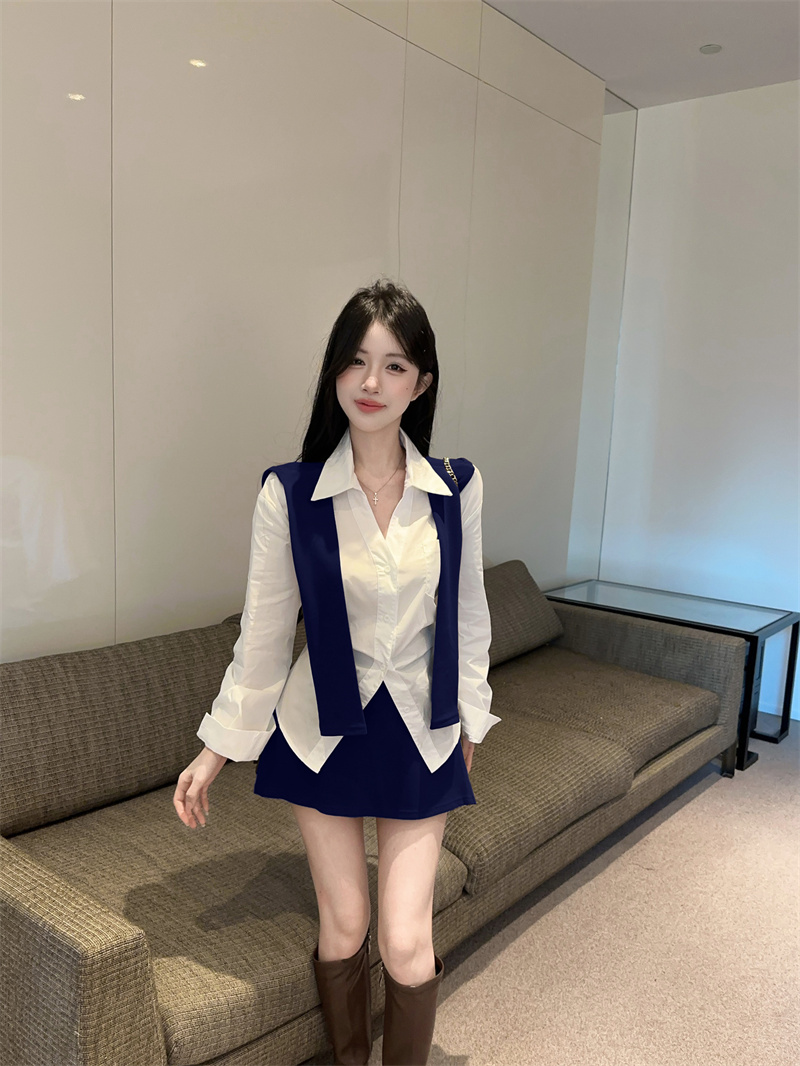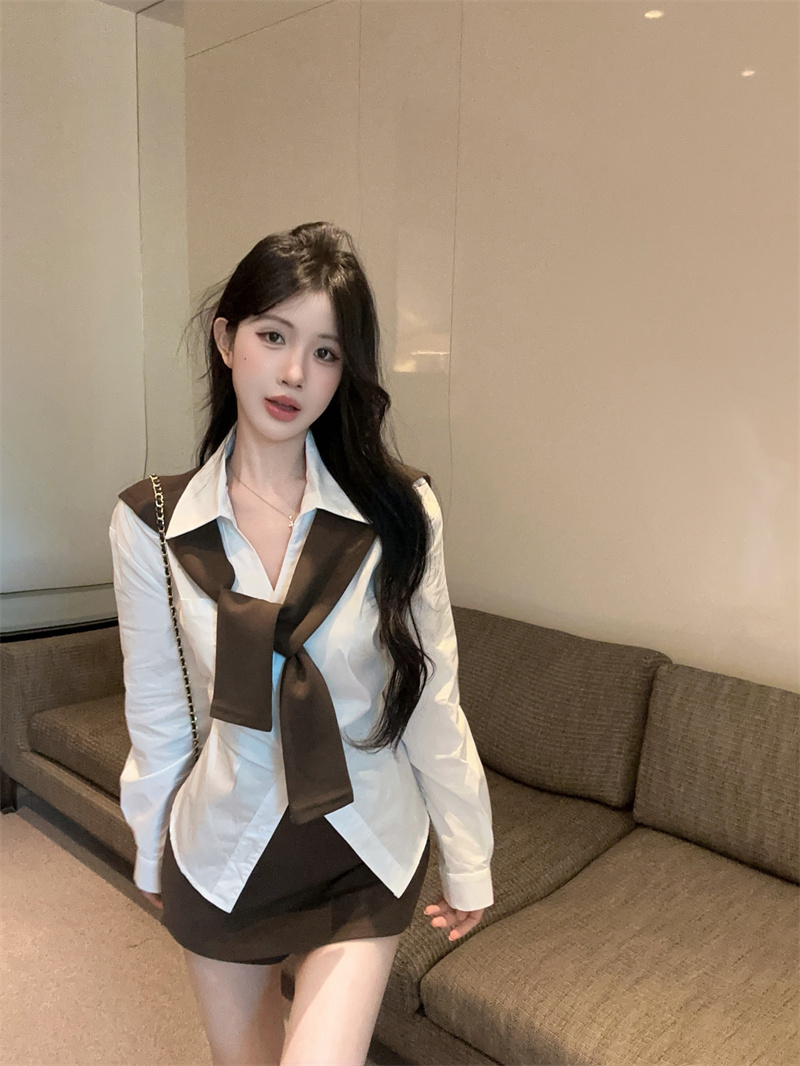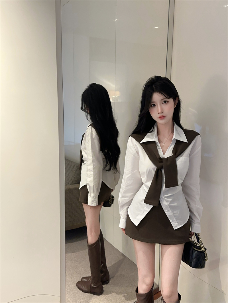 FA51138# 春款收腰设计长袖衬衫+披肩+多穿法包臀半身裙三件套女 服裝批發女裝批發服飾貨源