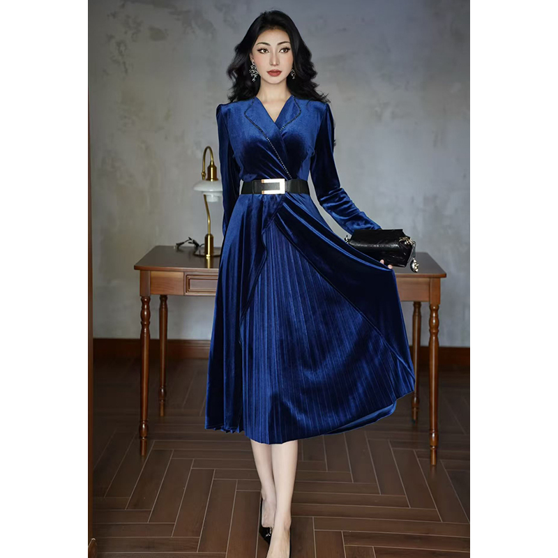 FA51142# 金丝绒连衣裙女秋冬新款法式高级感气质V领长袖收腰显瘦百褶长裙 服裝批發女裝批發服飾貨源