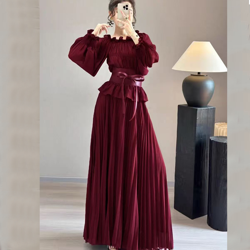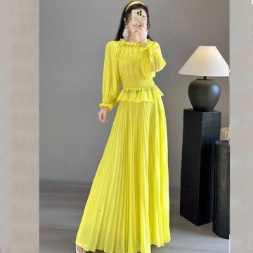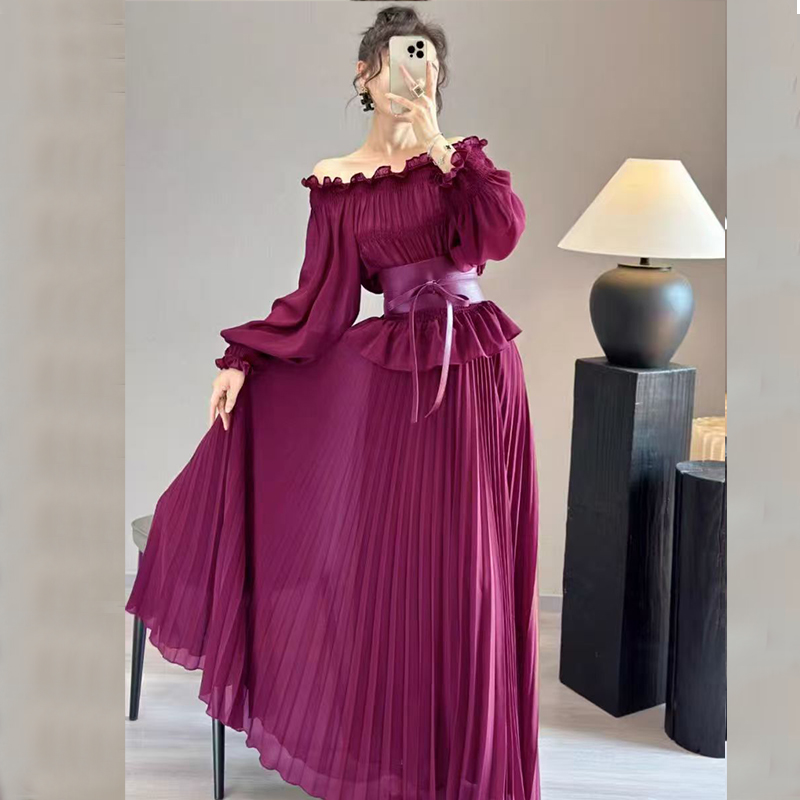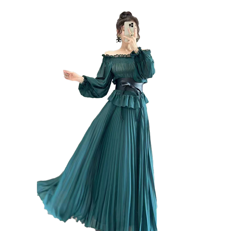 FA51143# 高端雪纺连衣裙女夏新款长袖气质收腰海边度假大摆长裙沙滩裙 服裝批發女裝批發服飾貨源