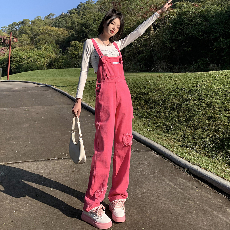 FA51235# 美式复古牛仔背带裤女秋季ins新款韩系宽松减龄小个子阔腿连体裤 服裝批發女裝批發服飾貨源