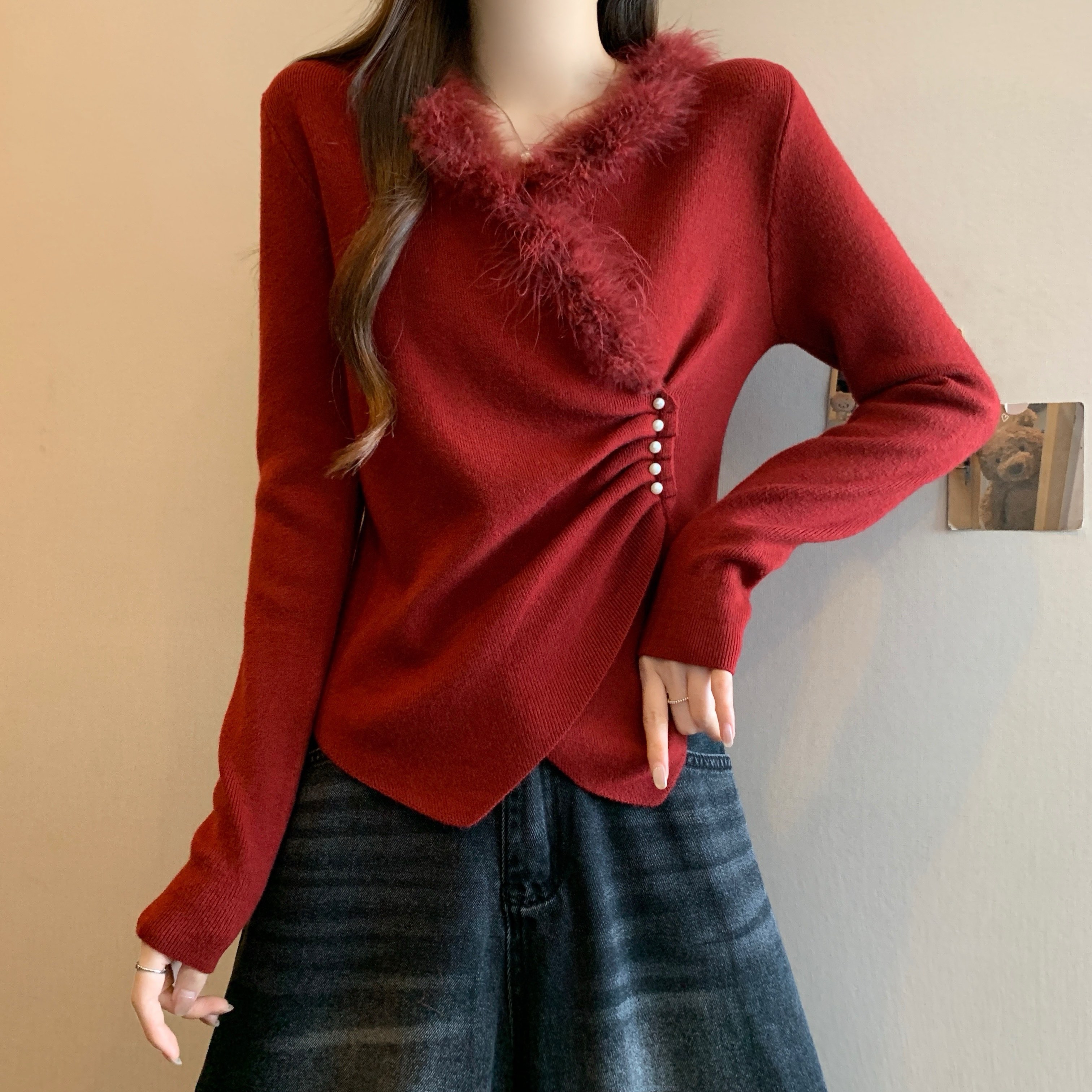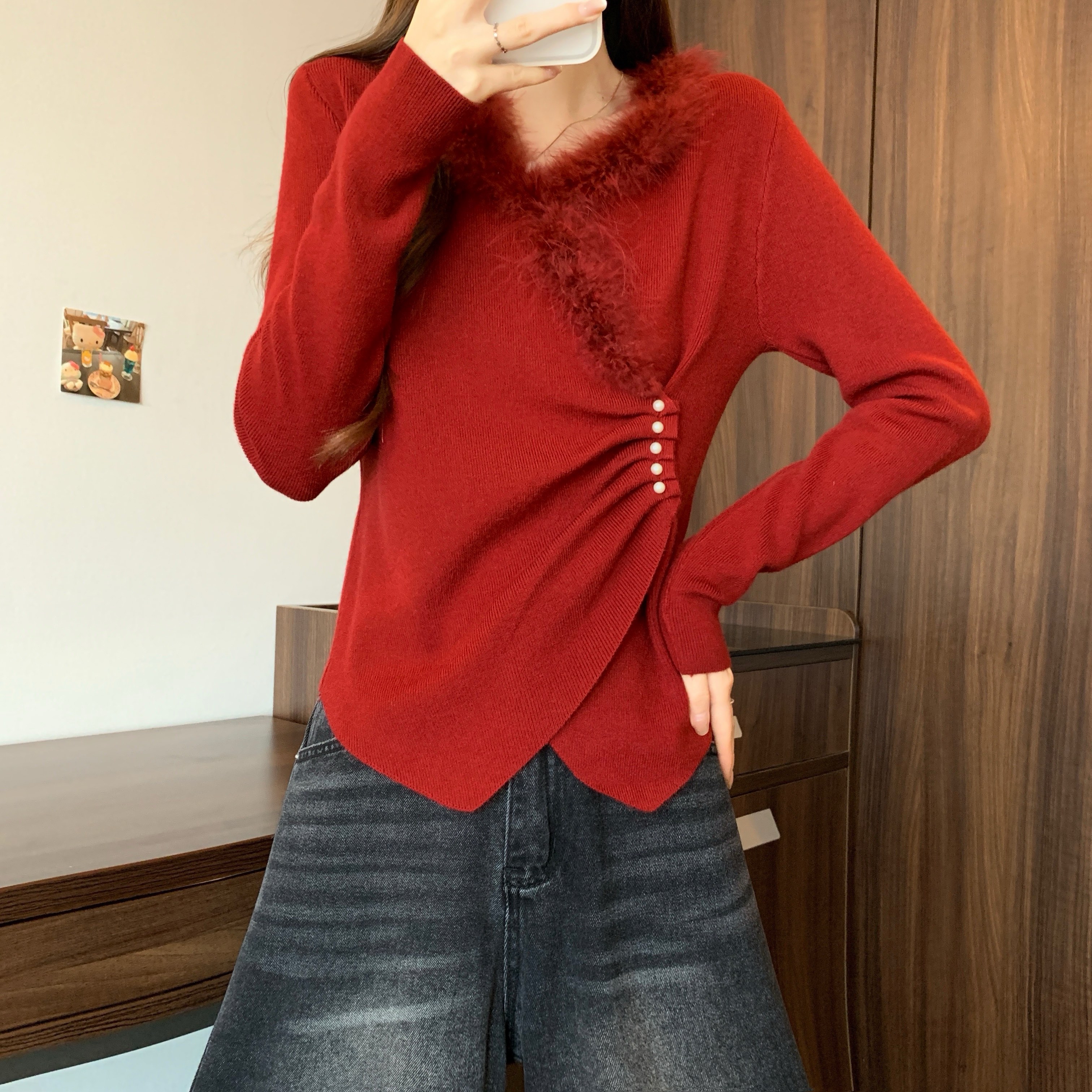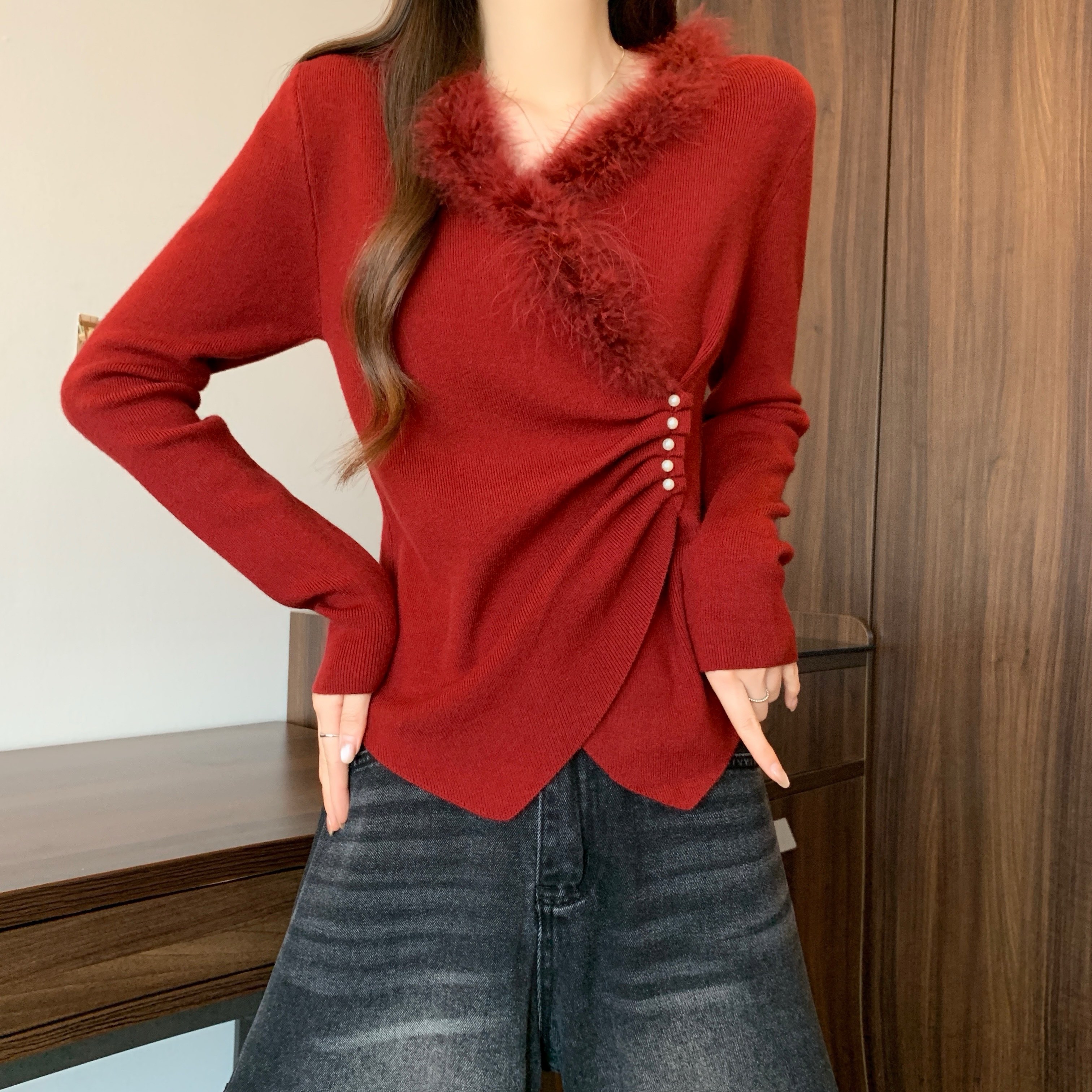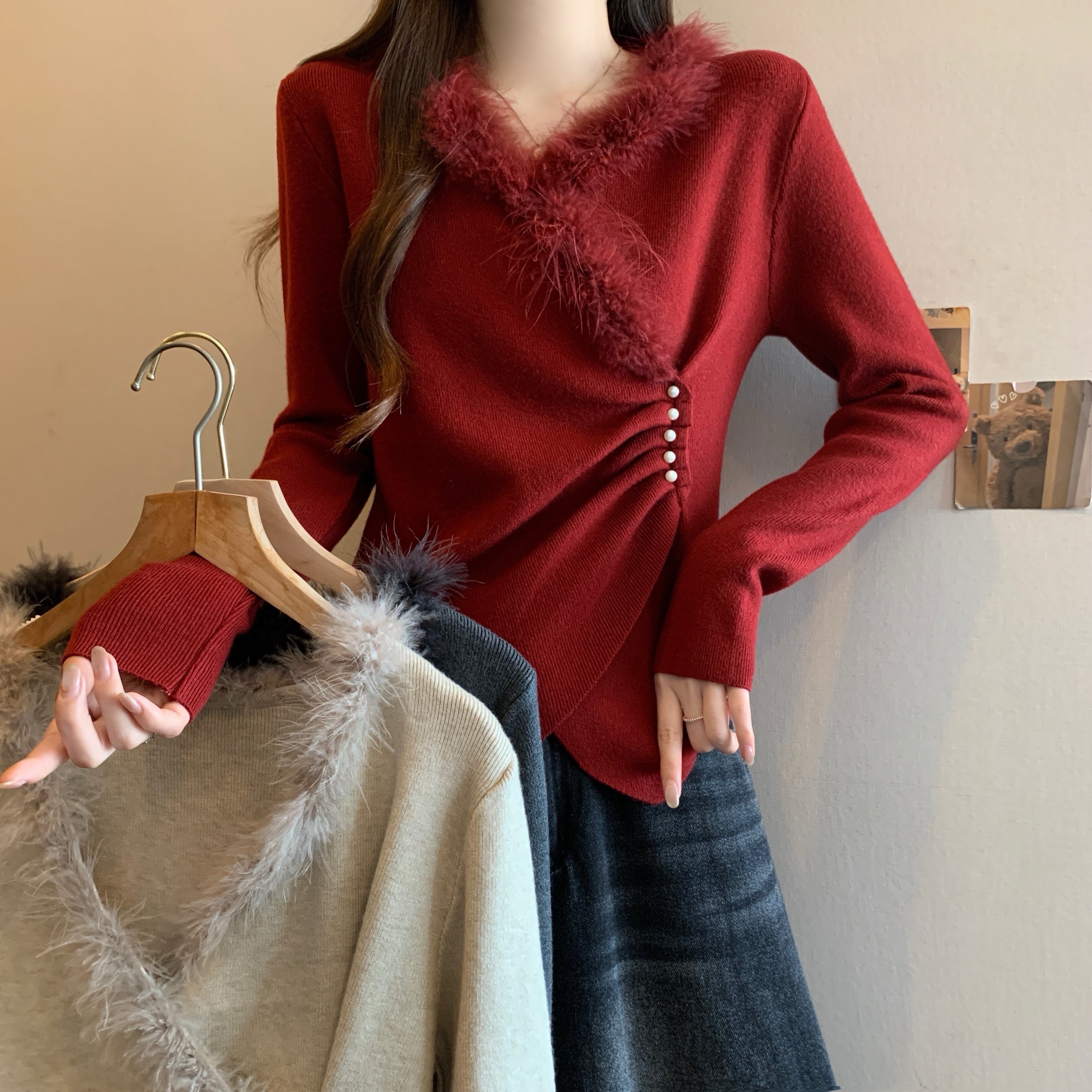 FA51977# 大码秋冬V领毛衣内搭针织衫打底衫女胖MM兔毛高级感收腰上衣 服裝批發女裝批發服飾貨源
