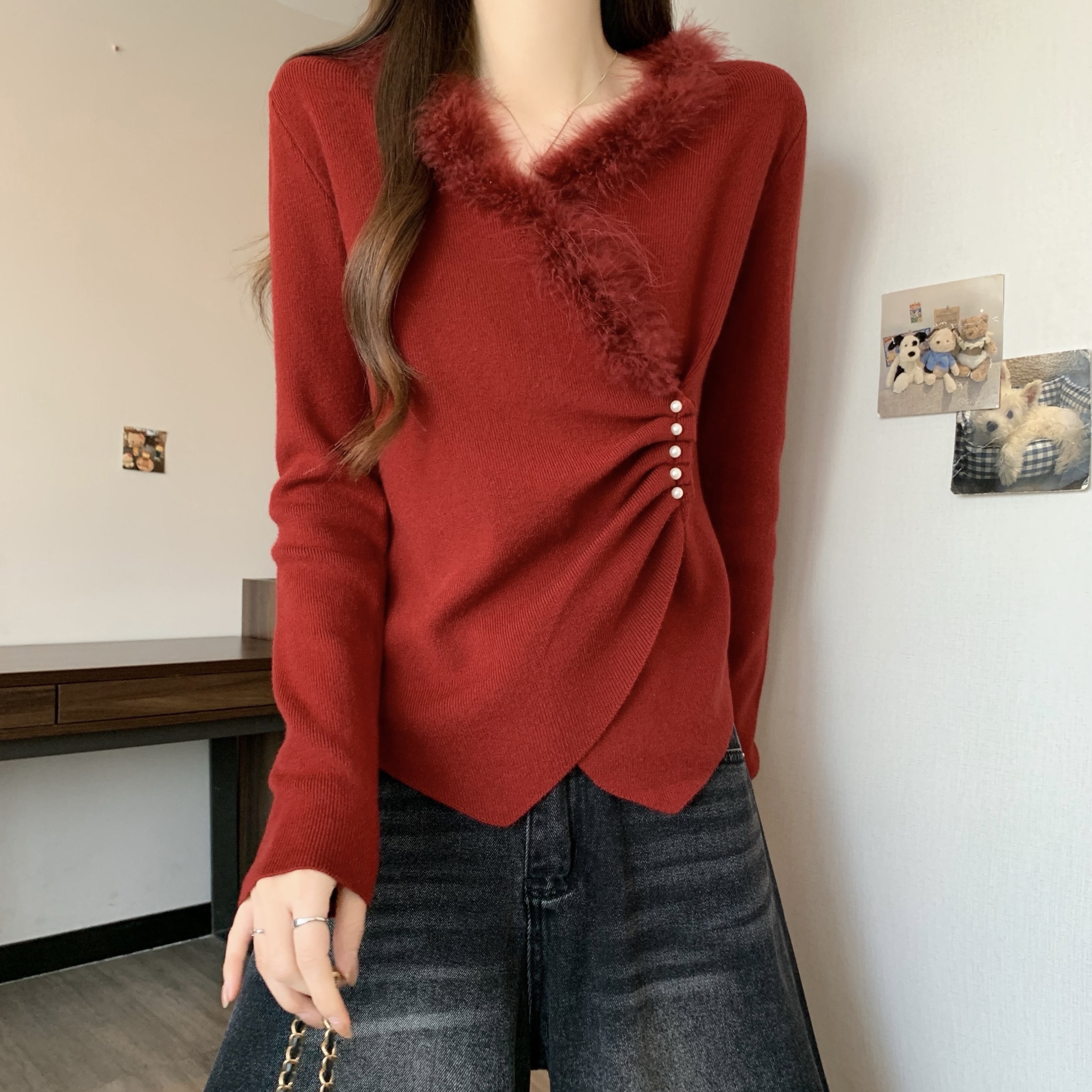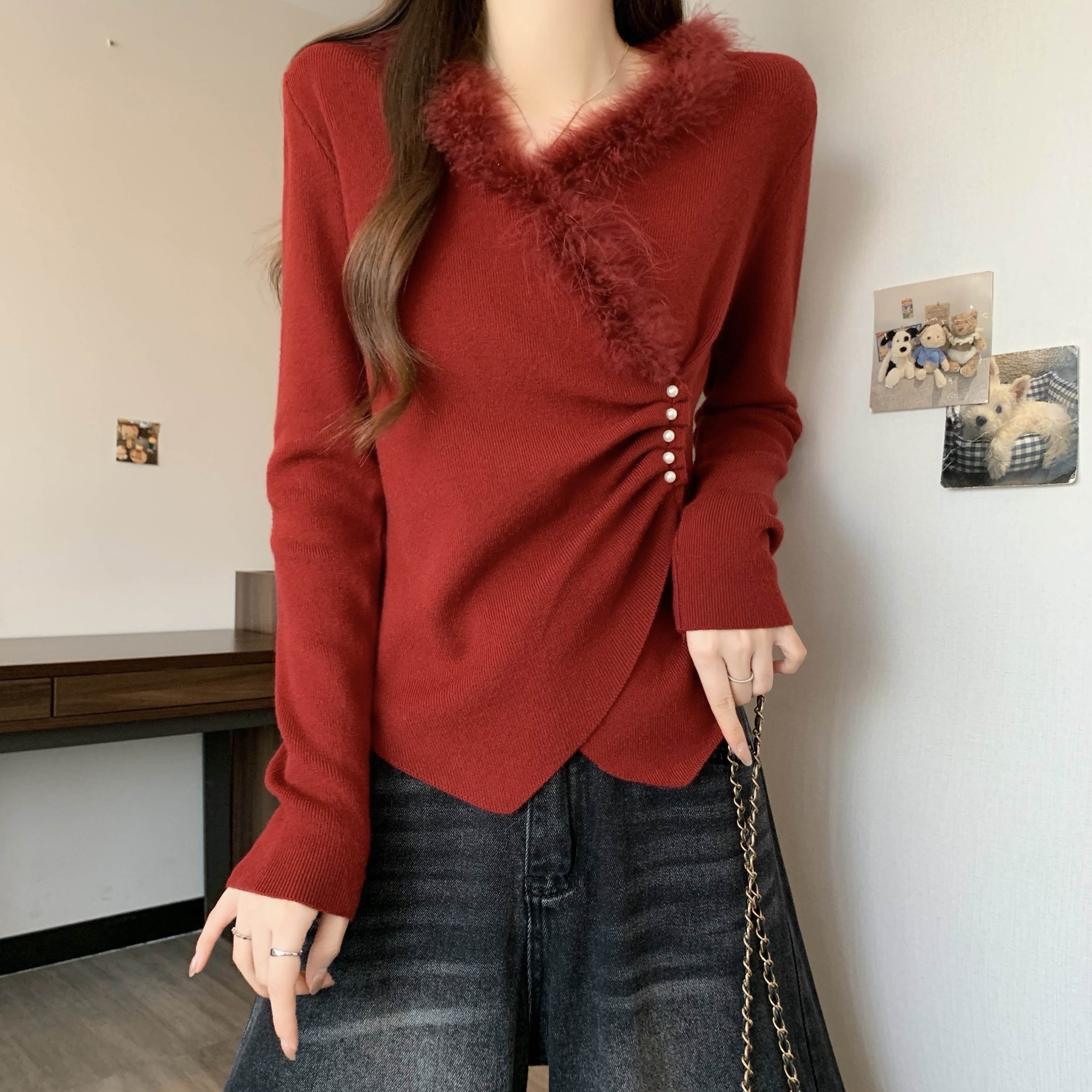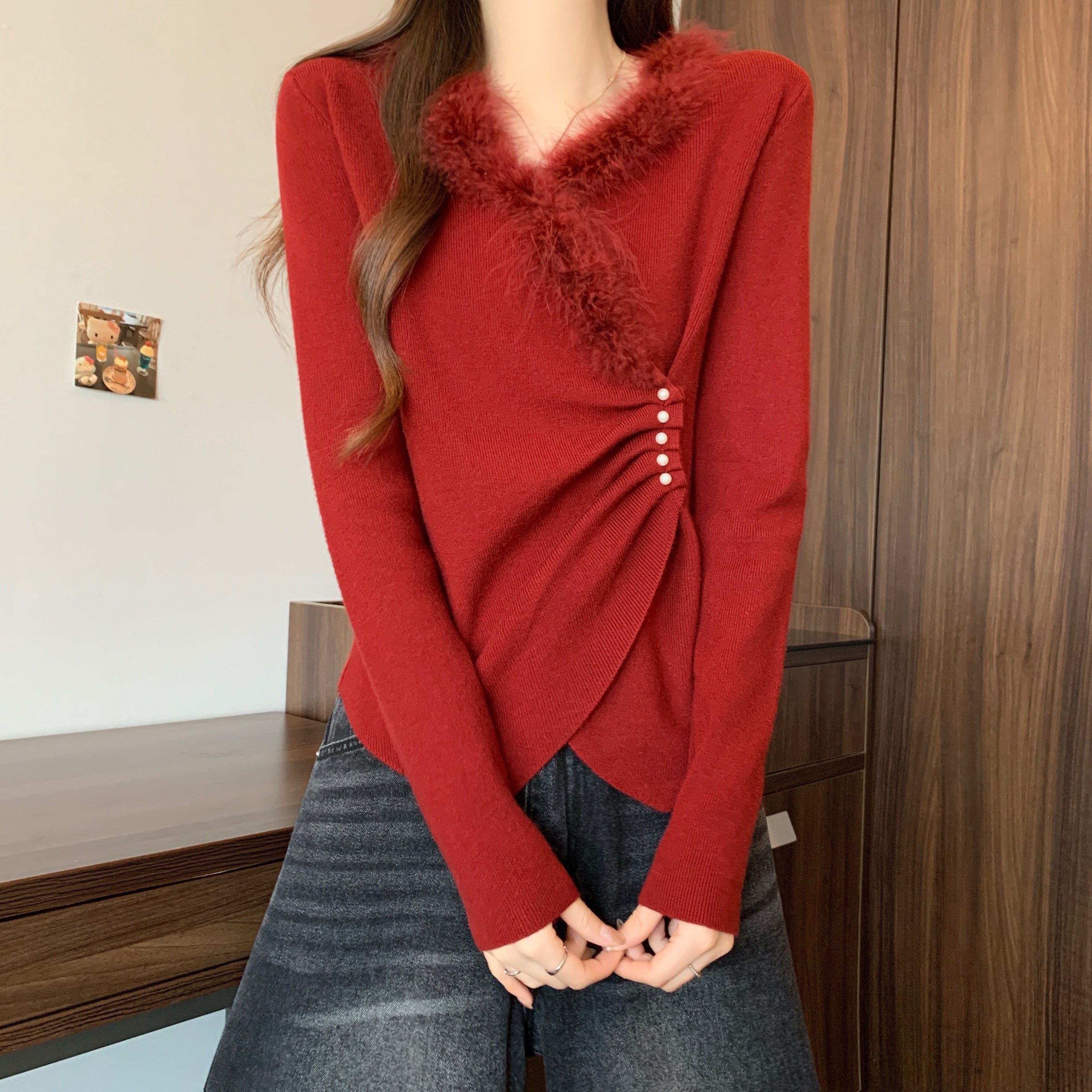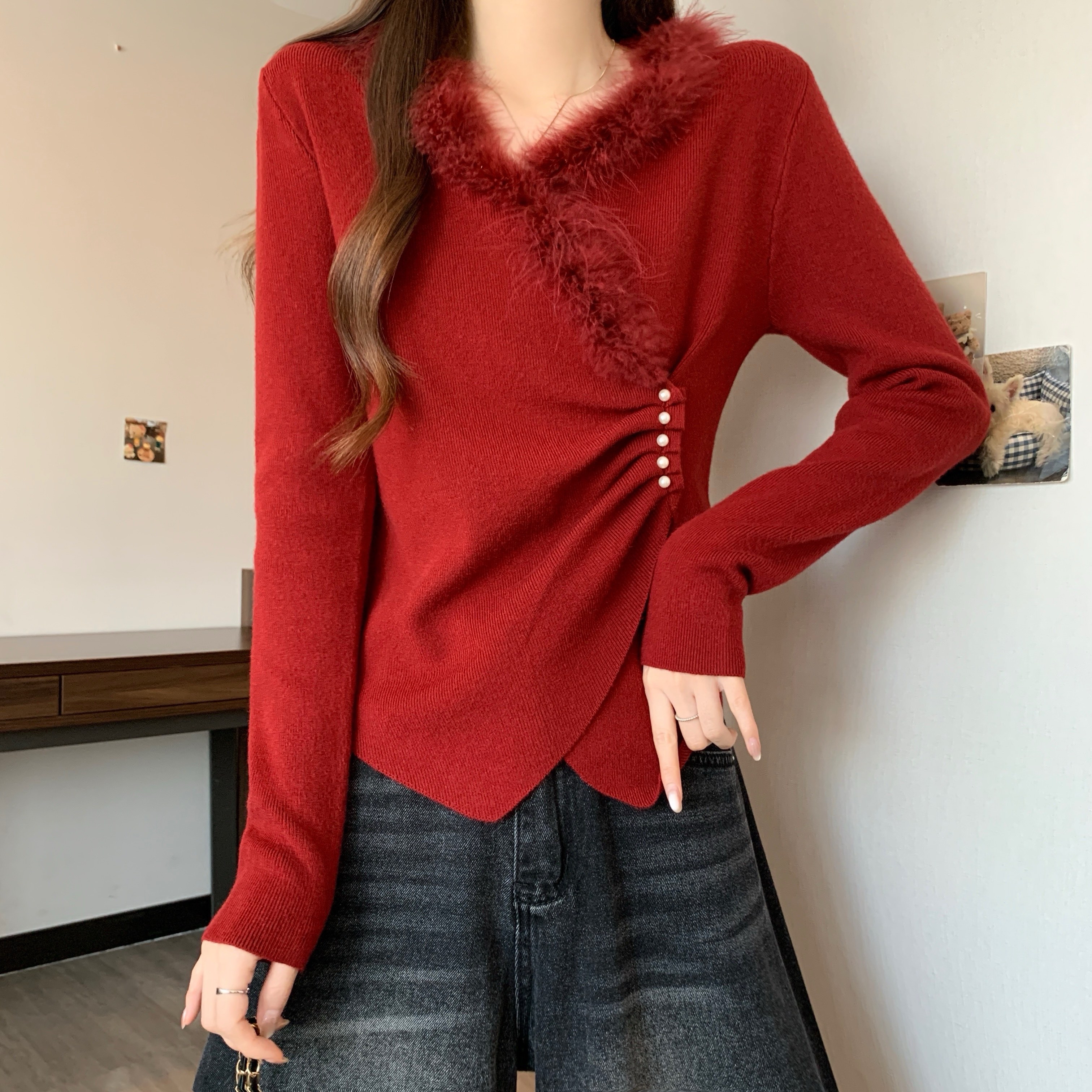FA51977# 大码秋冬V领毛衣内搭针织衫打底衫女胖MM兔毛高级感收腰上衣 服裝批發女裝批發服飾貨源