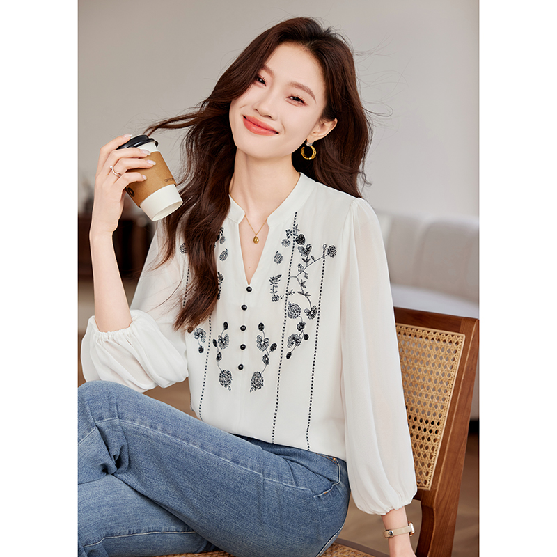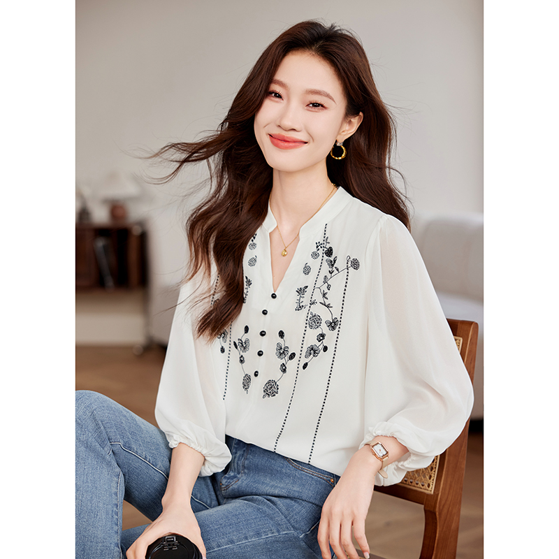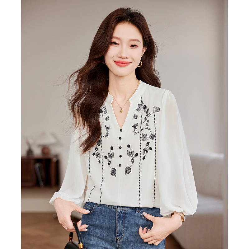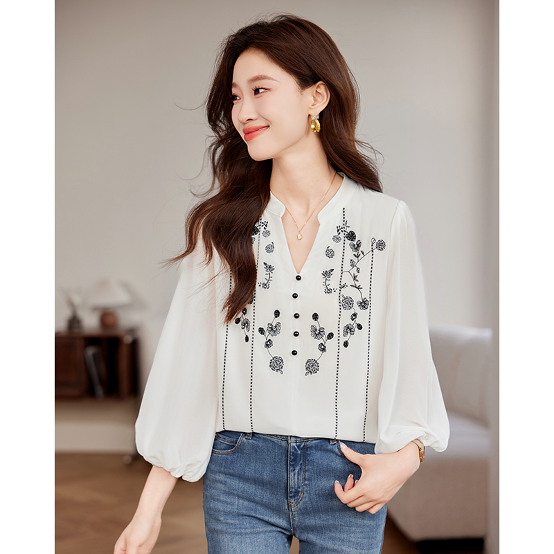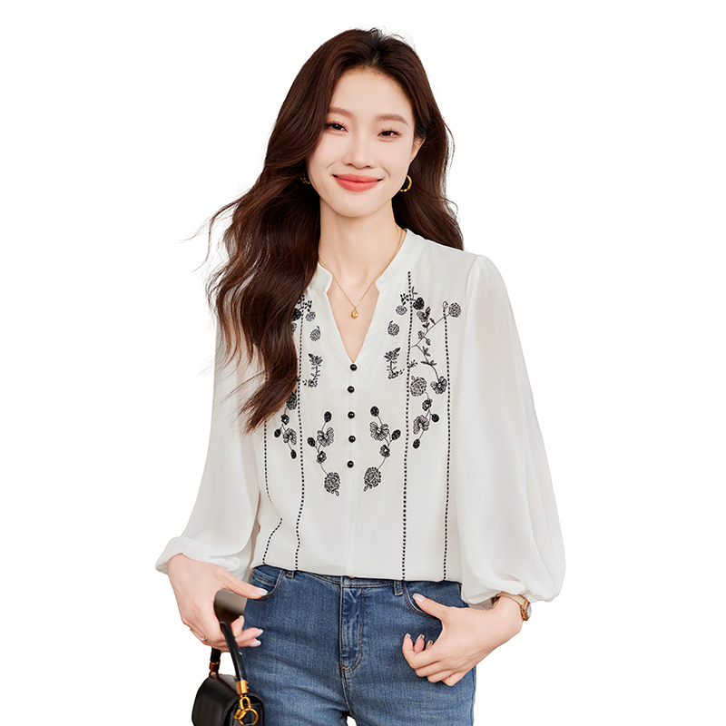 FA51984# 欧洲站春法式重工刺绣雪纺衫上衣女灯笼袖薄款打底衫V领衬衣 服裝批發女裝批發服飾貨源